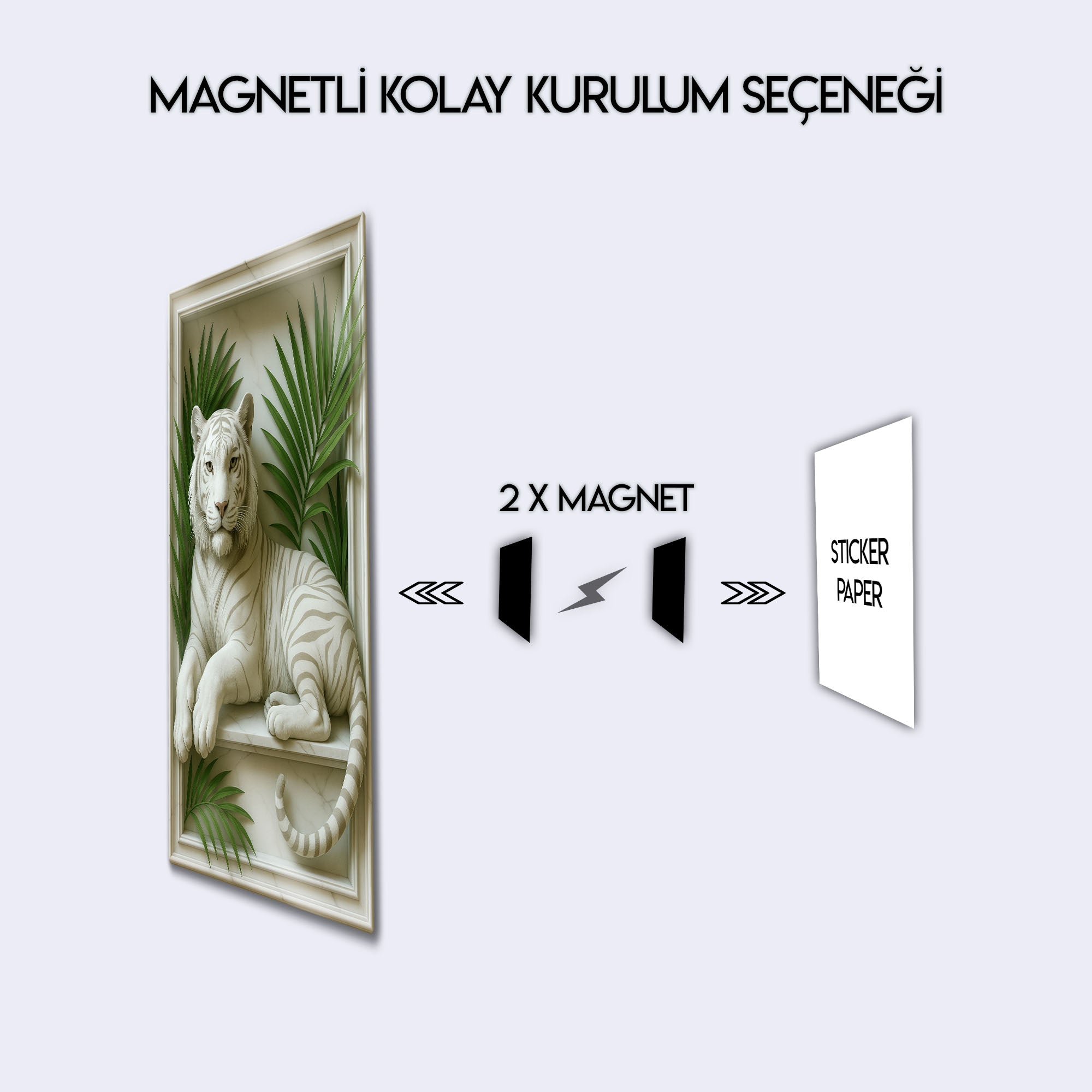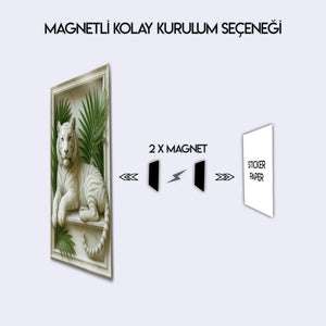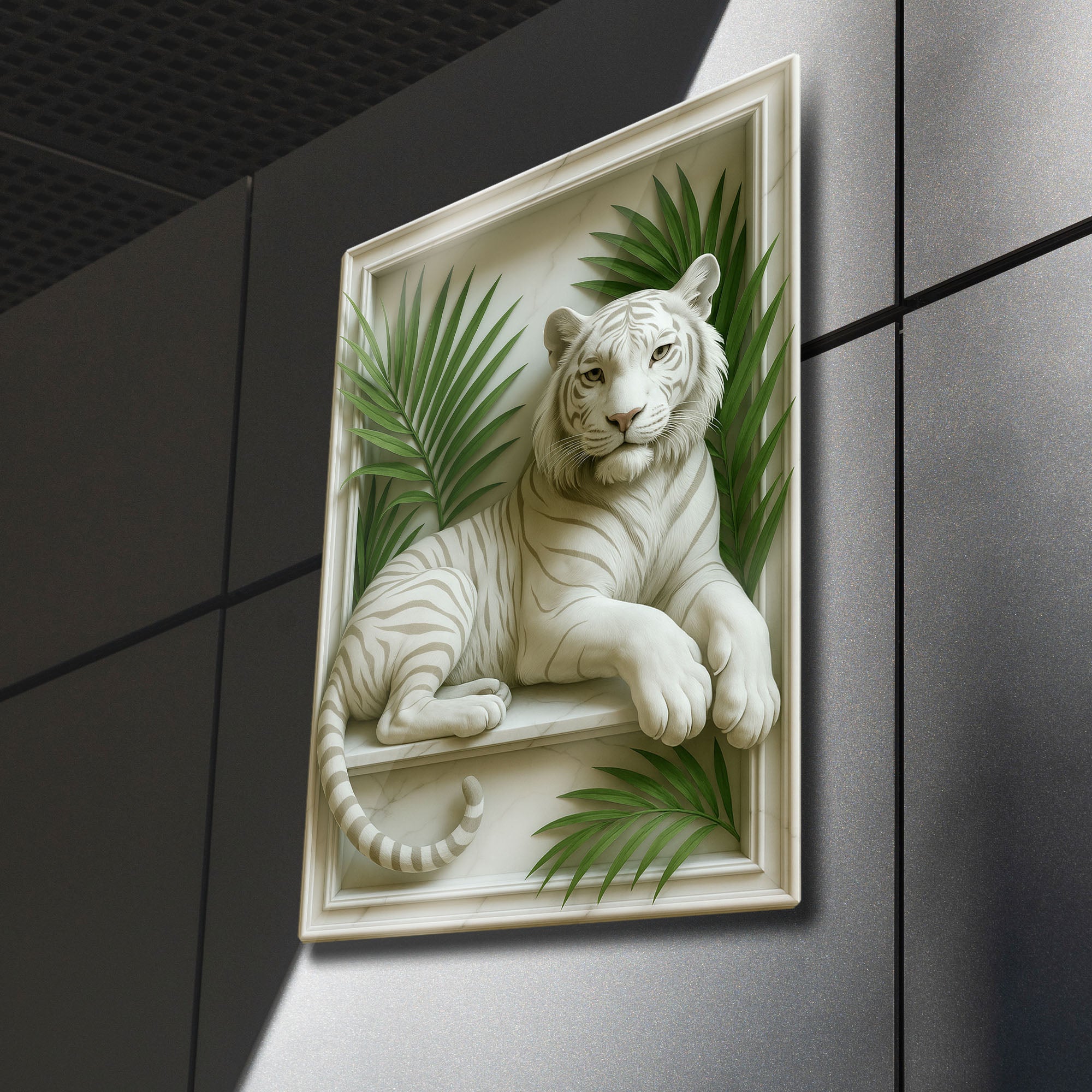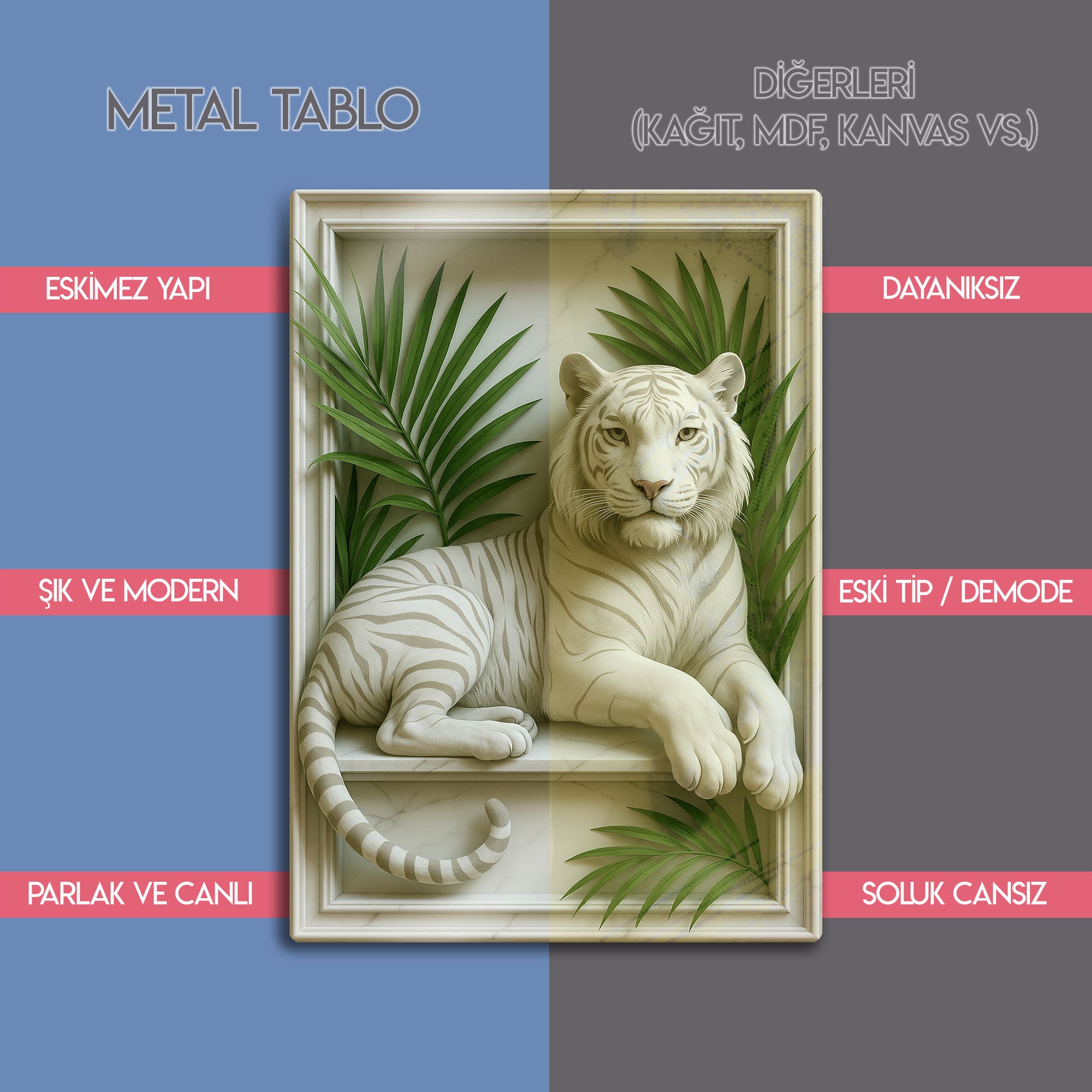 Vahşi doğanın asaleti, neoklasik sanatın zarafetiyle buluşuyor. Bu olağanüstü metal tablo, adeta mermerden yontulmuş gibi duran görkemli bir beyaz kaplanı, klasik bir çerçeve içerisinde ve tropik palmiye yaprakları eşliğinde sunuyor. Üç boyutlu rölyef (kabartma) hissi veren bu tasarım, duvarlarınıza inanılmaz bir derinlik ve sanatsal bir doku katıyor.