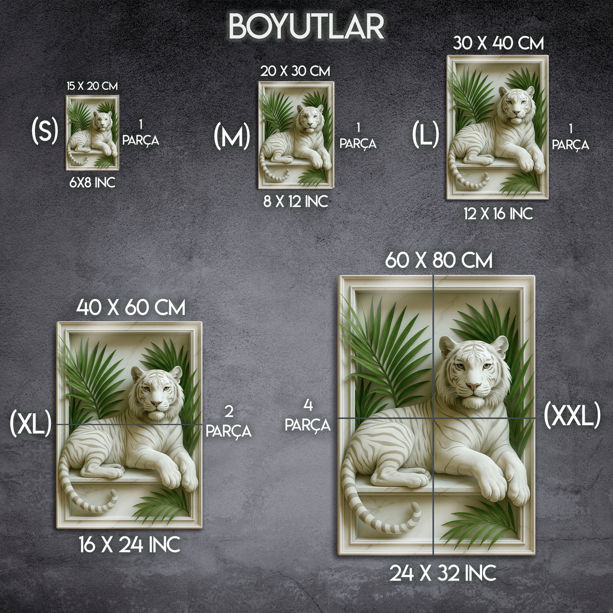S (15x20), M (20x30), L (30x40), XL (40x60) / 2 Parça, XXL (60x80) / 4 Parça |