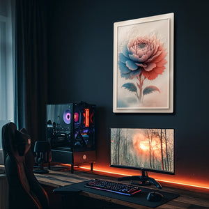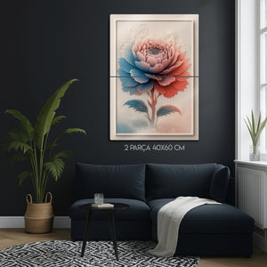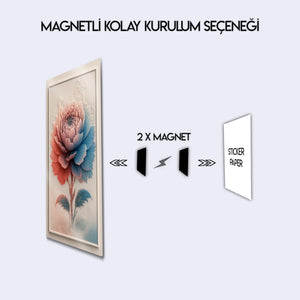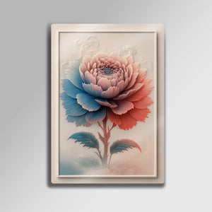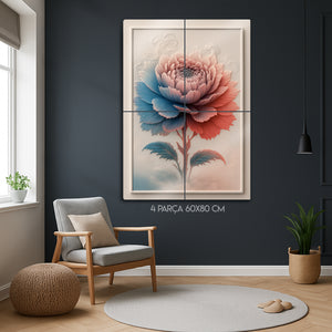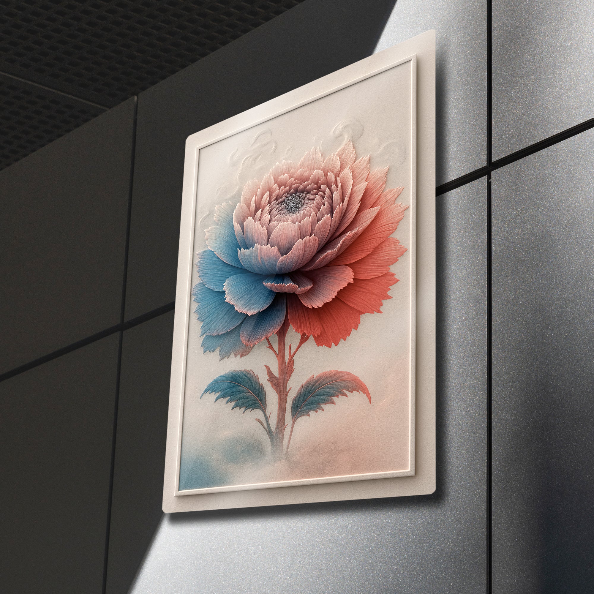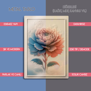 Sanatsal detaylarla işlenmiş, sisler arasından yükselen görkemli bir çiçeğin tasvir edildiği bu metal tablo, hem modern hem de mistik bir atmosfer yaratıyor. Pastel tonlardaki pembe ve mavi renk geçişleri, çiçeğe derinlik ve zarafet katıyor.