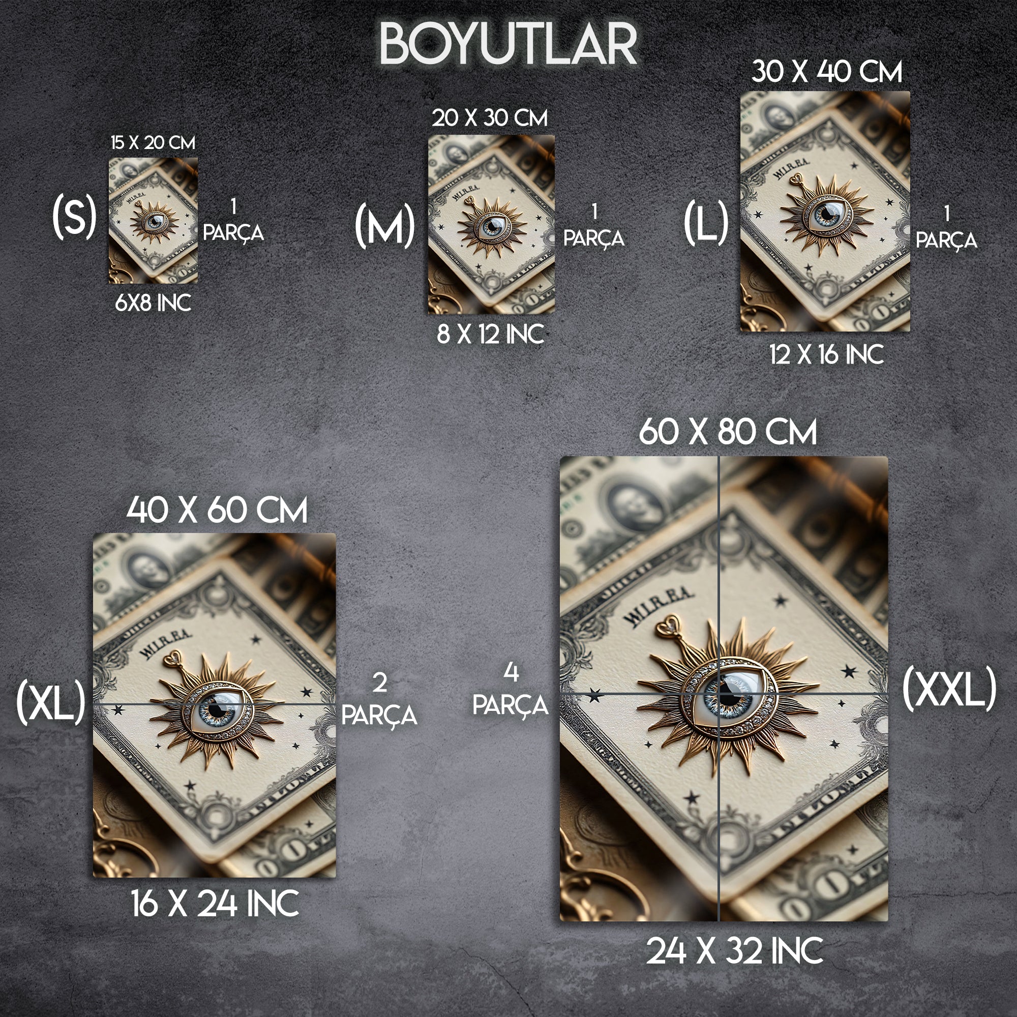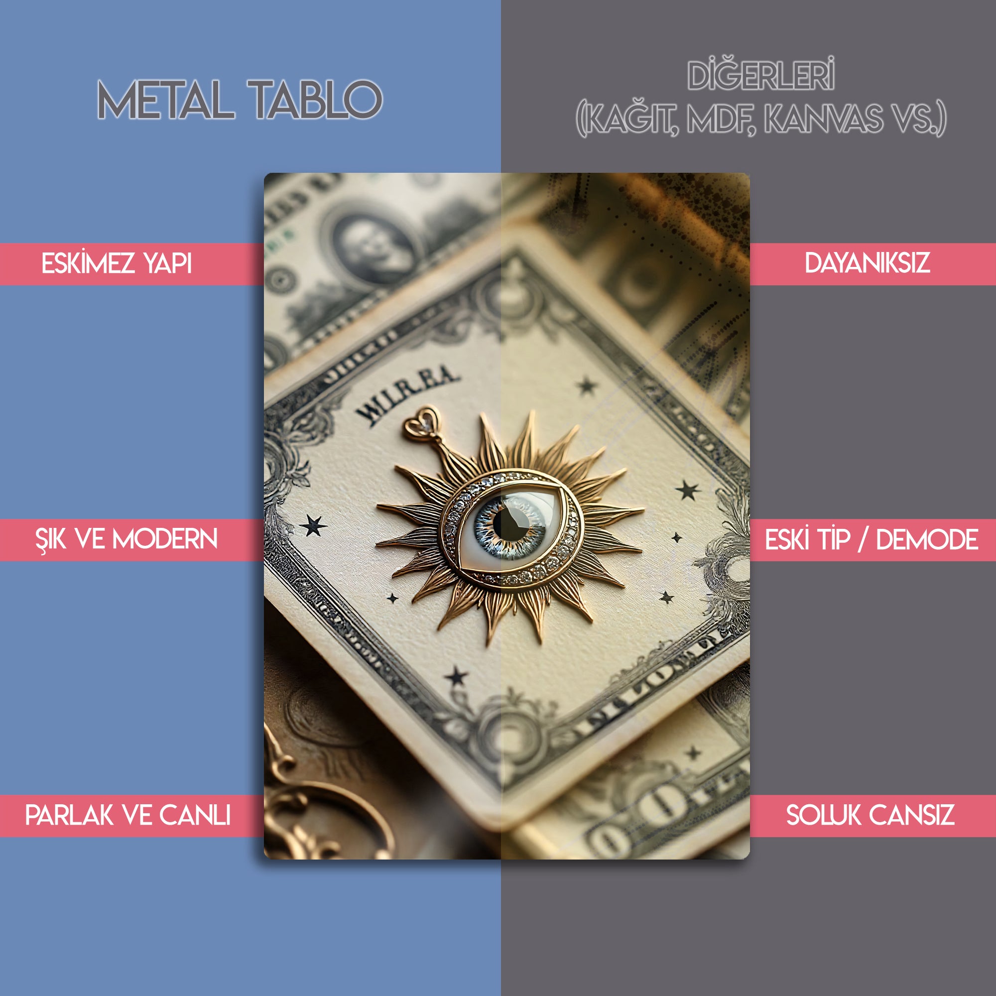 Gizem ve sembolizmin buluştuğu bu özel metal tablo, altın detaylı göz motifi ile dikkat çekiyor. Arka plandaki para deseni ve mistik tasarım, tabloya hem sanatsal hem de derin anlam katıyor. Spiritüel semboller, ezoterik tasarımlar ve mistik dekor sevenler için ideal bir seçimdir. Yüksek kaliteli metal baskısı sayesinde uzun yıllar dayanıklılığını ve parlaklığını korur. Ofis, oturma odası, kişisel çalışma alanı veya koleksiyon köşeleri için benzersiz bir dekoratif parçadır.