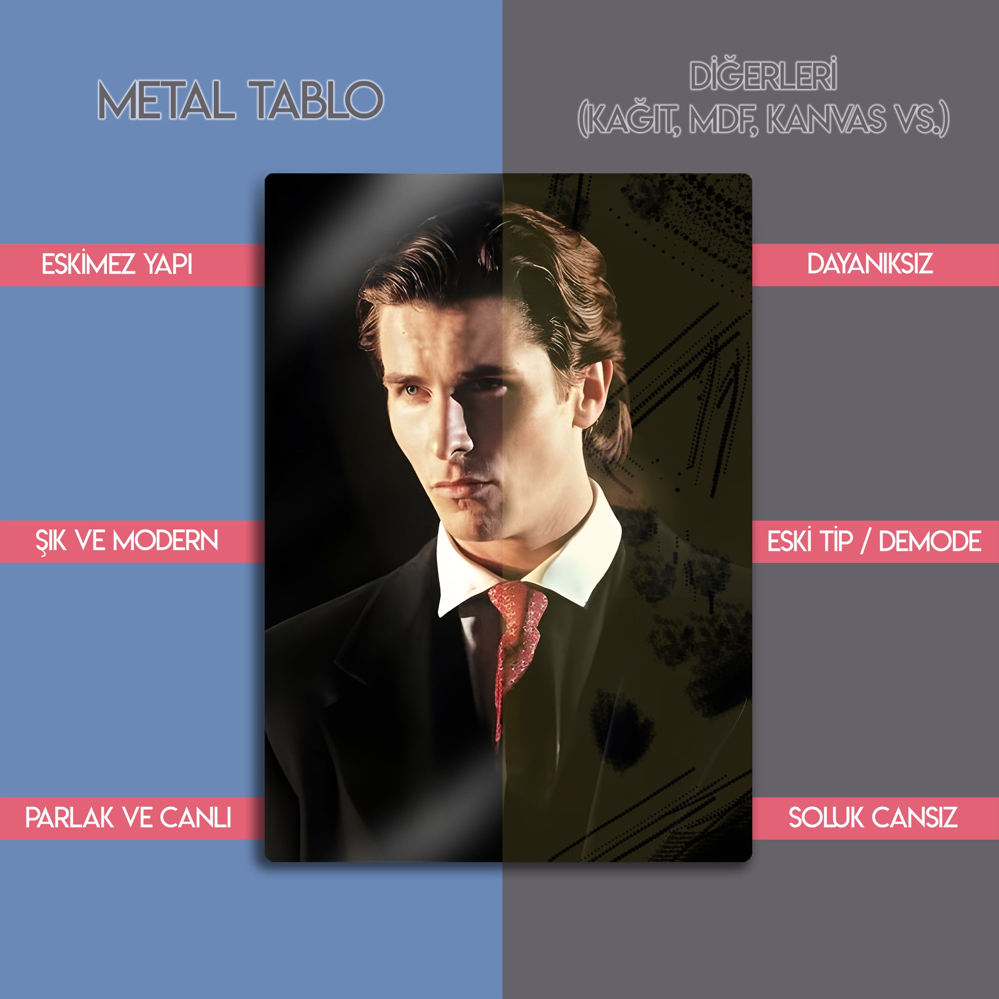 Bu özel Patrick Bateman metal tablo, hem film tutkunları hem de popüler kültür koleksiyonerleri için eşsiz bir dekoratif üründür.