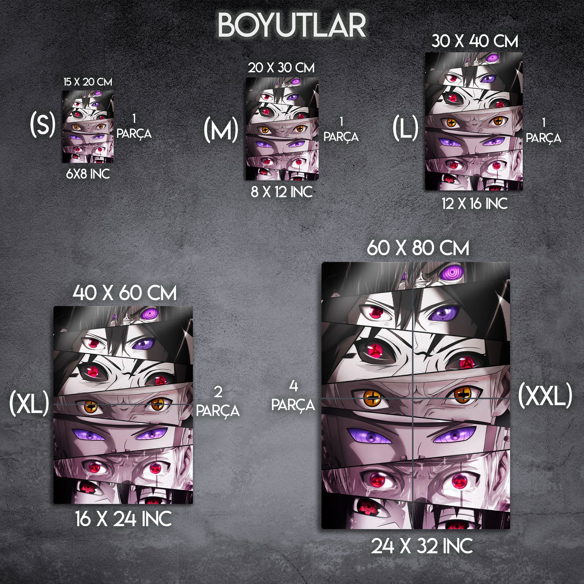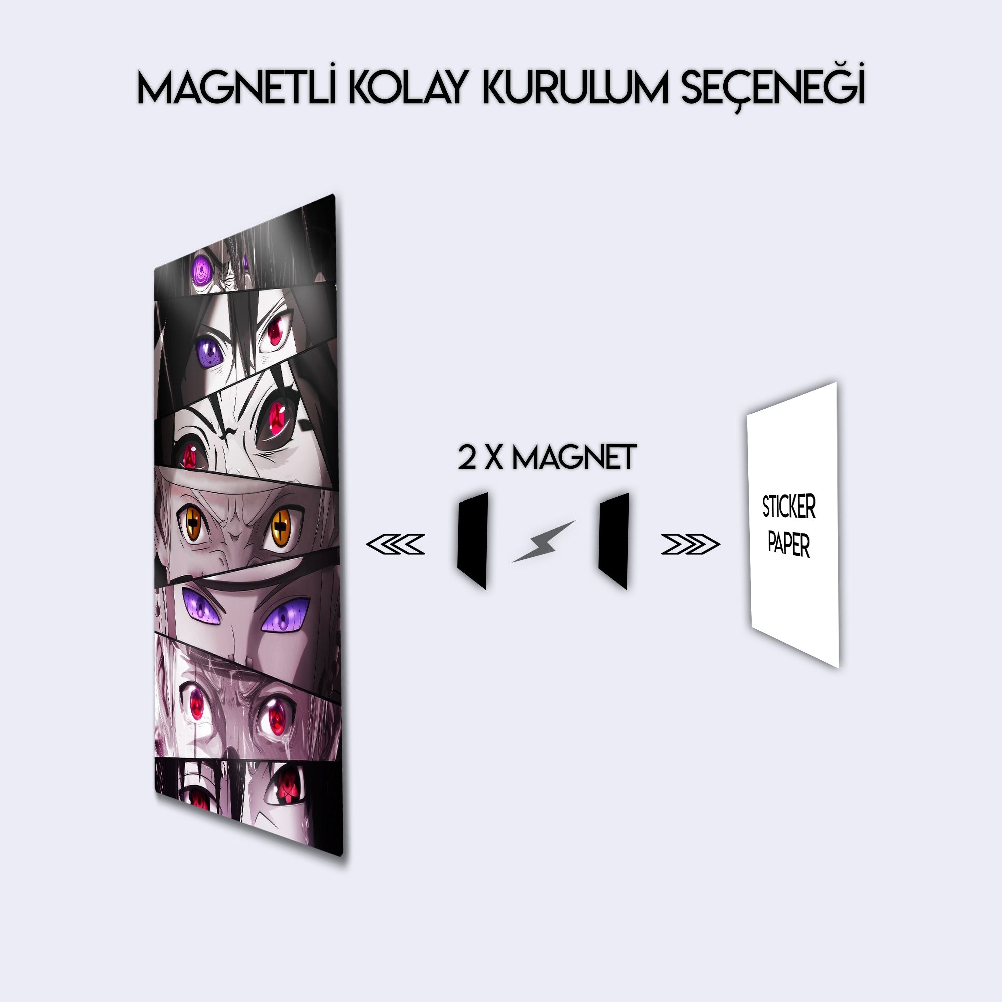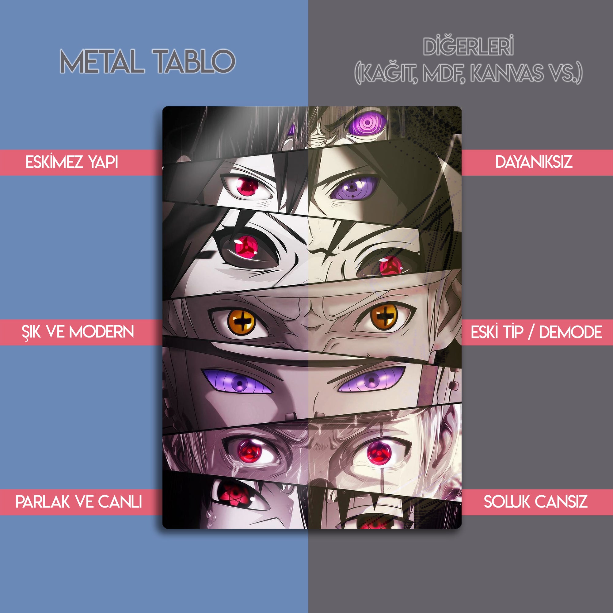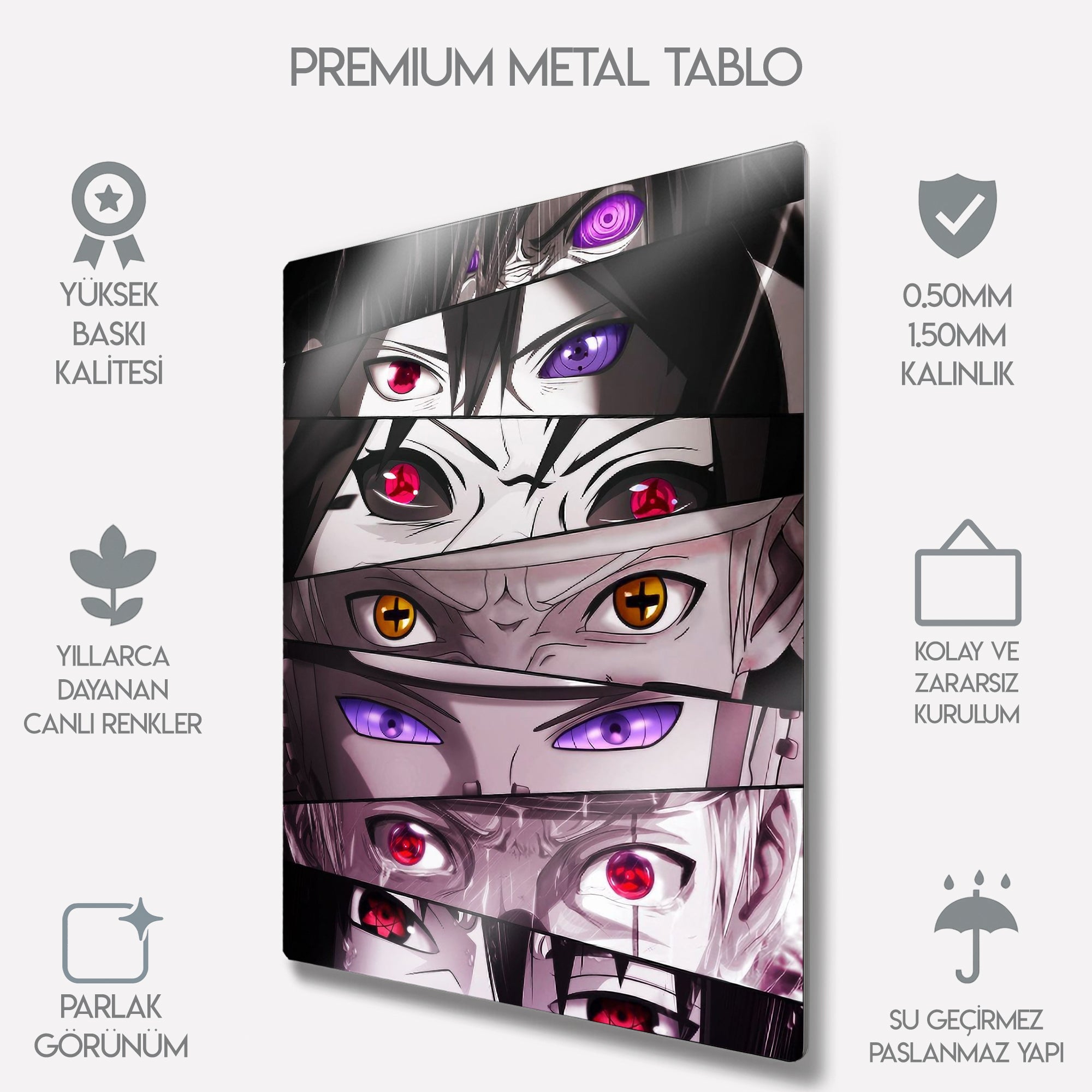 Anime dünyasının en güçlü karakterlerinden esinlenen bu metal tablo, ikonik göz tasarımları (Sharingan, Rinnegan ve diğer özel göz güçleri) ile hazırlanmıştır. Detaylı çizimleri ve dikkat çekici renk kontrastıyla otaku koleksiyonlarının vazgeçilmez parçası olmaya adaydır.