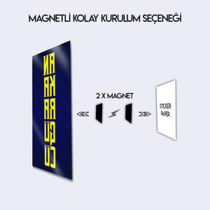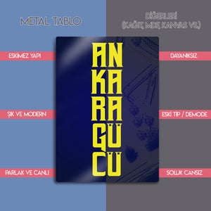 Ankaragücü tutkusunu ve sarı-lacivert renklerin coşkusunu duvarlarınıza taşıyan bu metal tablo, taraftar ruhunu evinize ve ofisinize yansıtıyor. Minimalist tipografi tasarımı ile modern bir görünüm sunan tablo, güçlü renk kontrastıyla bulunduğu mekâna enerji katıyor.