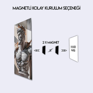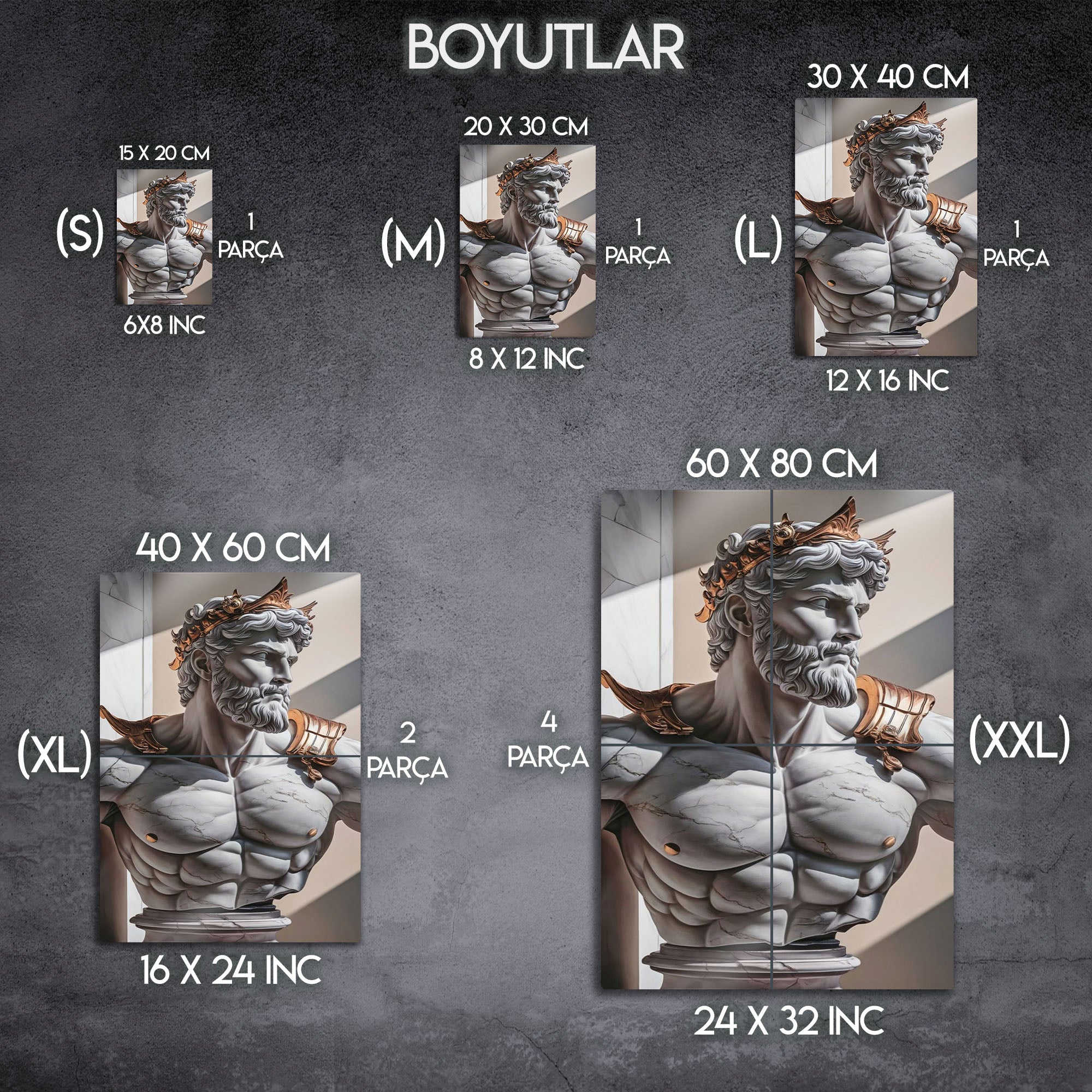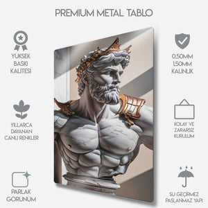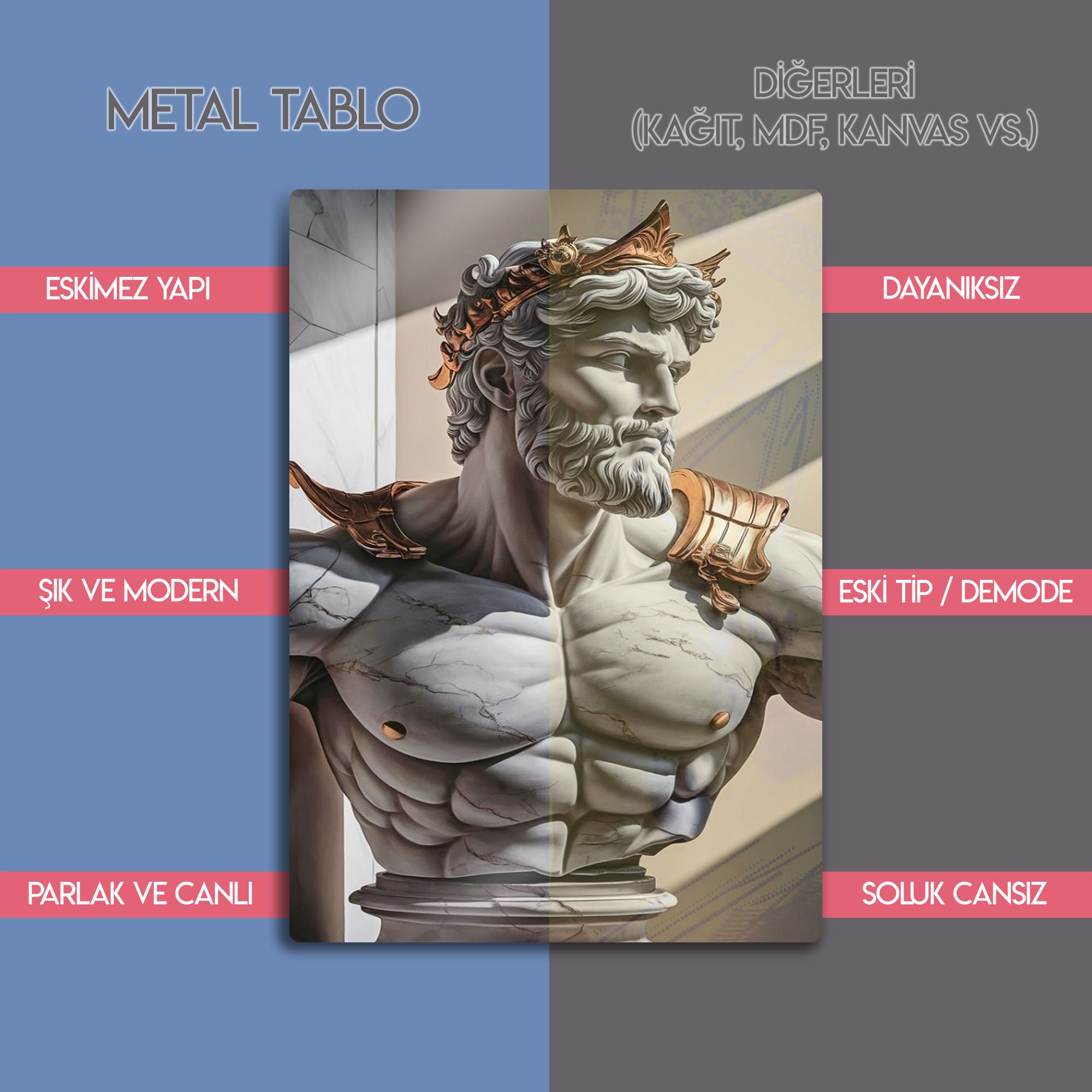 Mitolojik ihtişamı modern dekorla buluşturan bu Zeus figürlü metal tablo, antik Yunan estetiğini evinize taşıyor. Mermer görünümlü detaylar ve altın tonlarıyla süslenmiş taç, tabloya hem klasik hem de lüks bir hava katıyor. Salon, ofis, çalışma odası veya koleksiyon köşeleri için mükemmel bir dekoratif parçadır. Dayanıklı metal baskı tekniği sayesinde uzun ömürlüdür ve her ortama farklı bir karakter kazandırır. Mitoloji severler, sanat tutkunları ve klasik tasarımları sevenler için ideal bir hediye seçeneğidir.
