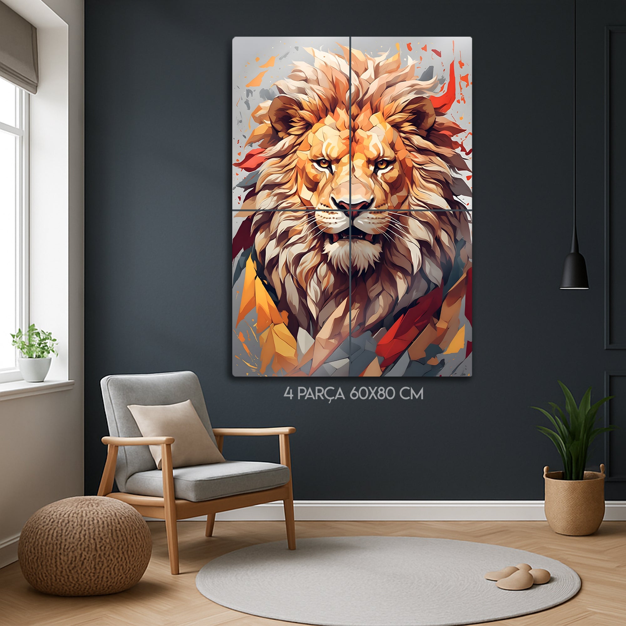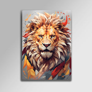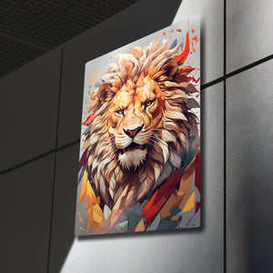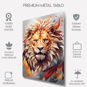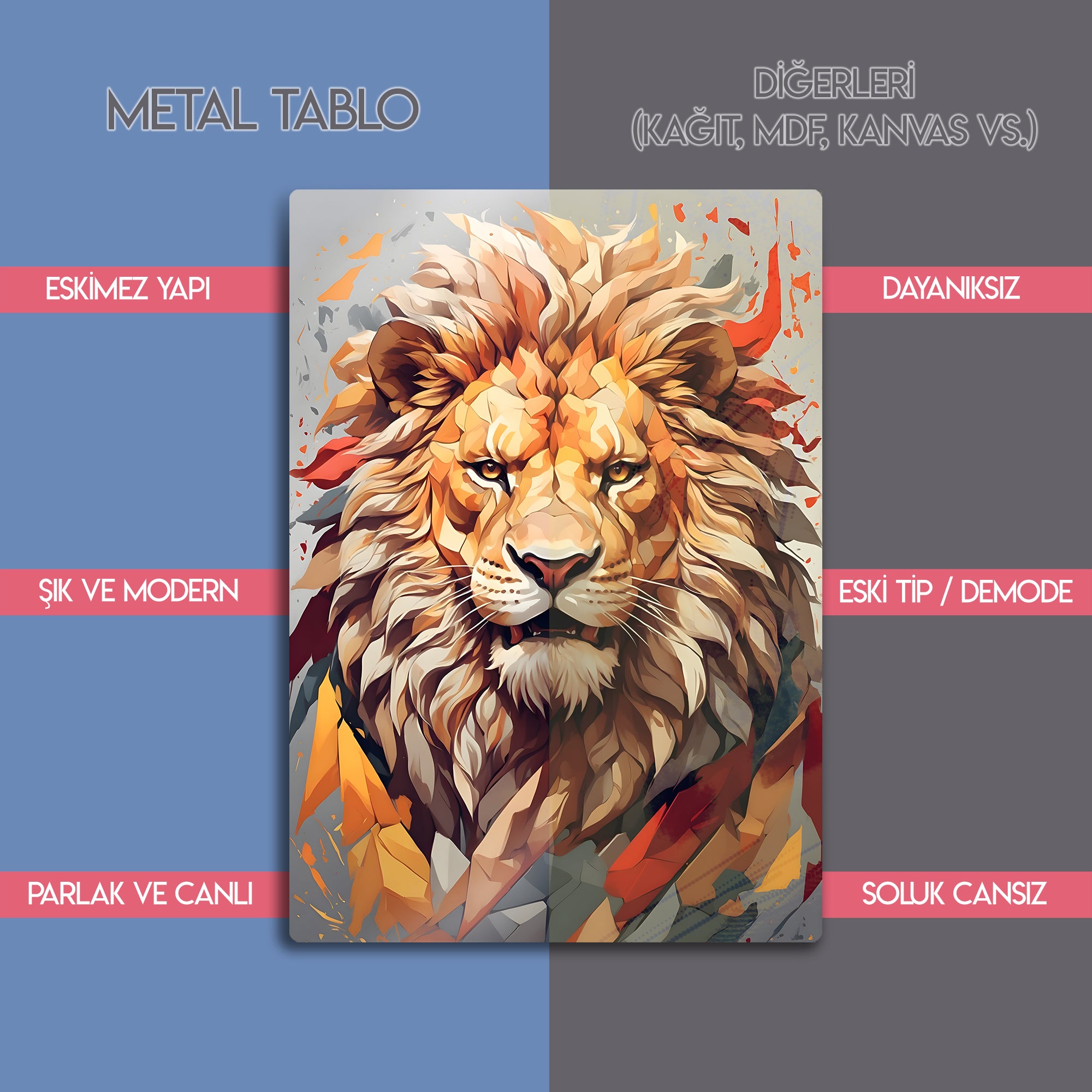 Bu eser, sadece bir hayvan portresi değil, aynı zamanda liderliğin, gücün ve modern estetiğin bir kutlamasıdır. Her bir renk bloğu ve keskin hat, aslanın o asil ve sarsılmaz duruşunu daha da güçlendirir. Metalin modern dokusu, bu sanatsal tasarımın her bir çizgisini, rengini ve enerjisini mükemmel bir şekilde öne çıkarır.