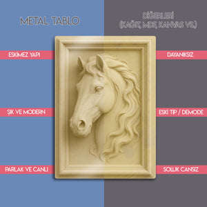 Özgürlüğün, zarafetin ve gücün simgesi At Figürlü 3D Kabartma Metal Tablo, yaşam alanlarınıza sanatsal bir dokunuş kazandırıyor. Heykelsi kabartma tasarımıyla gerçekçi bir görünüme sahip olan bu tablo, estetik detaylarıyla dikkat çekiyor.