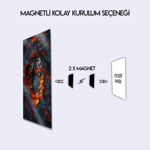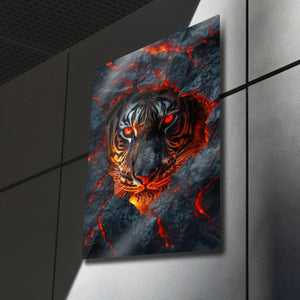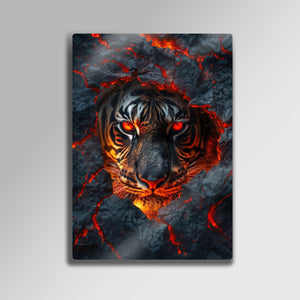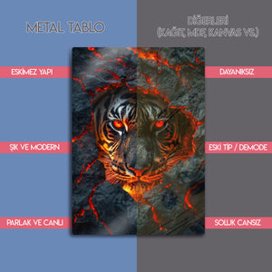 Doğanın dizginlenemez öfkesi ve vahşi gücü duvarlarınızda hayat buluyor! Bu olağanüstü metal tablo, adeta bir volkandan doğarcasına, kor halindeki kayaları parçalayarak çıkan bir kaplanın hipnotize edici portresini sunuyor. Ateş gibi parlayan kırmızı gözleri ve içten gelen gücüyle bu eser, her bakışta sizi etkisi altına alacak.