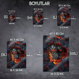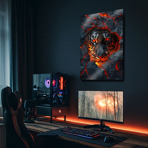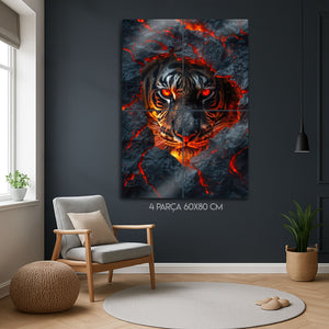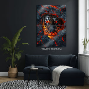 Yüksek çözünürlüklü dijital sanatın en çarpıcı örneklerinden biri olan bu tablo, lavların ve çatlayan kayaların 3 boyutlu dokusunu, kaplanın yoğun ifadesiyle birleştiriyor. Bu cesur ve güçlü sanat eseri, oyun odaları, "man cave"ler, modern salonlar veya ofisler gibi mekanlara anında epik bir atmosfer ve adrenalin dolu bir enerji katmak için tasarlanmıştır.