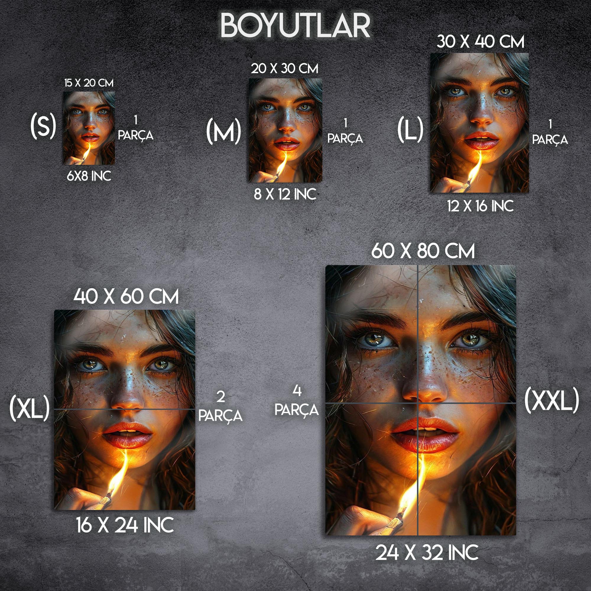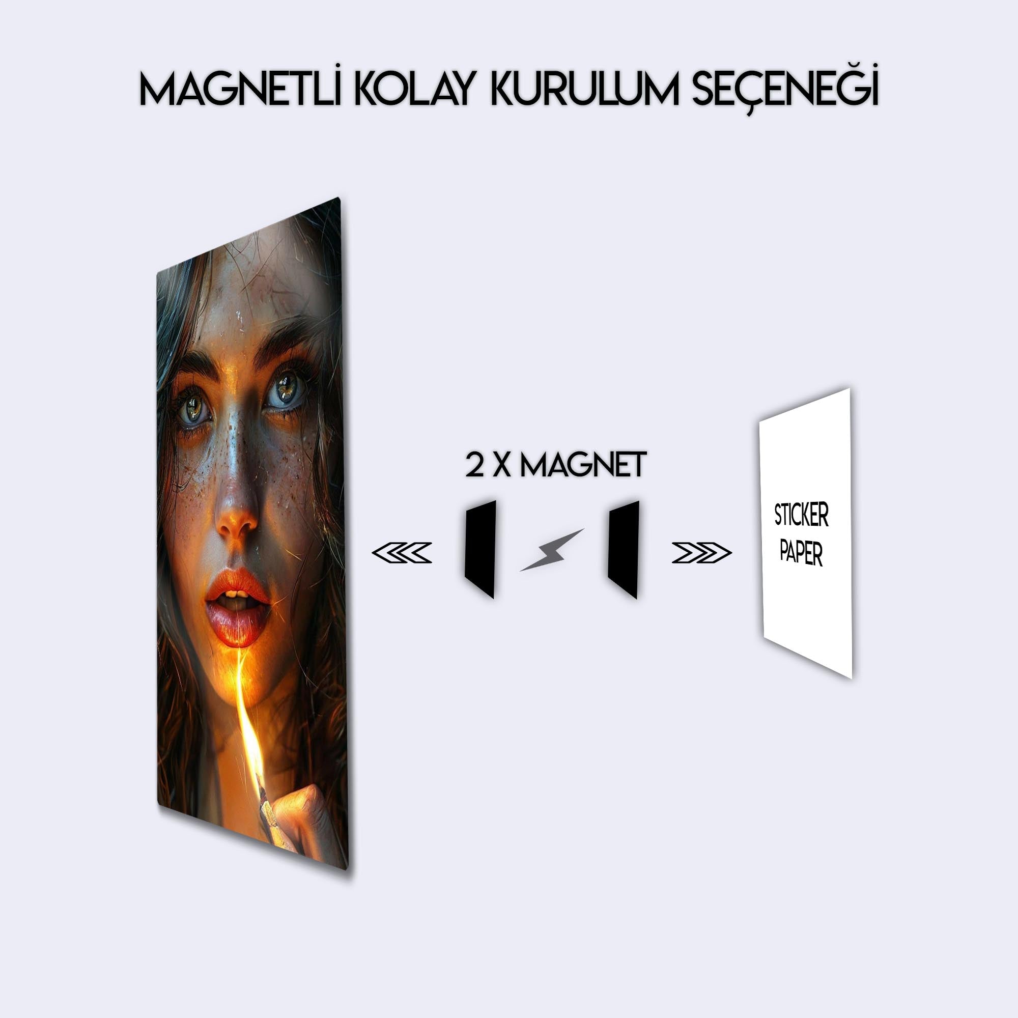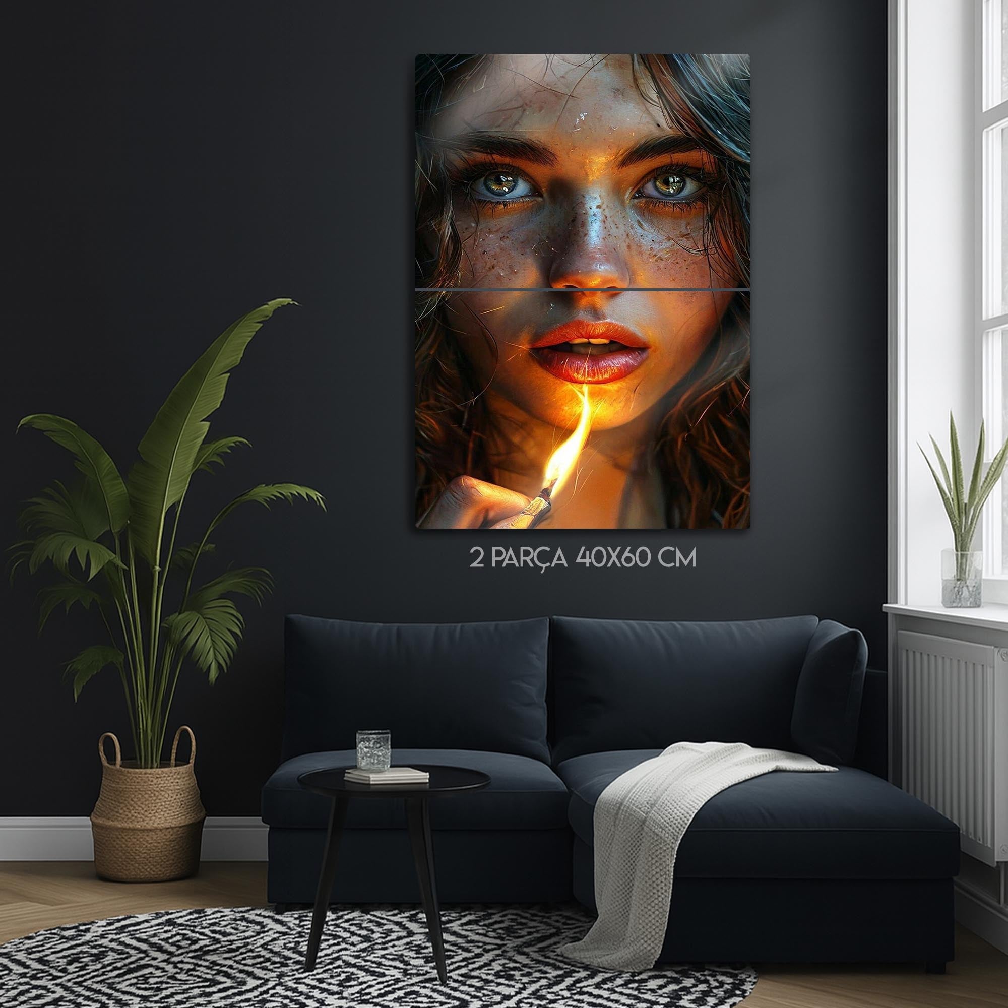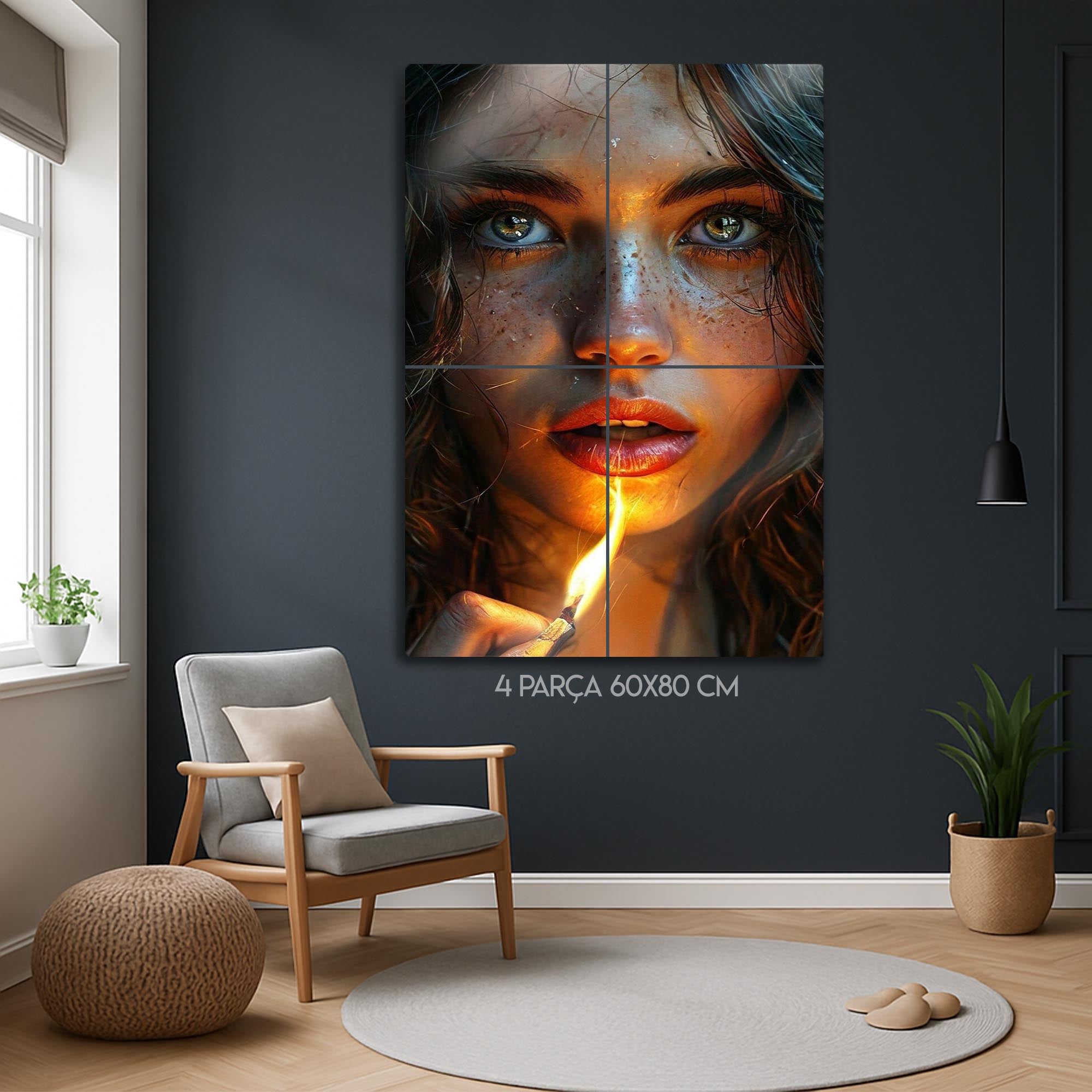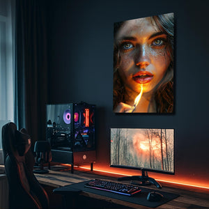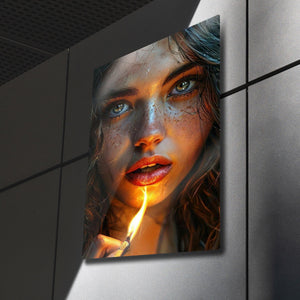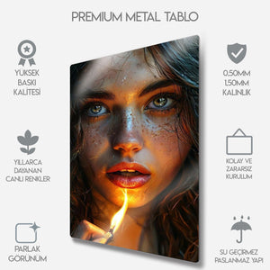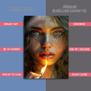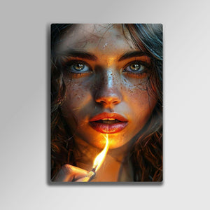 Gözlerindeki kıvılcım, bir kibrit alevinde hayat buluyor... Bu çarpıcı ve hiper-realist metal tablo, bir anın sıcaklığını, gizemini ve ham güzelliğini donduruyor. Tek bir kibrit alevinin yarattığı dramatik ışıkla aydınlanan bu büyüleyici kadın portresi, her detayıyla sizi içine çekecek.