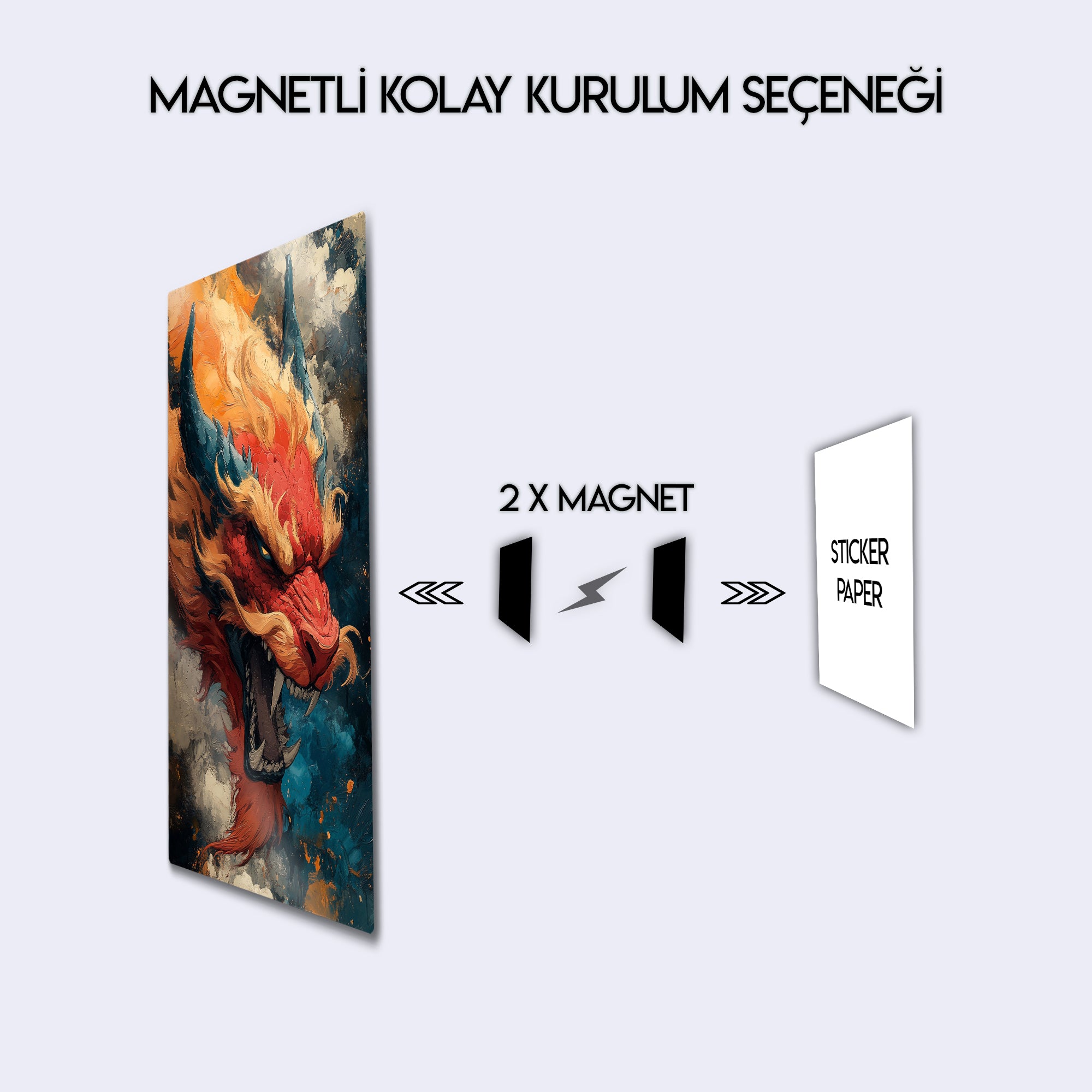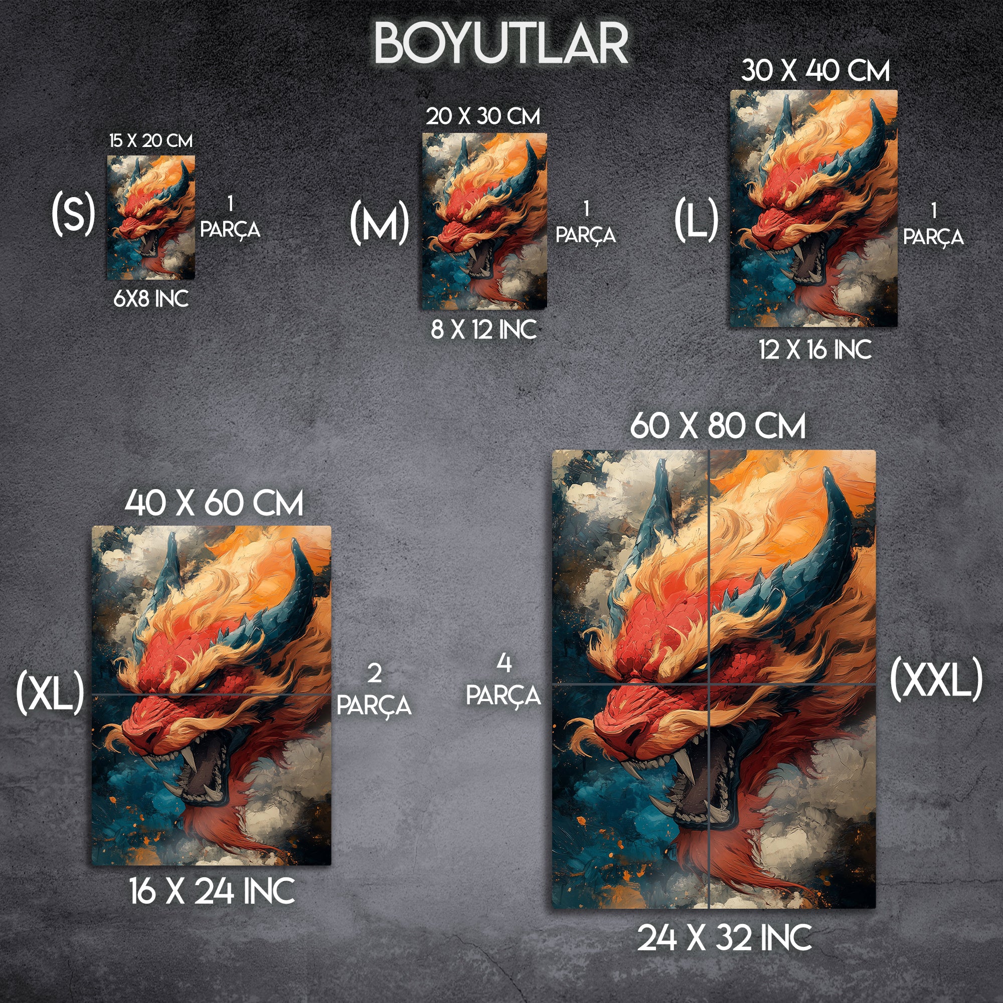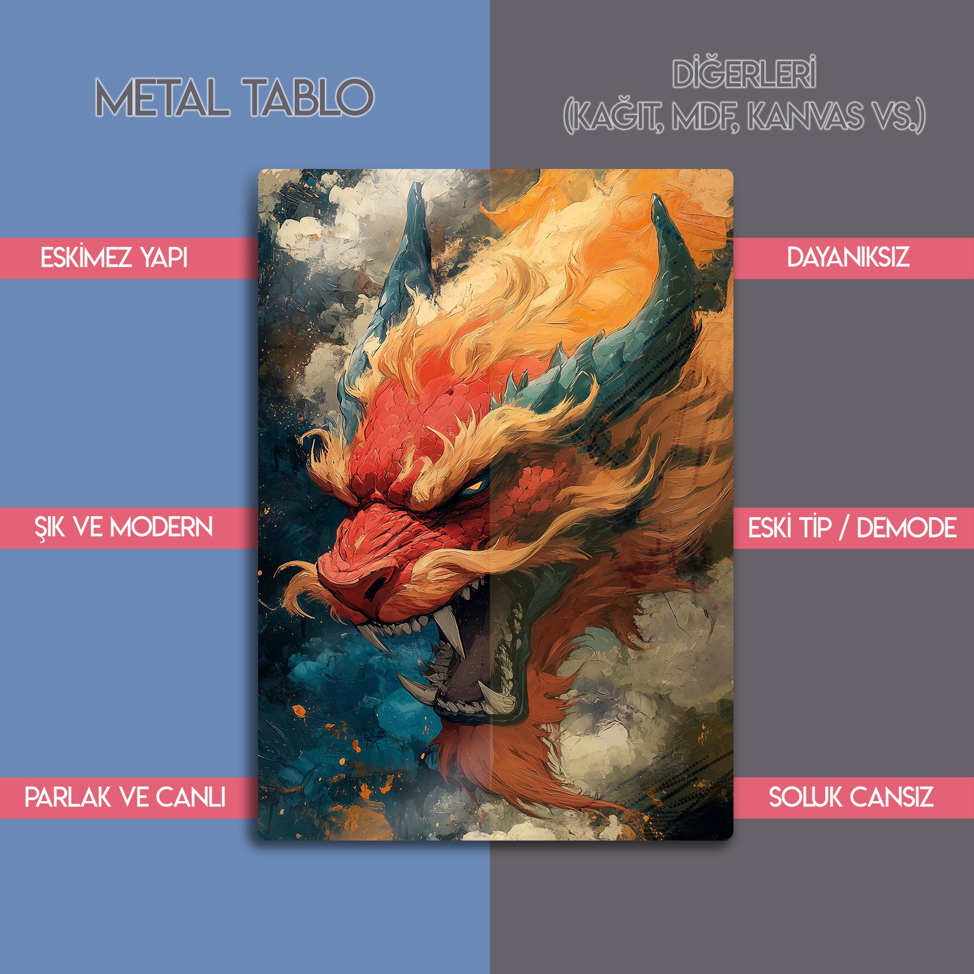 Kuvvet ve kudreti simgeleyen bu metal tablo, alevler içinde betimlenen görkemli ejderha figürüyle dikkat çekiyor. Canlı renkleri ve detaylı tasarımıyla öne çıkan bu eser, hem mitolojik bir dokunuş hem de modern bir dekoratif etki sunar. Ev, ofis veya özel koleksiyonlar için ideal olan bu tablo, dayanıklı metal yüzeyi sayesinde uzun ömürlüdür. Gücü, tutkuyu ve özgürlüğü temsil eden bir sanat eseri arıyorsanız, bu tablo tam size göre.