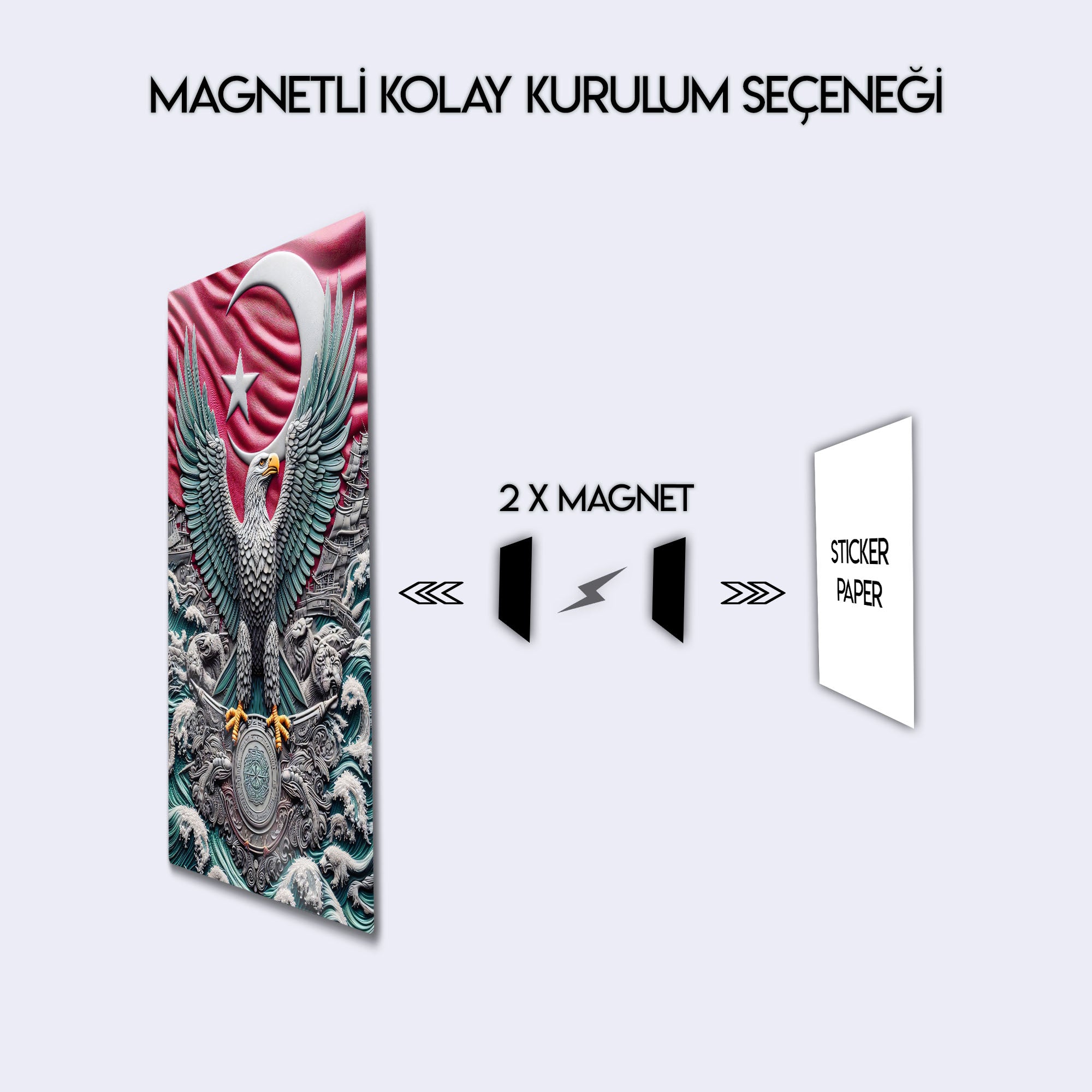 Tarihin şanını, milletin gücünü ve ataların mirasını duvarlarınıza taşıyın! Bu olağanüstü metal tablo, adeta bir anıttan yontulmuş gibi duran üç boyutlu detaylarıyla, Türk'ün sarsılmaz gücünü ve asaletini simgeliyor. Merkezde yer alan ve Selçuklu Devleti'nden bu yana gücün ve bilgeliğin sembolü olan görkemli kartal, şanlı Ay Yıldızlı bayrağımızın gölgesinde kanat açıyor.