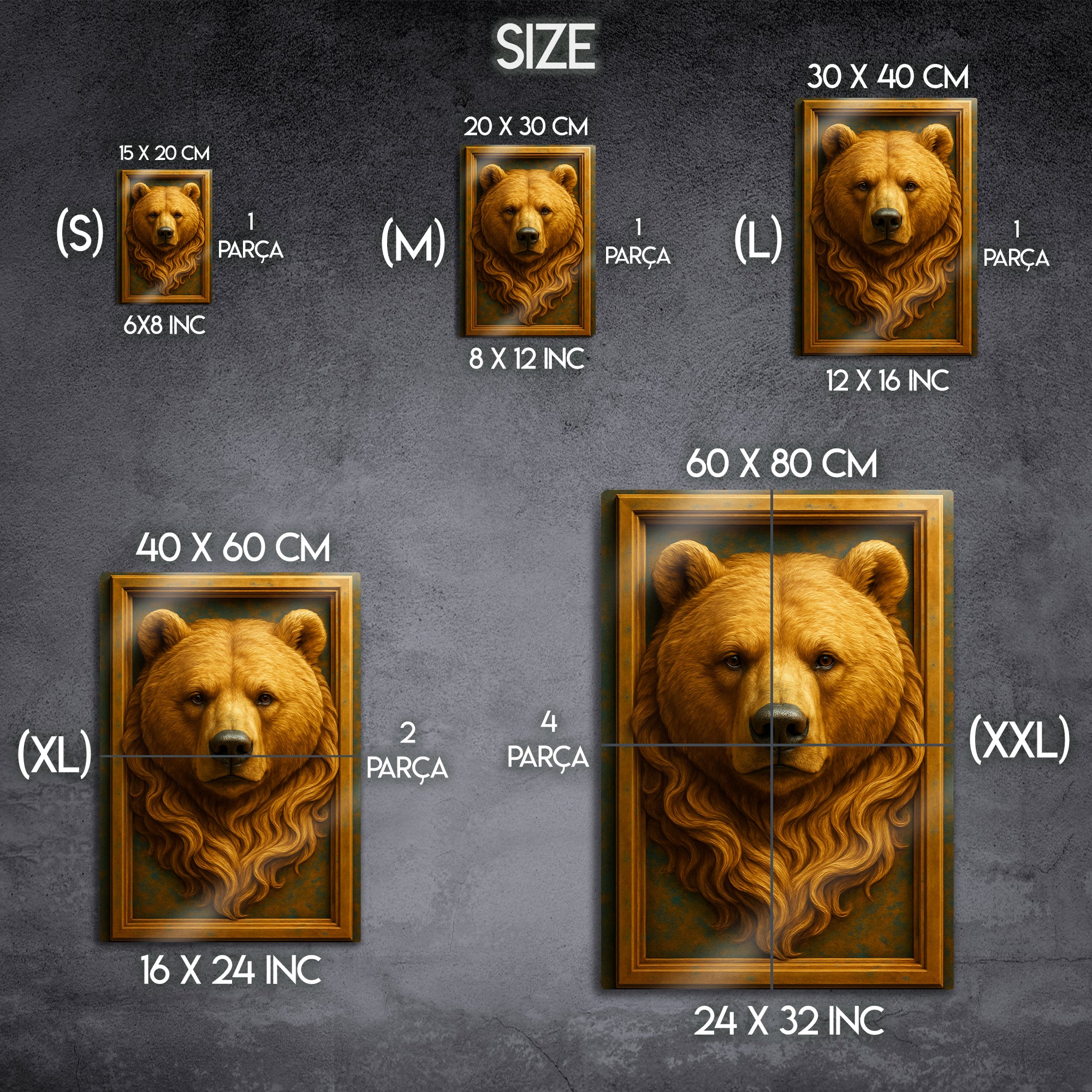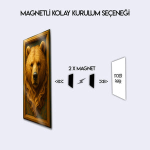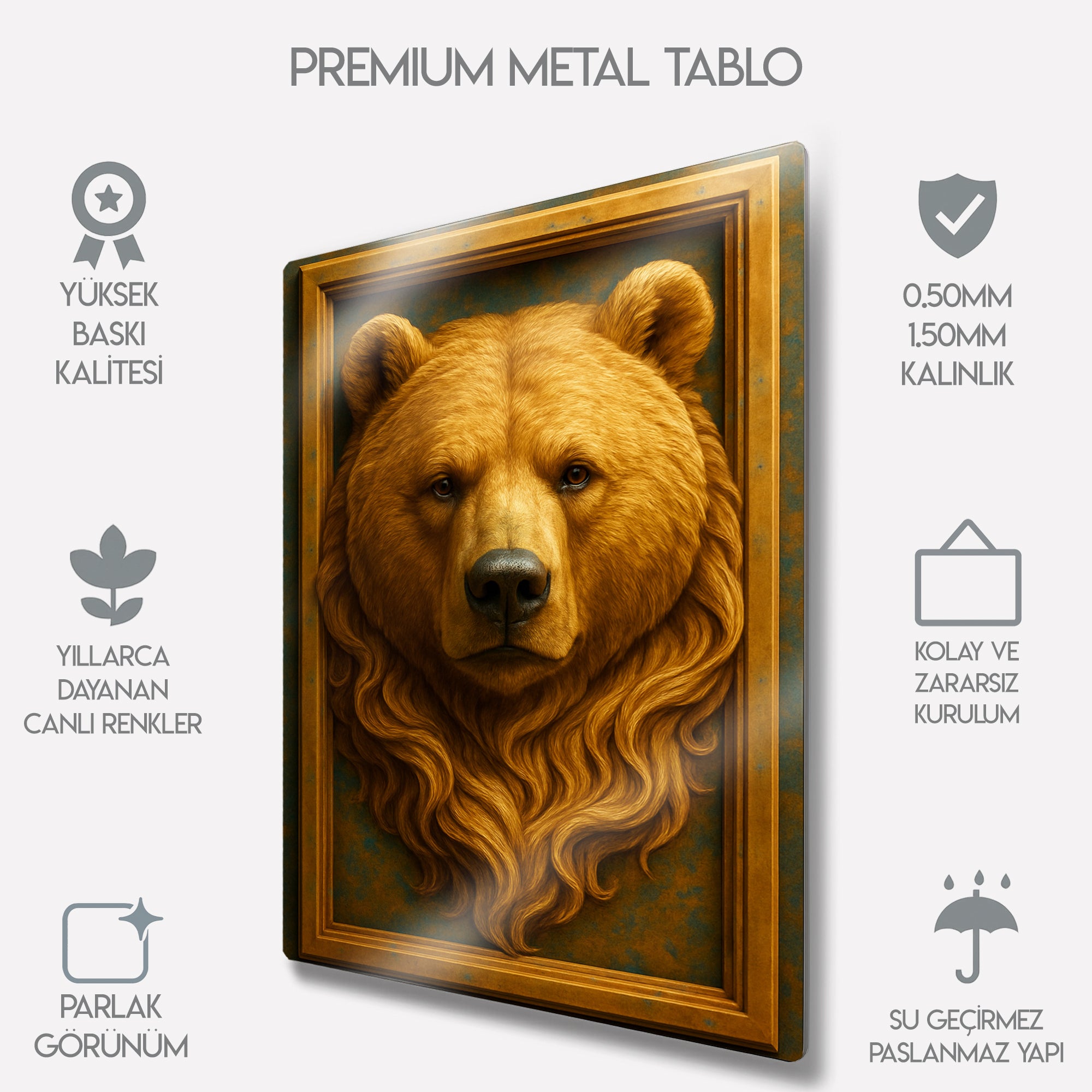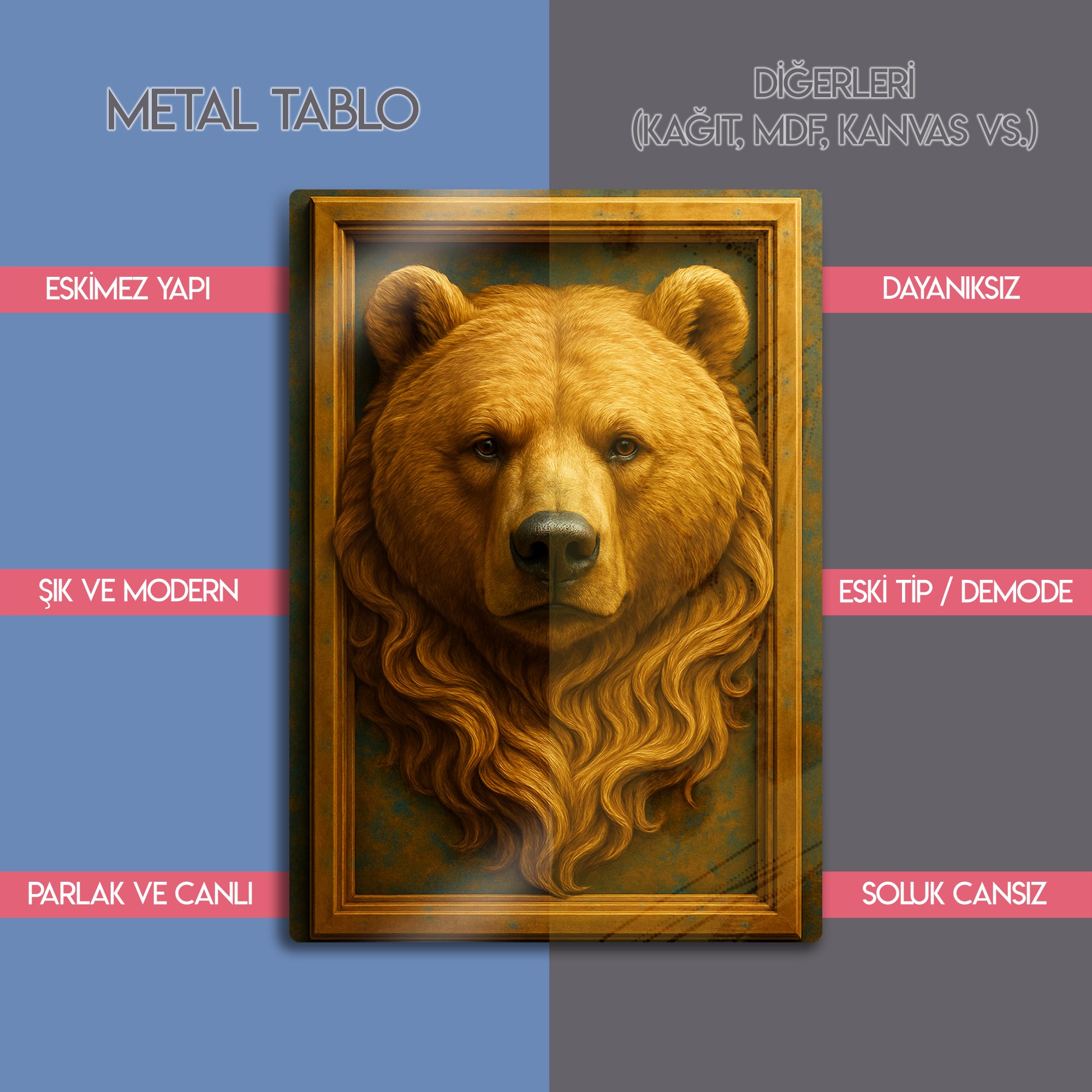 Dayanıklı metal malzeme üzerine özel baskı teknolojisiyle üretilen tablo, uzun yıllar dayanıklılığını korur. Salon, ofis, çalışma odası veya rustik dekorasyon tarzına sahip mekanlarda doğal bir şıklık oluşturur. Ayının temsil ettiği güç ve koruyuculuk, dekorasyonunuza sadece görsel değil, anlamlı bir değer de katar.