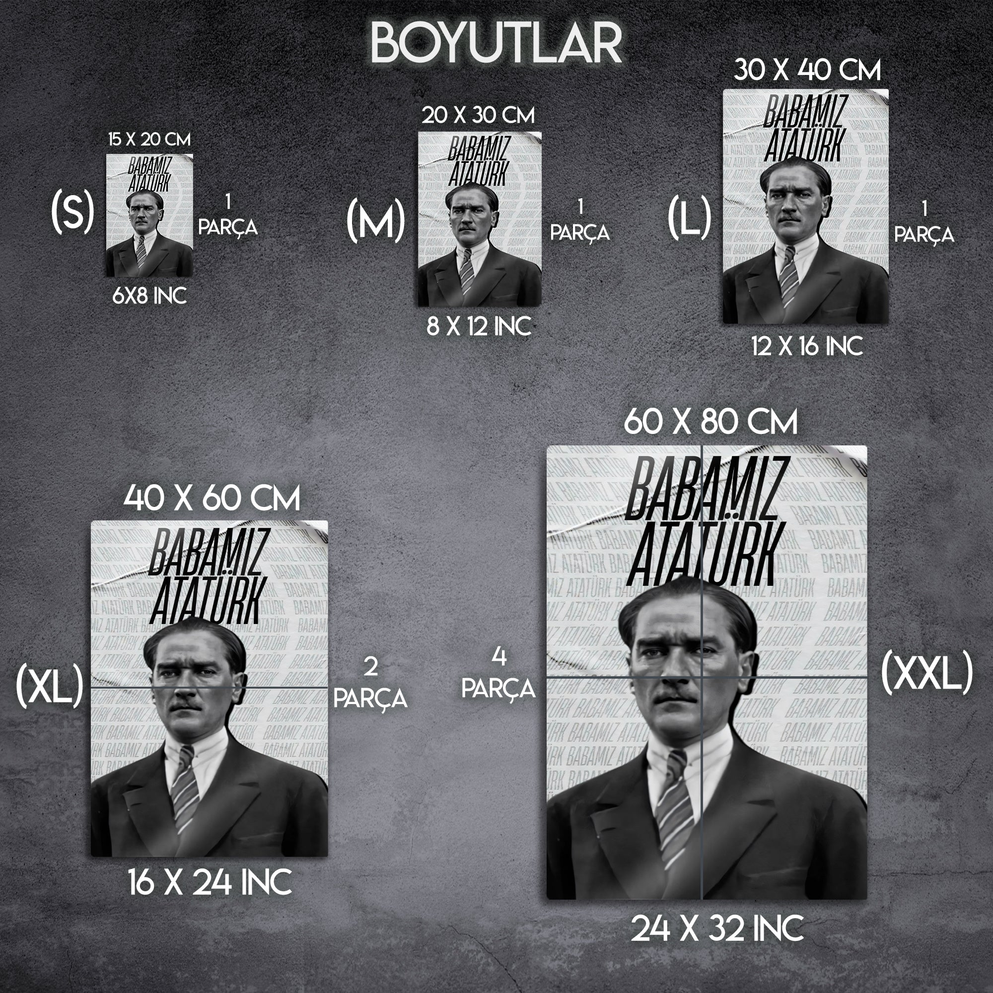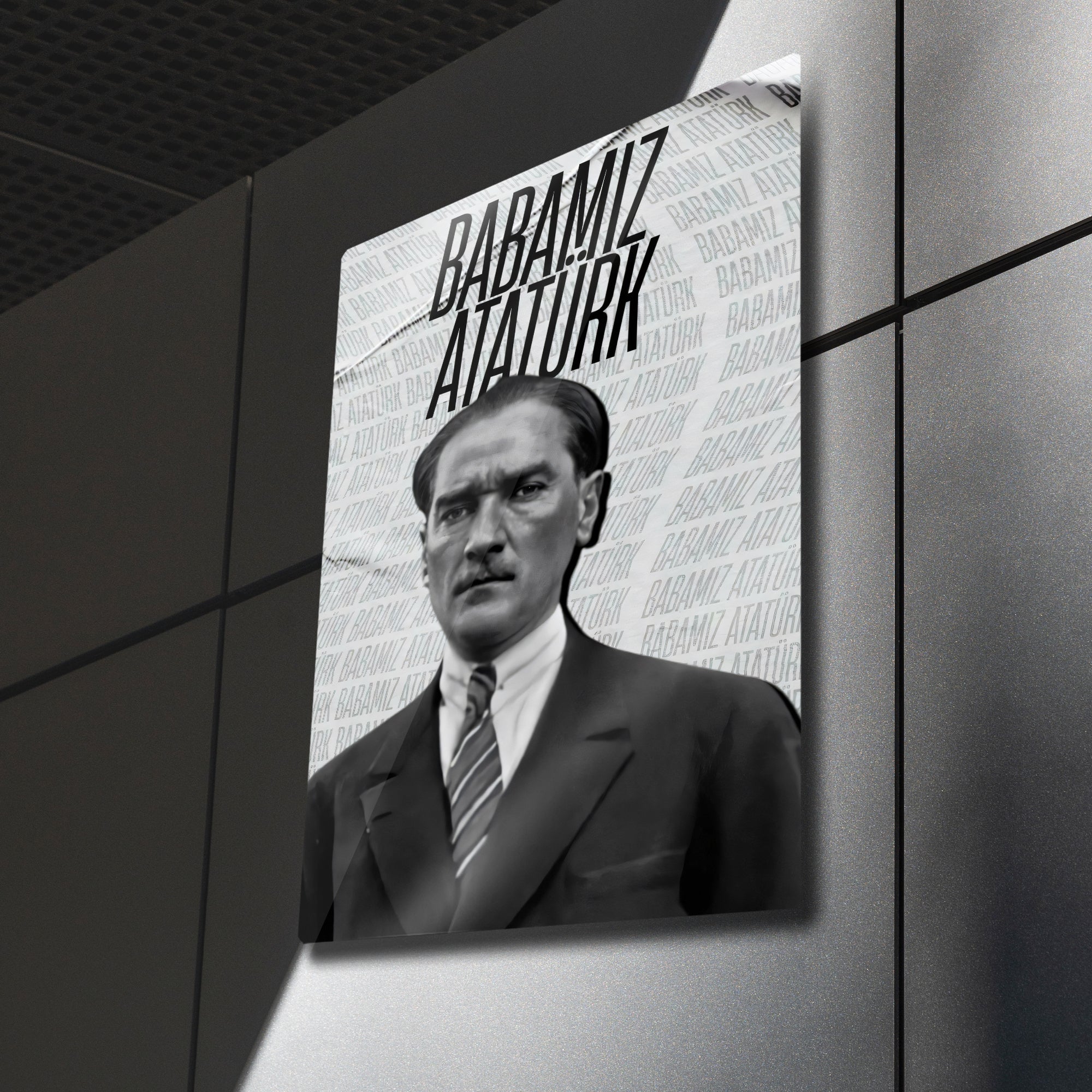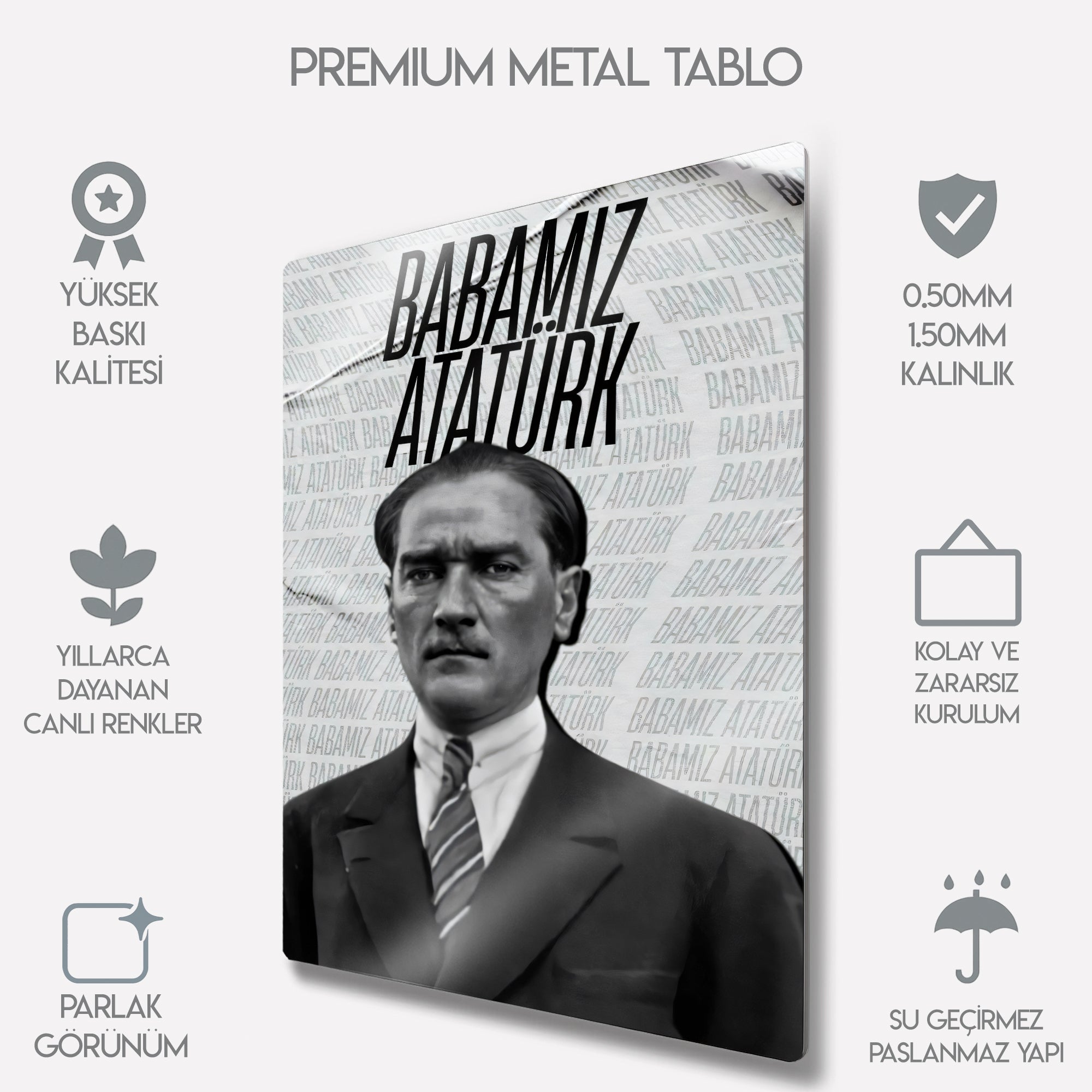 Cumhuriyetimizin kurucusu Mustafa Kemal Atatürk, “Babamız Atatürk” yazılı bu özel metal tabloda modern bir tasarımla ölümsüzleştirildi. Siyah beyaz portre tasarımı ve tipografik arka planı ile hem şık hem de anlamlı bir dekoratif eserdir.