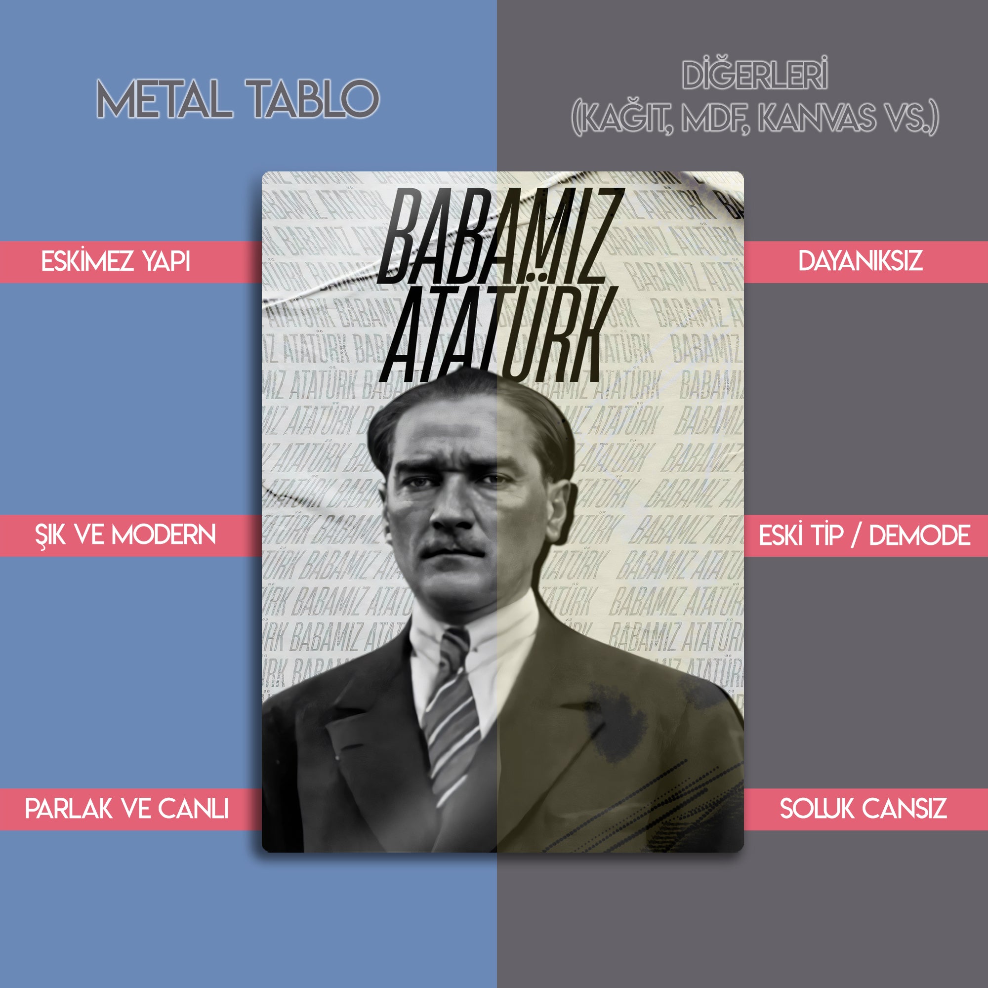 Bu özel Atatürk metal tablo, Cumhuriyet değerlerini yansıtan ve yaşam alanlarınıza derin bir anlam katan dekoratif bir sanat eseridir.