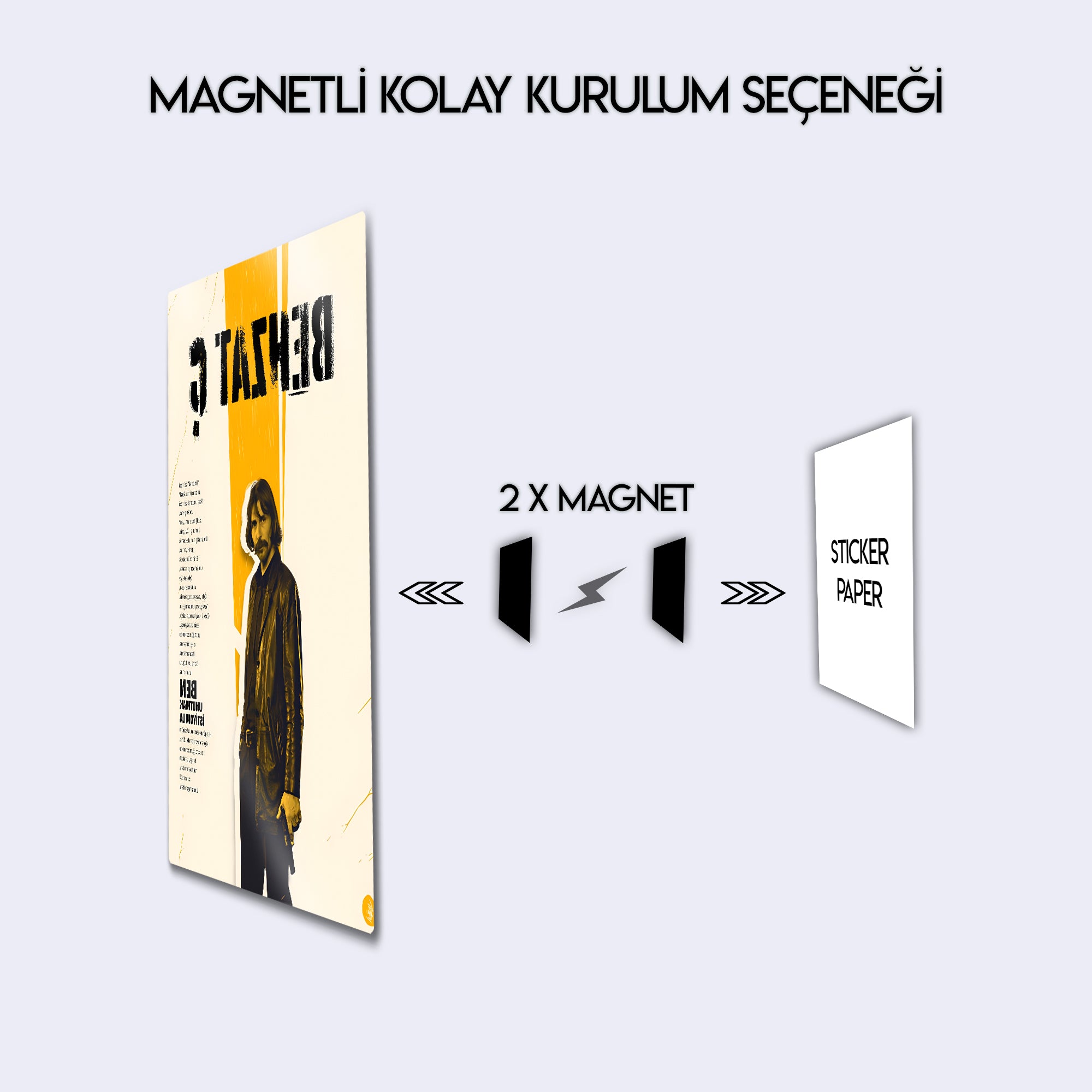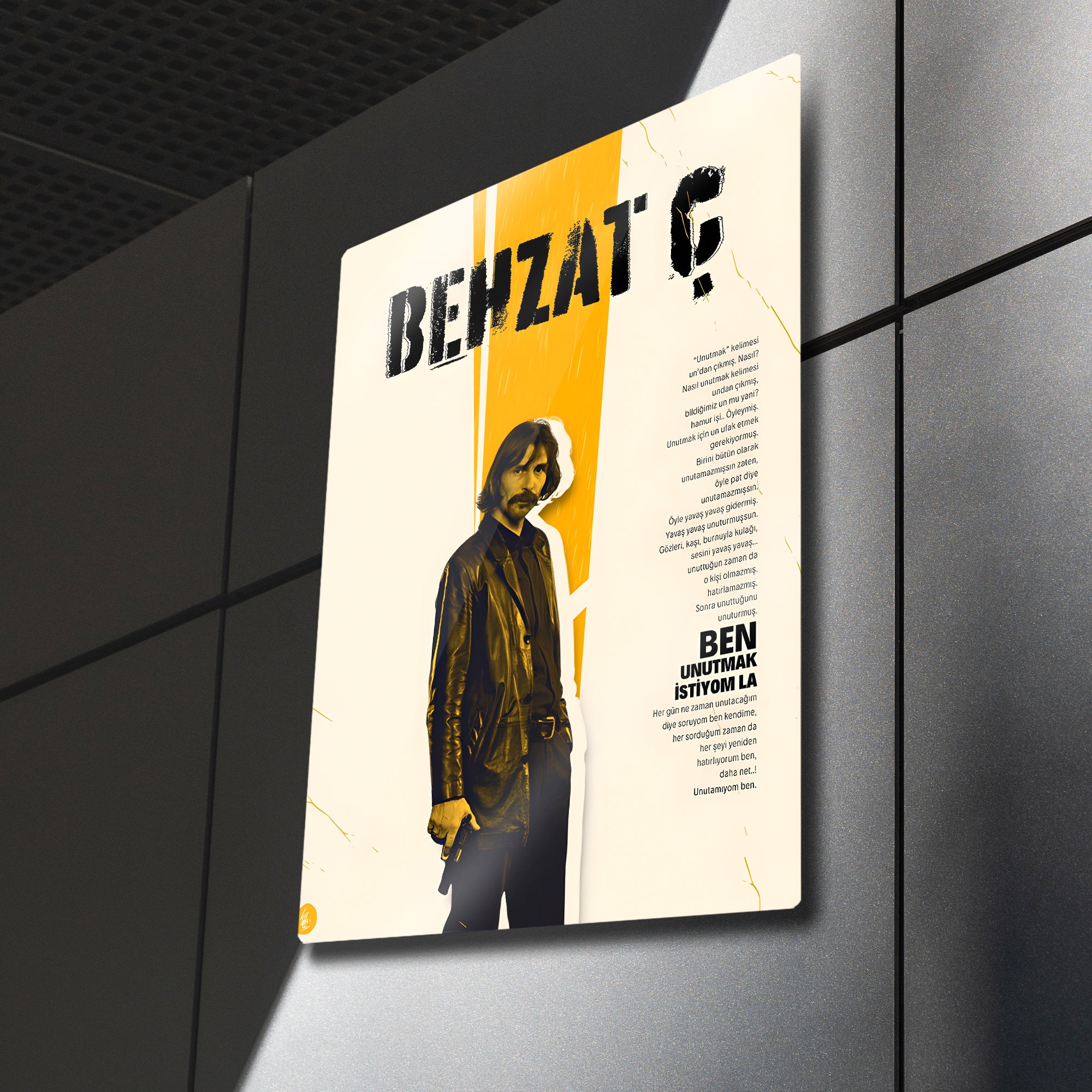 Türk dizi tarihine damga vuran Behzat Ç. Bir Ankara Polisiyesi dizisinin unutulmaz sahnelerinden biri olan “Ben unutmak istiyom la” repliği bu özel metal tablo tasarımında ölümsüzleştirildi. Karakterin ikonik görüntüsü ve sarı-siyah kontrastlı minimalist tasarımı ile hem nostaljik hem de modern bir dekor ürünü.