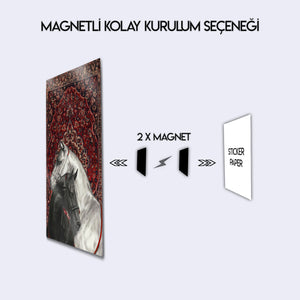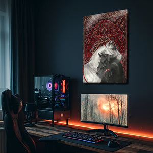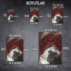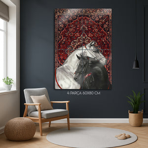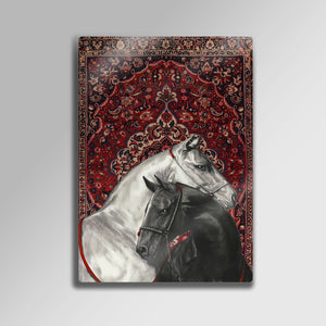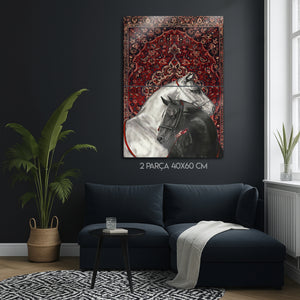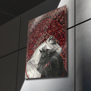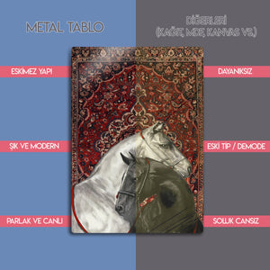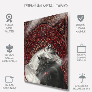 Geleneksel desenlerle modern sanatın birleştiği bu metal tablo, beyaz ve siyah iki atın asil duruşunu, kırmızı halı deseni arka planıyla buluşturuyor. Hem klasik hem de otantik bir dekoratif parça arayanlar için mükemmel bir seçimdir.