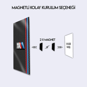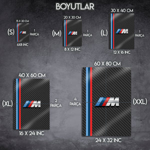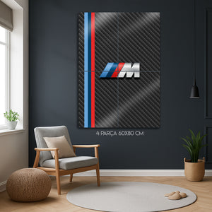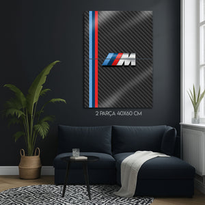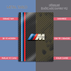 Bu minimalist ve güçlü tasarım, her otomobil tutkununun ve BMW hayranının sahip olmak isteyeceği, sofistike bir dekorasyon parçasıdır. Metalin pürüzsüz ve parlak yüzeyi, karbon fiber deseninin derinliğini ve M logosunun metalik parlaklığını mükemmel bir şekilde öne çıkarır. Garajınız, ofisiniz, "man cave"iniz veya modern salonunuz için tasarlanmış bu tablo, mekanınıza anında bir dinamizm ve premium bir hava katacaktır.
