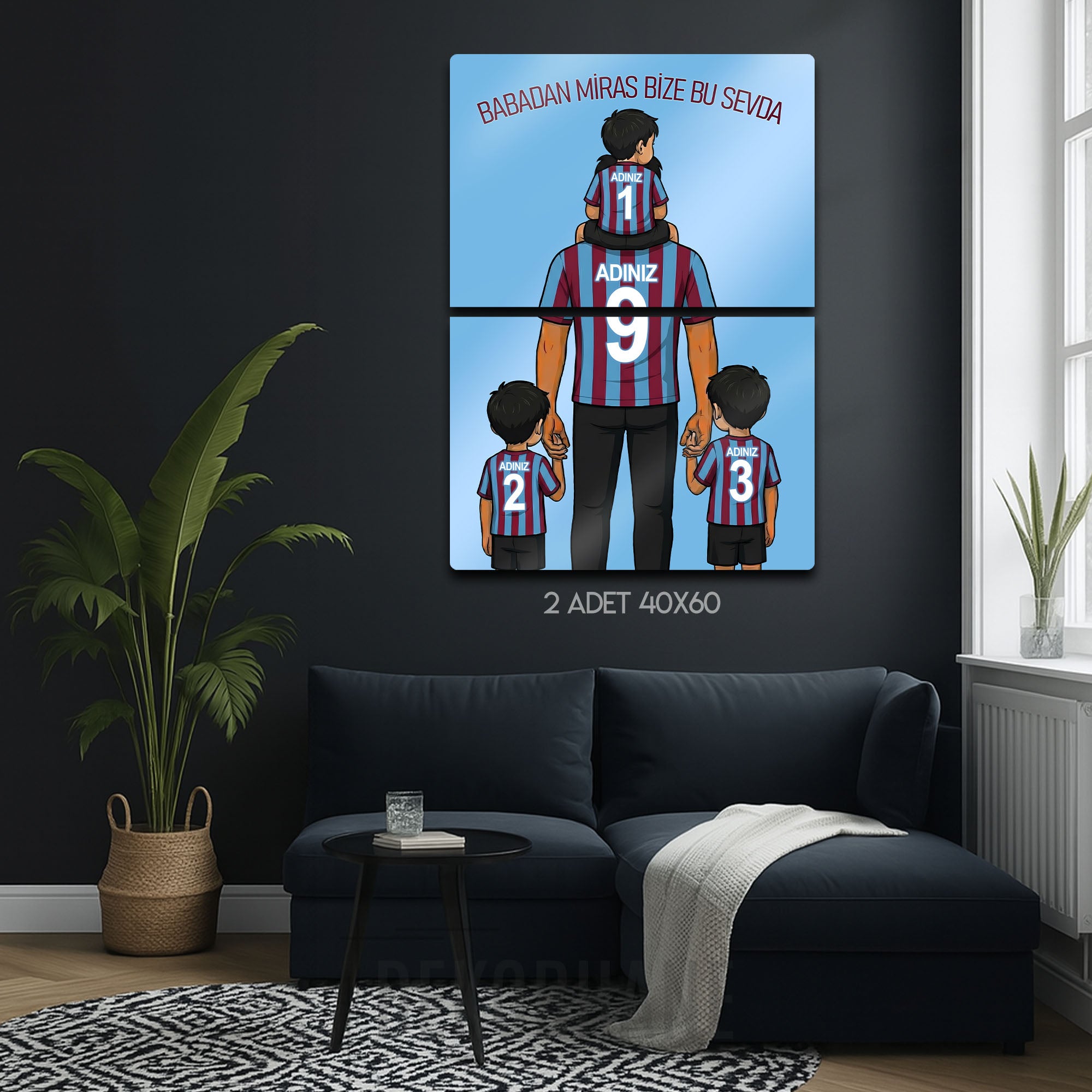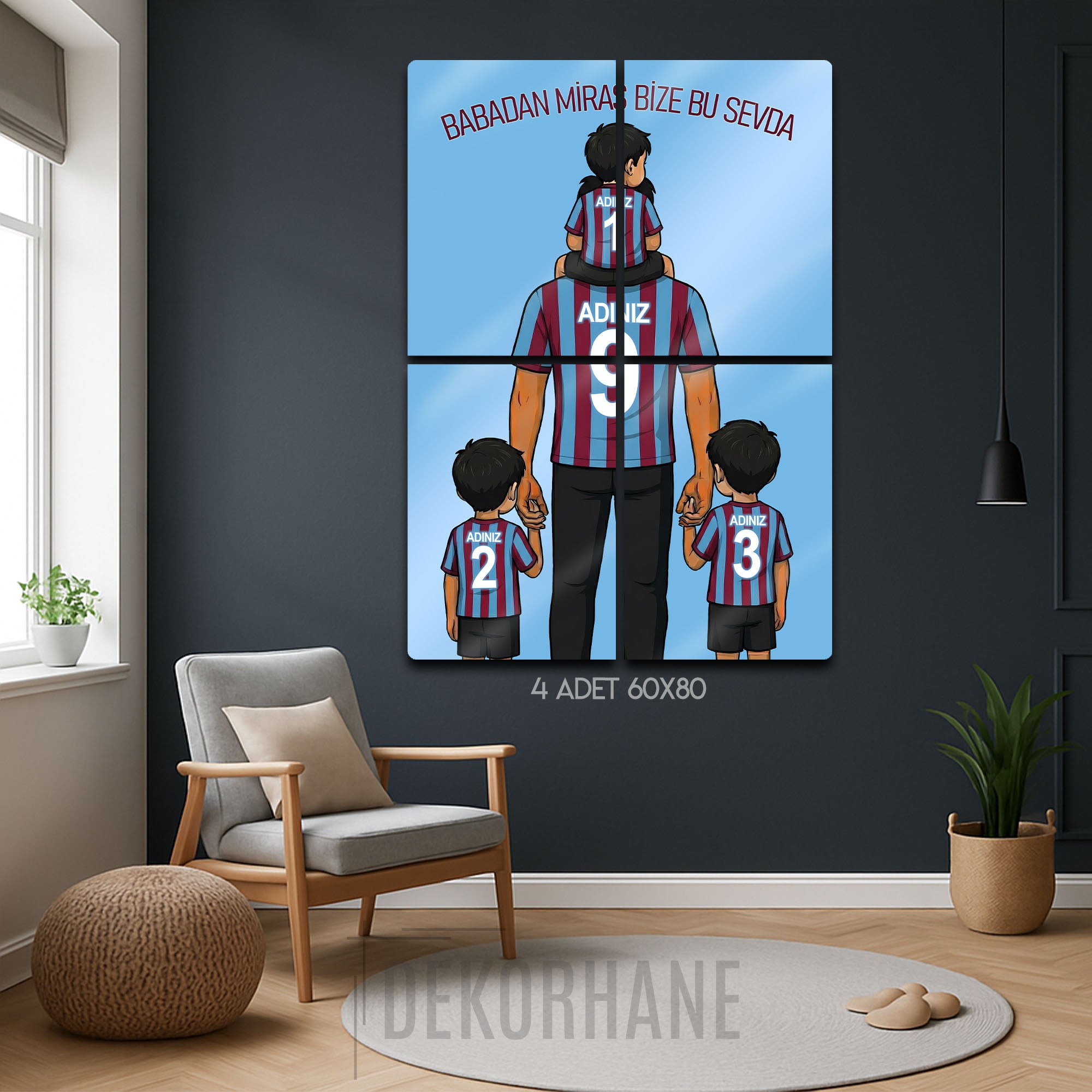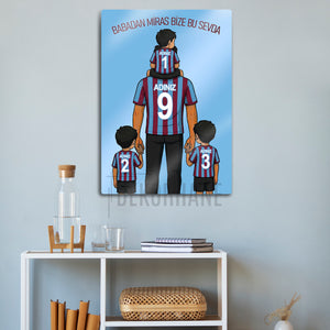 Tablo üzerindeki "ADINIZ" alanlarına, hem babanın hem de üç çocuğun formasına dilediğiniz isimleri ve sizin için anlamlı olan numaraları yazdırarak bu tasarımı tamamen kendinize özel hale getirebilirsiniz. Bu kişiselleştirme, tabloyu sadece size ait kılmakla kalmaz, aynı zamanda onu paha biçilmez bir hediye seçeneğine dönüştürür.