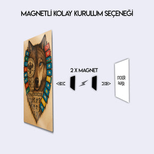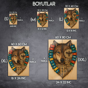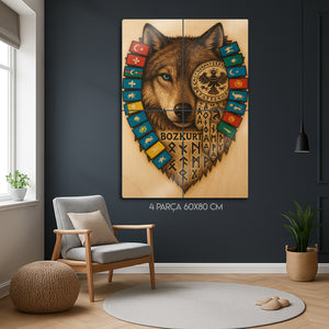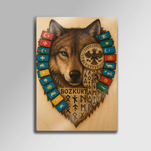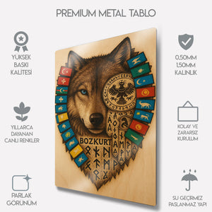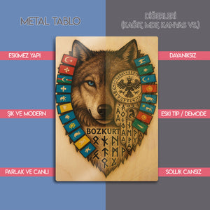 Türk kültürünün en önemli simgelerinden biri olan Bozkurt, bu özel metal tabloda modern sanat ile buluşuyor. Efsanelerden günümüze taşınan bozkurt figürü, etrafında yer alan Türk boylarının bayrakları ve Orhun alfabesi detaylarıyla güçlü bir tarihsel bağ kuruyor.
