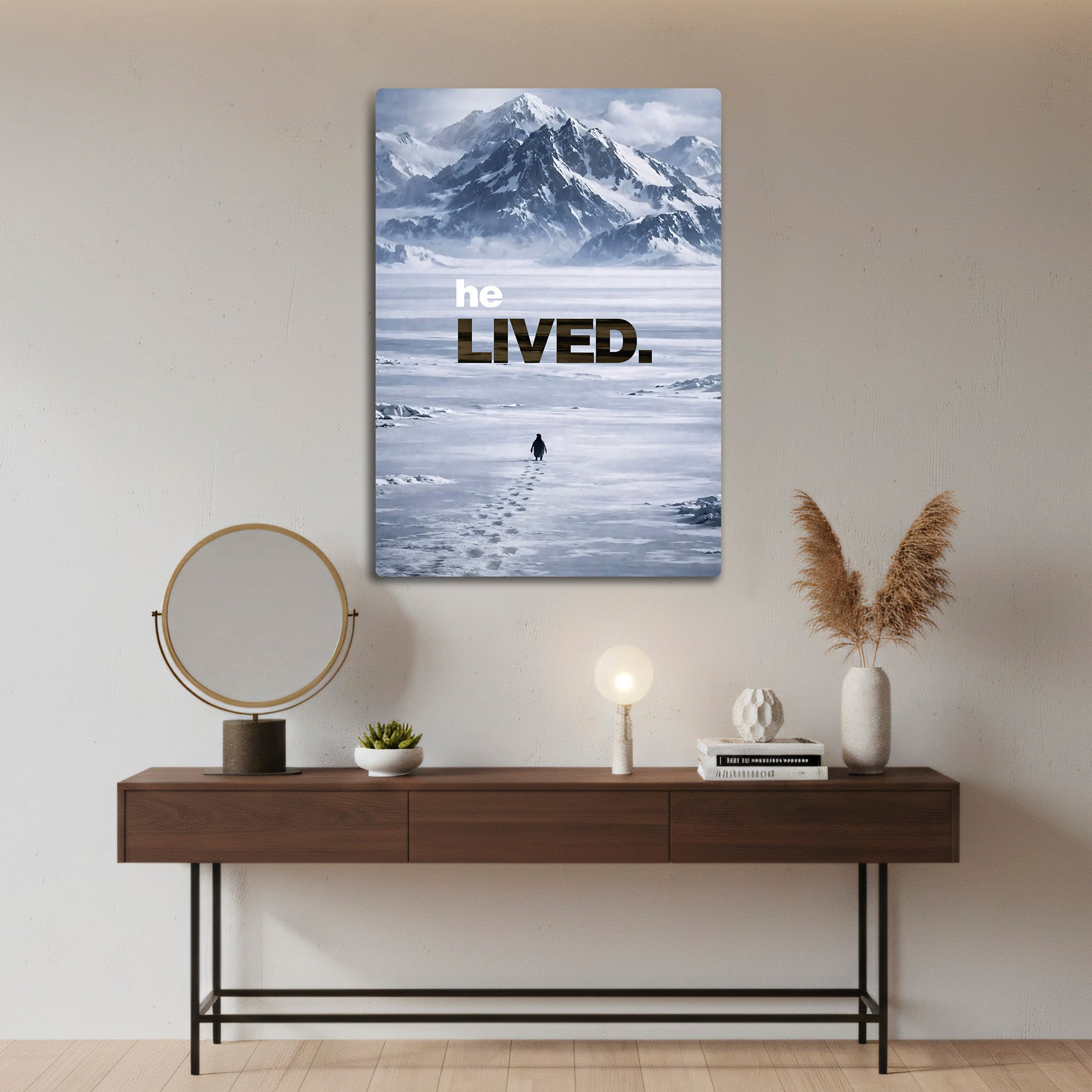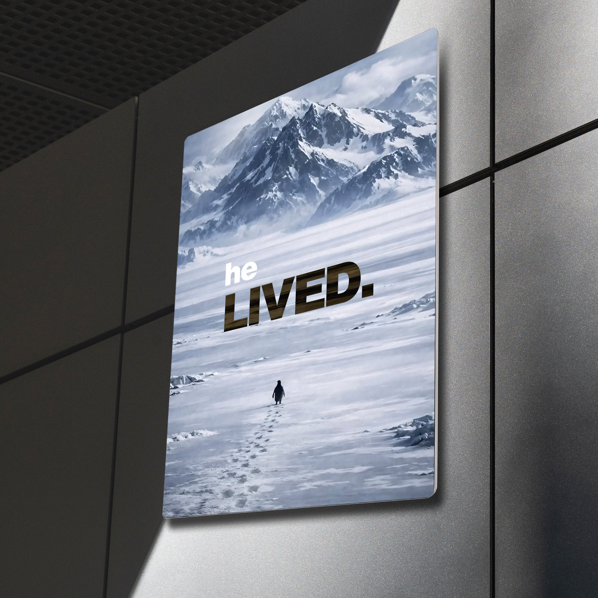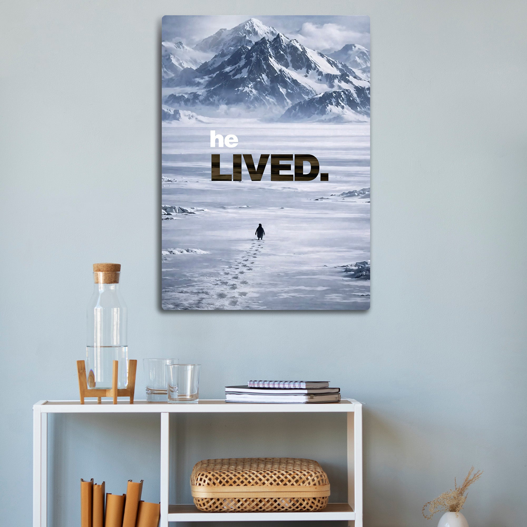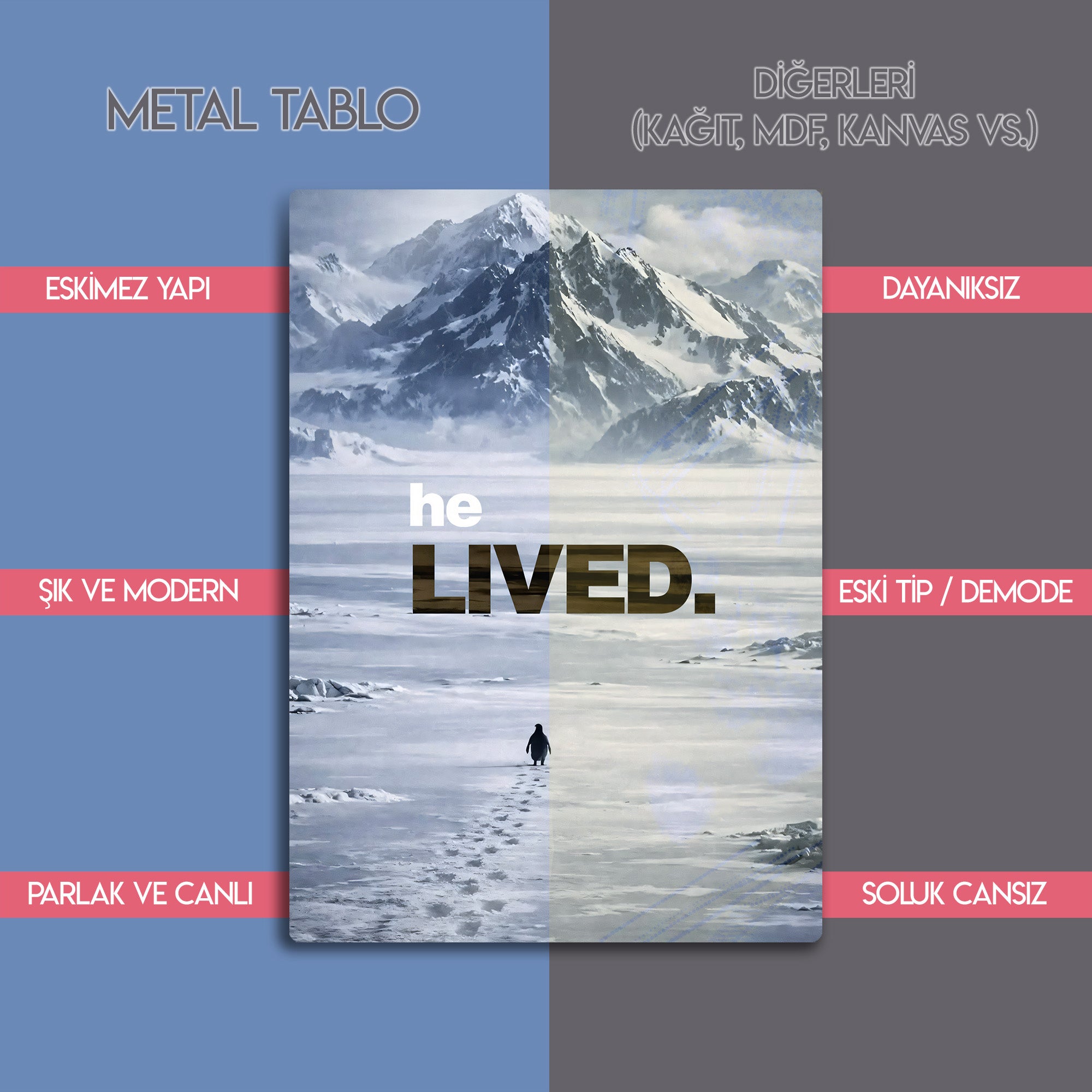 Dünya çapında viral olan ve Werner Herzog’un meşhur belgeseli Encounters at the End of the World (Dünyanın Ucundaki Karşılaşmalar) ile hafızalara kazınan o ikonik sahneden ilham alan bu metal tablo, sadece bir dekorasyon değil, bir duruşun simgesidir. Koloniyi terk edip dağlara doğru tek başına yürüyen o "mecnun" penguenin hikayesi, şimdi duvarlarınızda hayat buluyor.