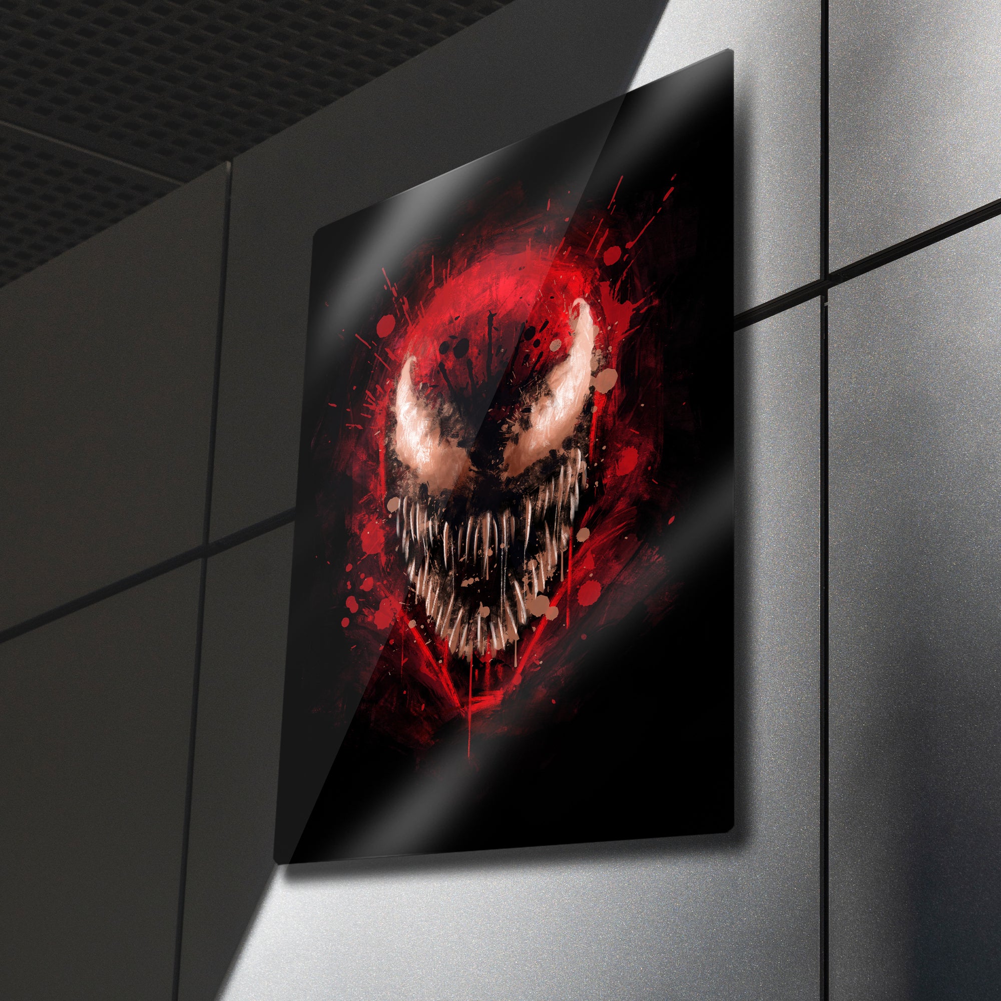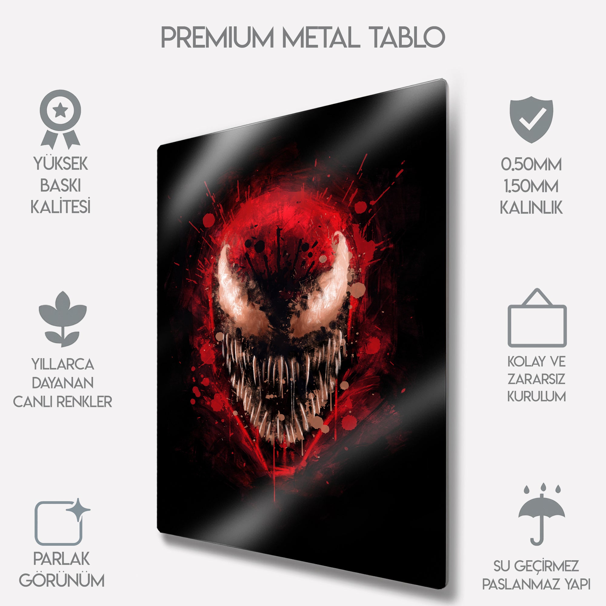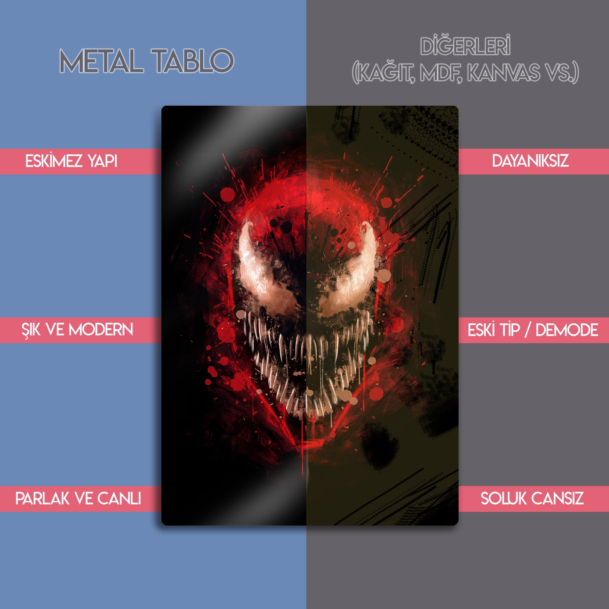 Marvel evreninin en vahşi ve güçlü karakterlerinden biri olan Carnage, bu özel metal tabloda karanlık ve etkileyici tarzıyla karşınıza çıkıyor. Kırmızı ve siyahın güçlü kontrastı, duvarlarınıza adrenalin ve dinamizm katıyor.