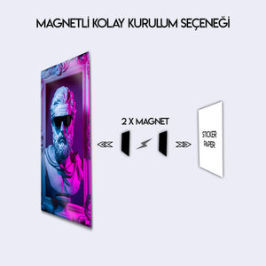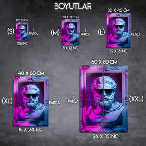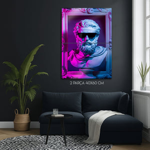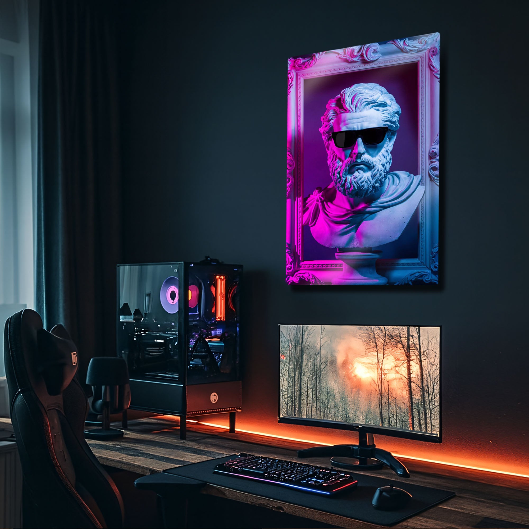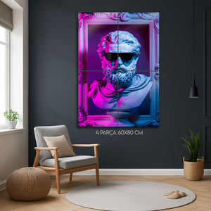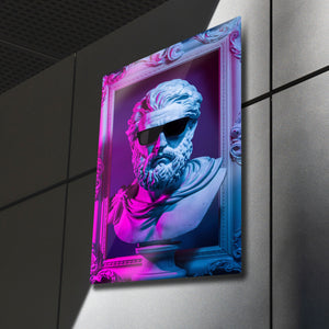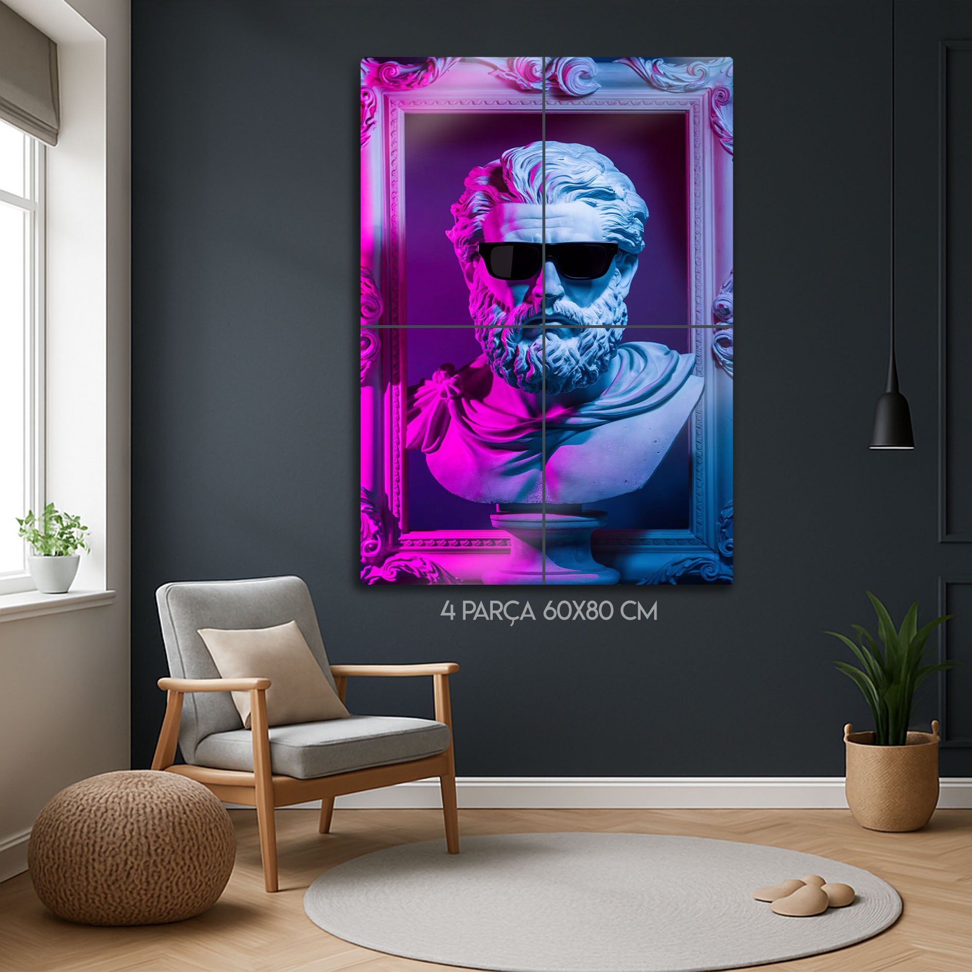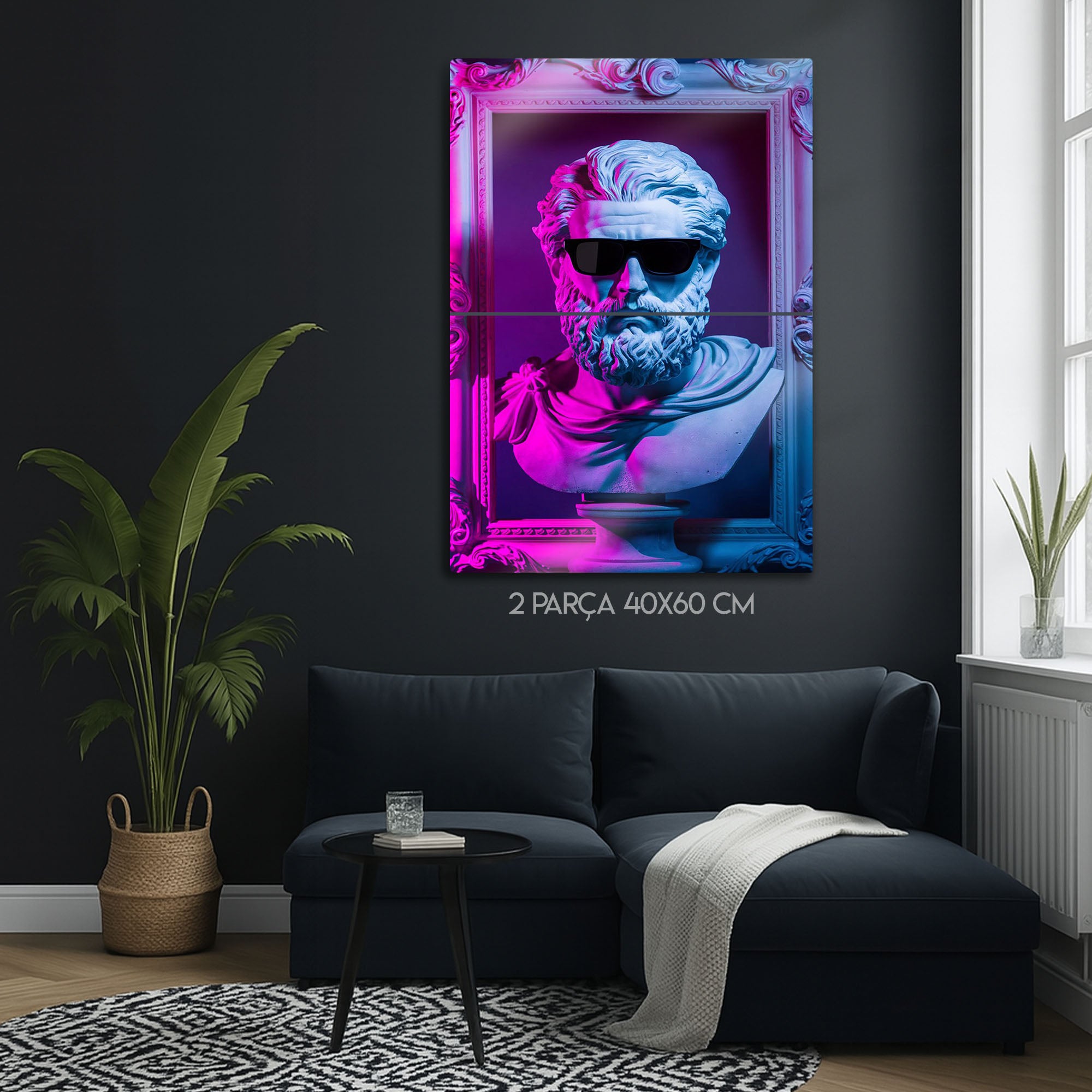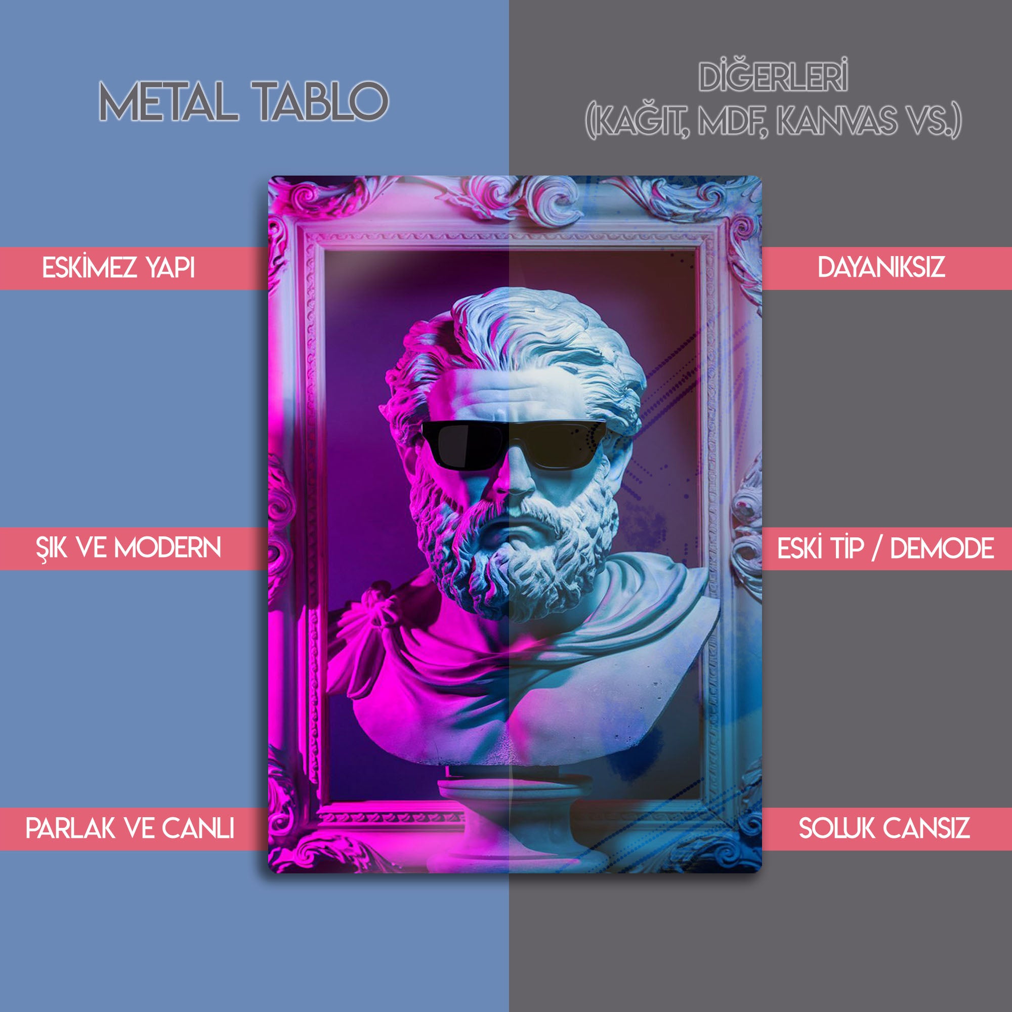 Klasik sanatın bilgeliği, modern dünyanın "cool" tavrıyla buluşuyor! Bu eşsiz ve esprili metal tablo, antik Yunan tanrılarının kralı Zeus'un (veya başka bir bilge filozofun) ikonik büstünü, modern güneş gözlükleriyle günümüze taşıyor. Canlı pembe (magenta) ve mavi (cyan) neon ışıkların yarattığı bu atmosfer, esere enerjik bir pop art ve vaporwave estetiği kazandırıyor.
