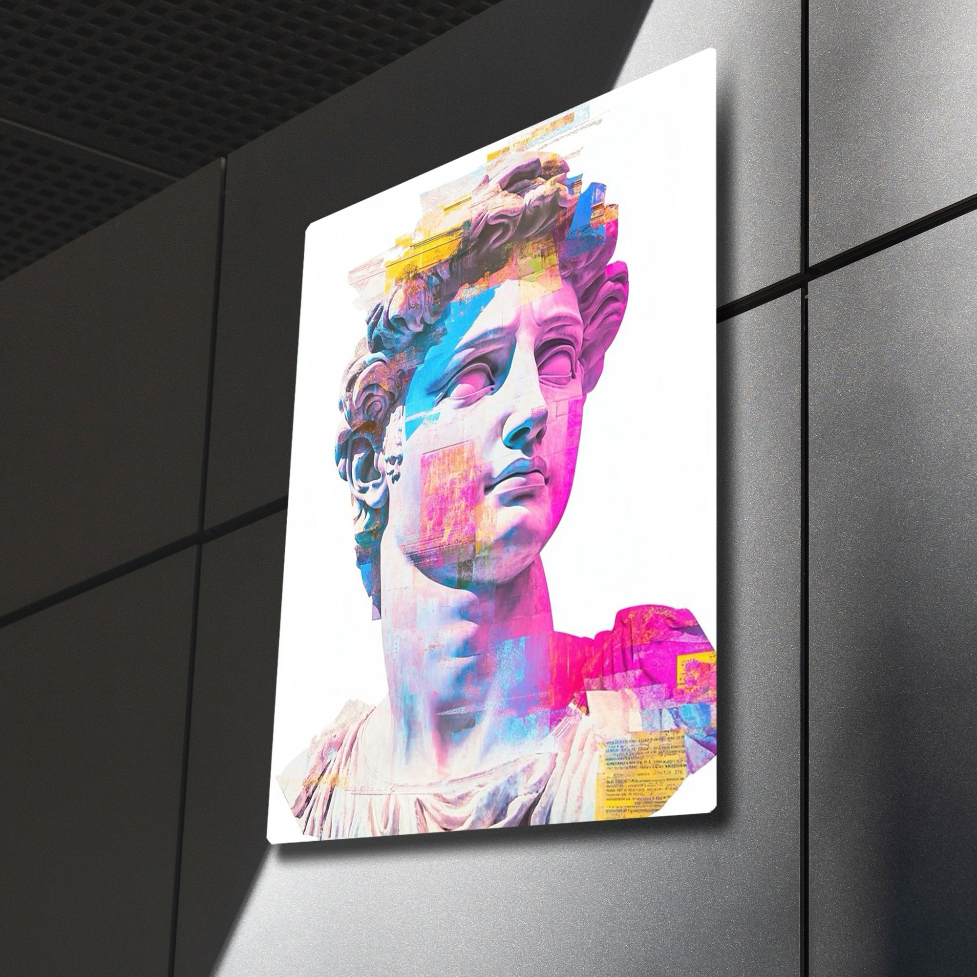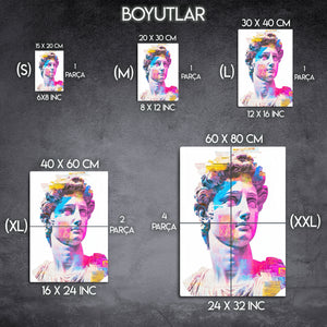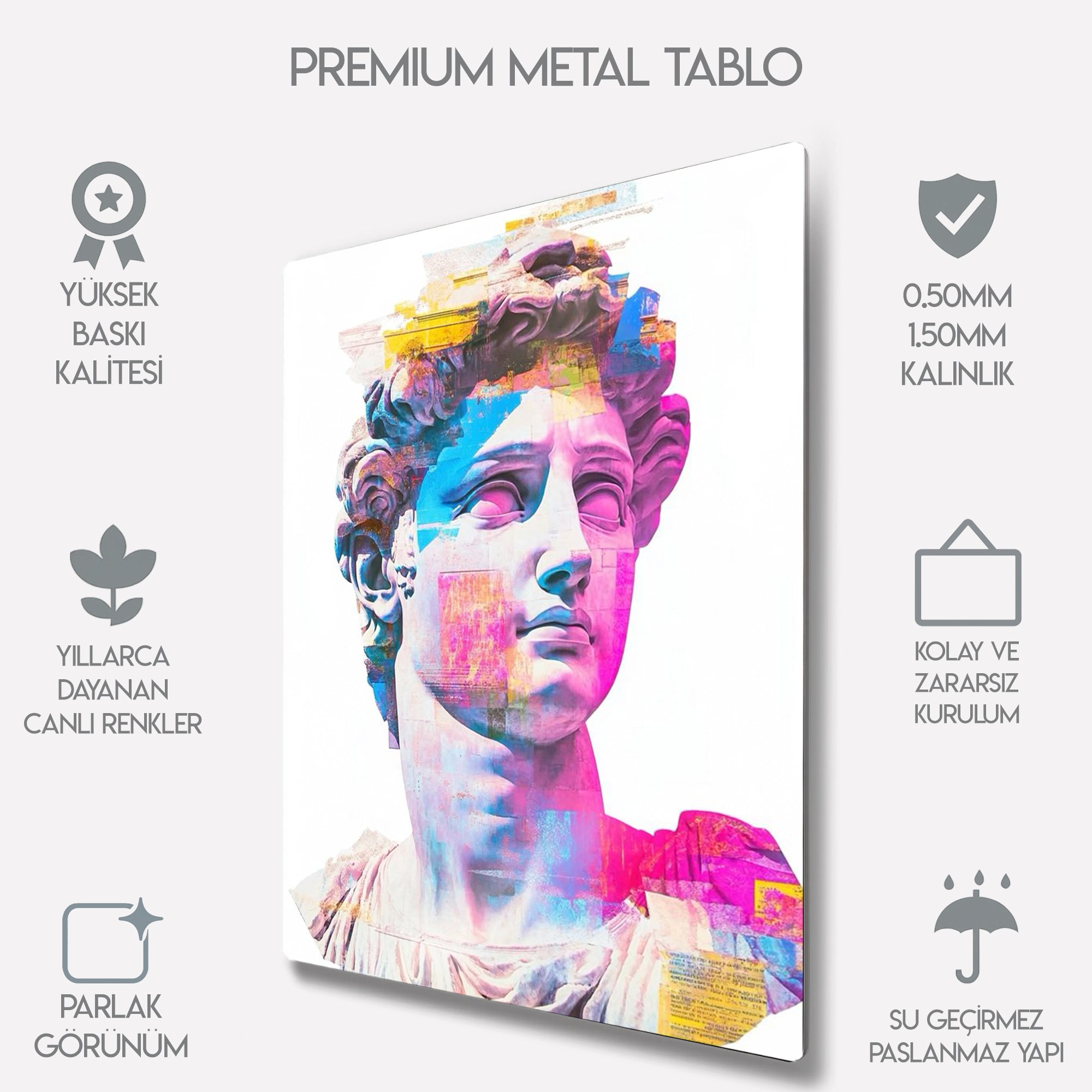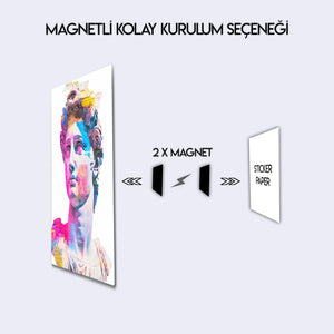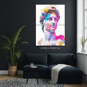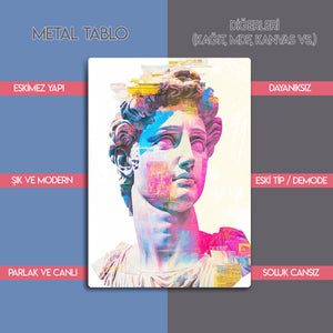 Klasik sanat ile modern pop-art stilinin buluştuğu bu özel metal tablo, Michelangelo’nun efsanevi David heykelini renkli ve soyut dokunuşlarla yeniden canlandırıyor. Canlı pembe, mavi ve sarı tonlarıyla göz alıcı bir görünüme sahip olan bu tablo, evinizin veya ofisinizin dekoruna sanatsal bir hava katıyor.