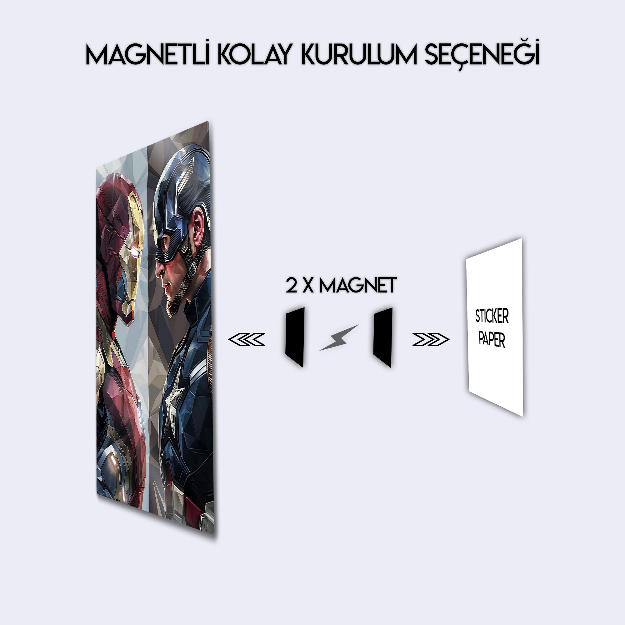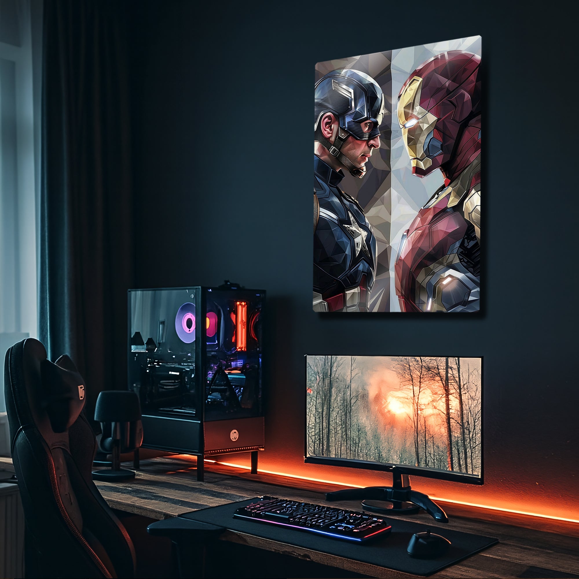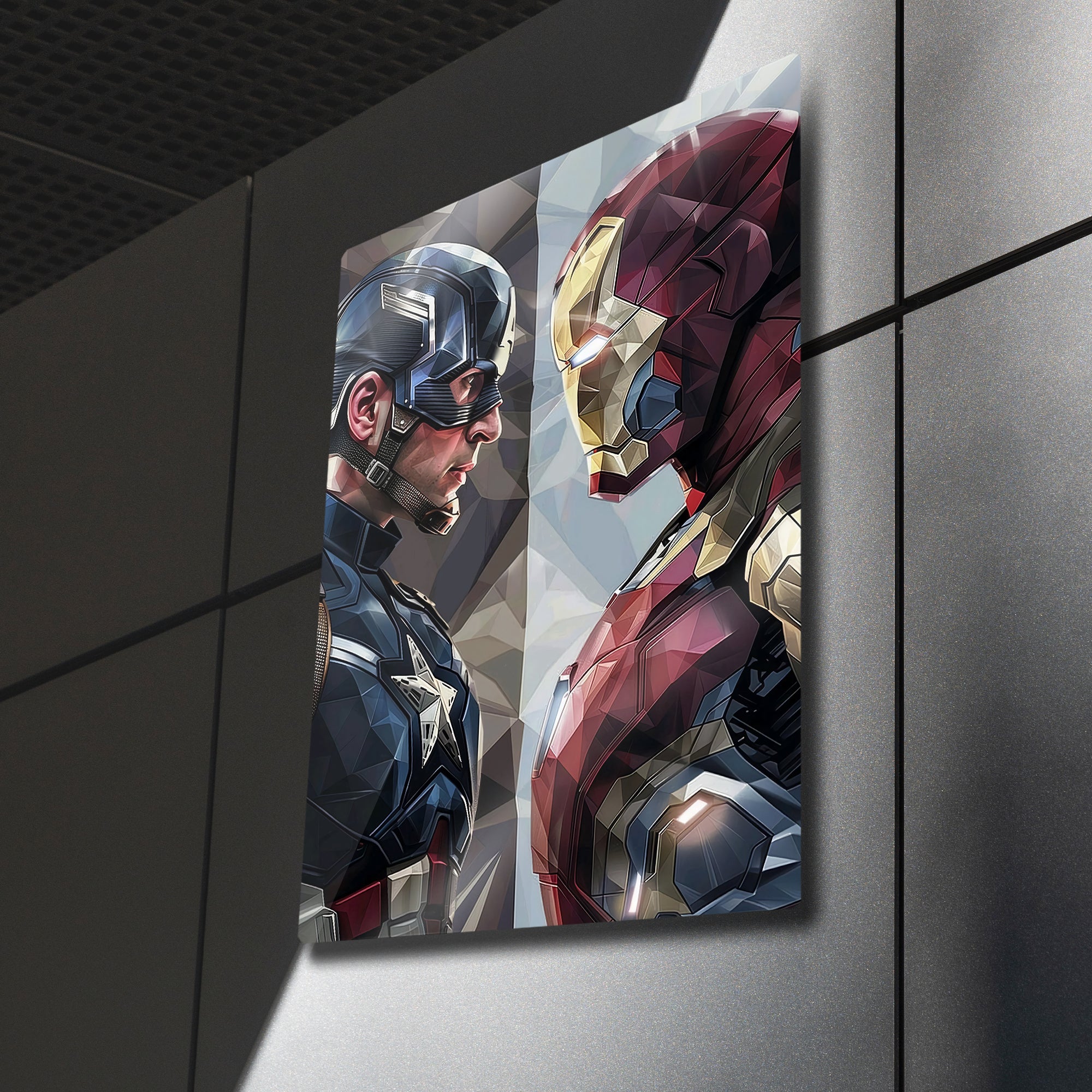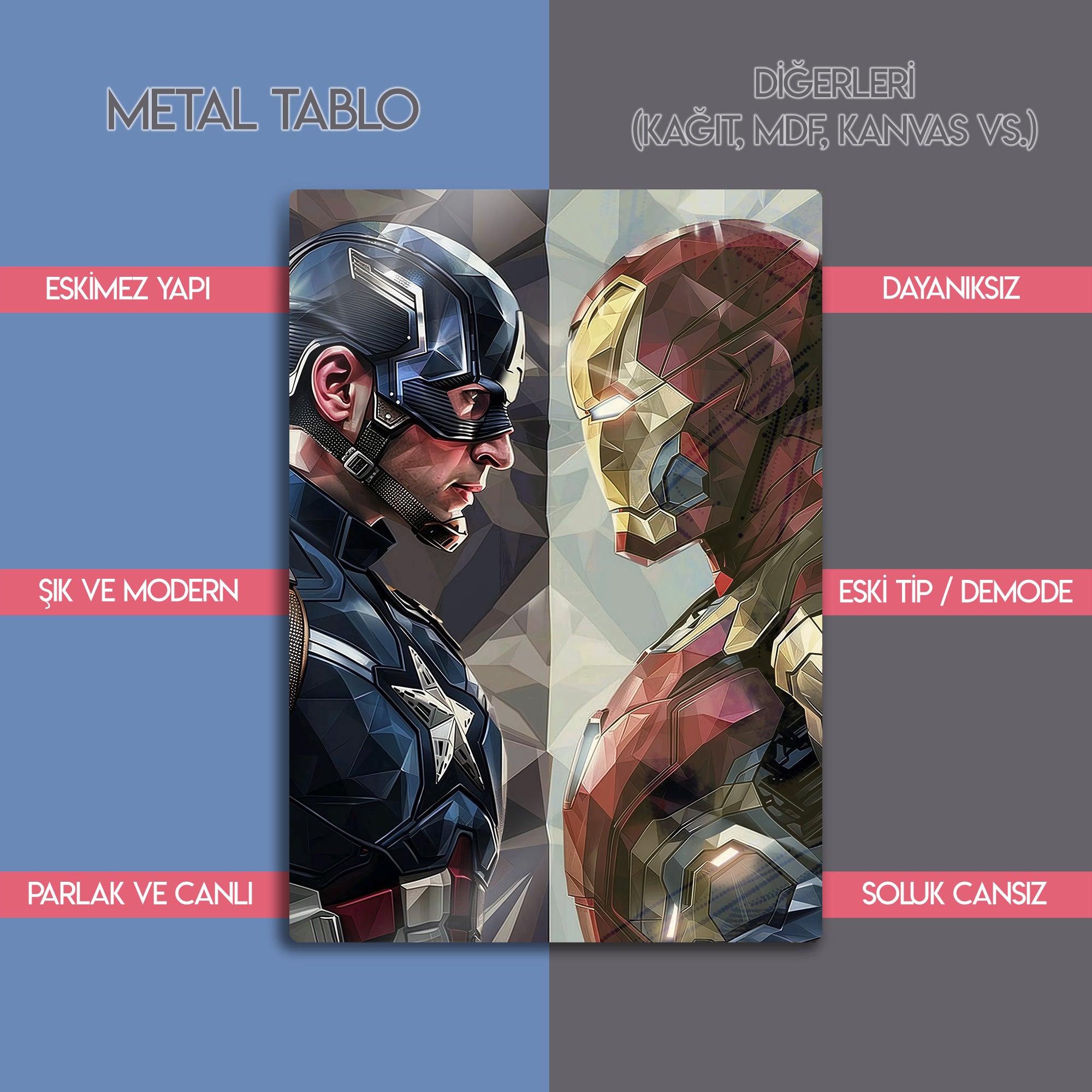 Marvel evreninin en ikonik kahramanları Captain America ve Iron Man’i yüz yüze getiren bu özel tasarım metal tablo, koleksiyoncular ve çizgi roman hayranları için mükemmel bir dekor parçası. 🌟 Yüksek baskı kalitesi ve modern geometrik tarzı sayesinde salon, genç odası, ofis veya hediye için ideal bir seçimdir.