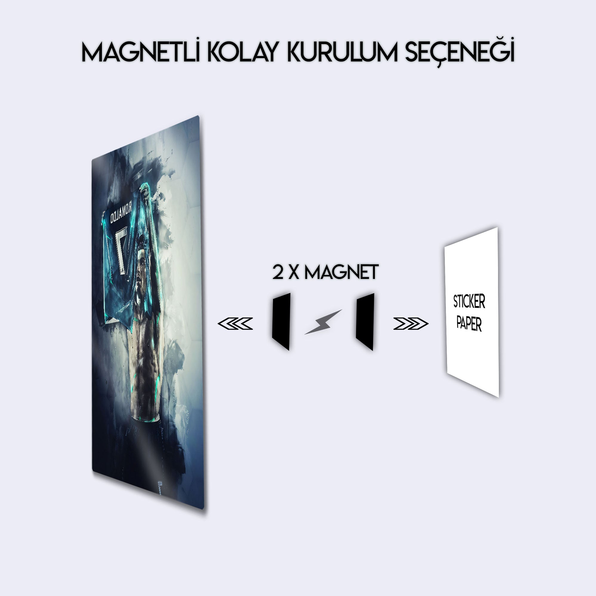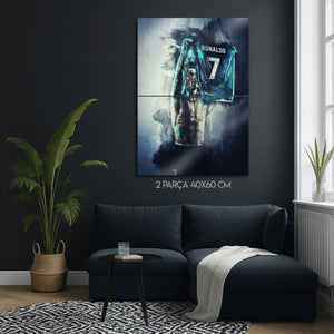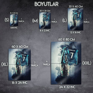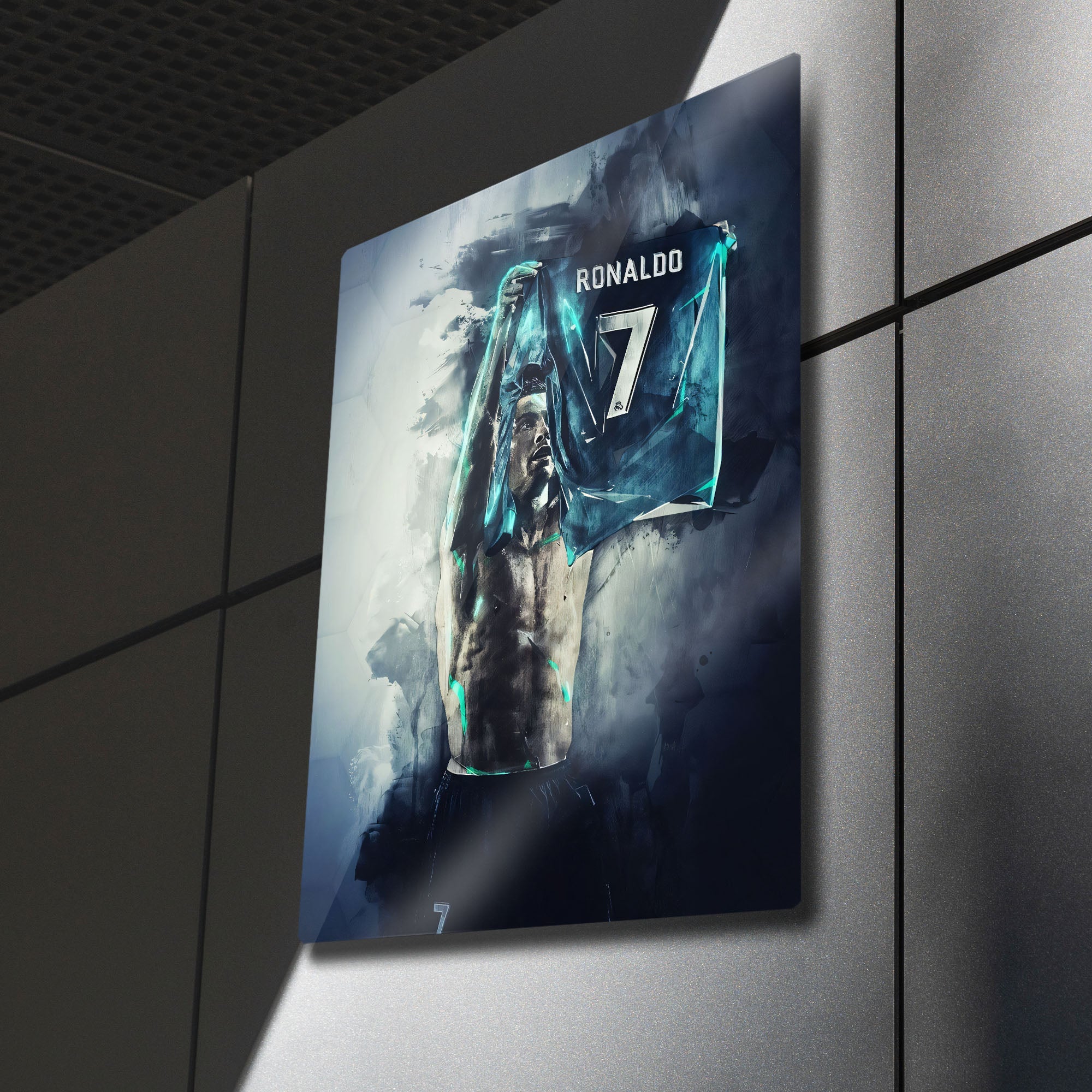 Bu eser, sadece bir spor posteri değil, aynı zamanda sarsılmaz bir iradenin, kendine inancın ve zaferin bir manifestosudur. Buzul mavisi ve beyaz tonlarındaki bu sanatsal yorum, Ronaldo'nun sahadaki o soğukkanlı ve bitirici gücünü mükemmel bir şekilde yansıtıyor. Metalin modern dokusu, bu dinamik ve sanatsal tasarımın her bir fırça darbesini ve enerjisini daha da öne çıkarır.