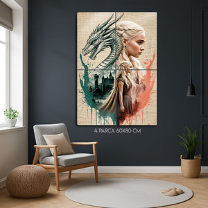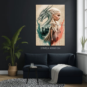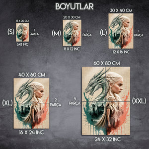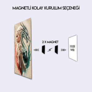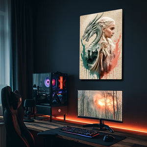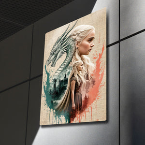 Game of Thrones hayranları için özel tasarlanmış bu metal tablo, ejderhaların annesi Daenerys Targaryen’i ve ikonik ejderhasını güçlü bir görsellikle buluşturuyor. Fantastik atmosferiyle dizinin büyüleyici dünyasını evinize taşıyan bu tasarım, koleksiyoncular ve Westeros evrenini sevenler için mükemmel bir dekoratif parçadır.
