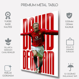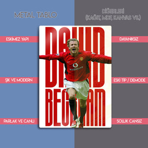 Efsane futbolcu David Beckham’ın Manchester United döneminden ikonik bir anını yansıtan bu metal tablo, futbol tutkusunu yaşam alanlarınıza taşıyor. Dinamik tasarımı ve kırmızı-beyaz kontrastıyla hem spor ruhunu hem de nostaljik futbol atmosferini duvarlarınıza getiriyor.
