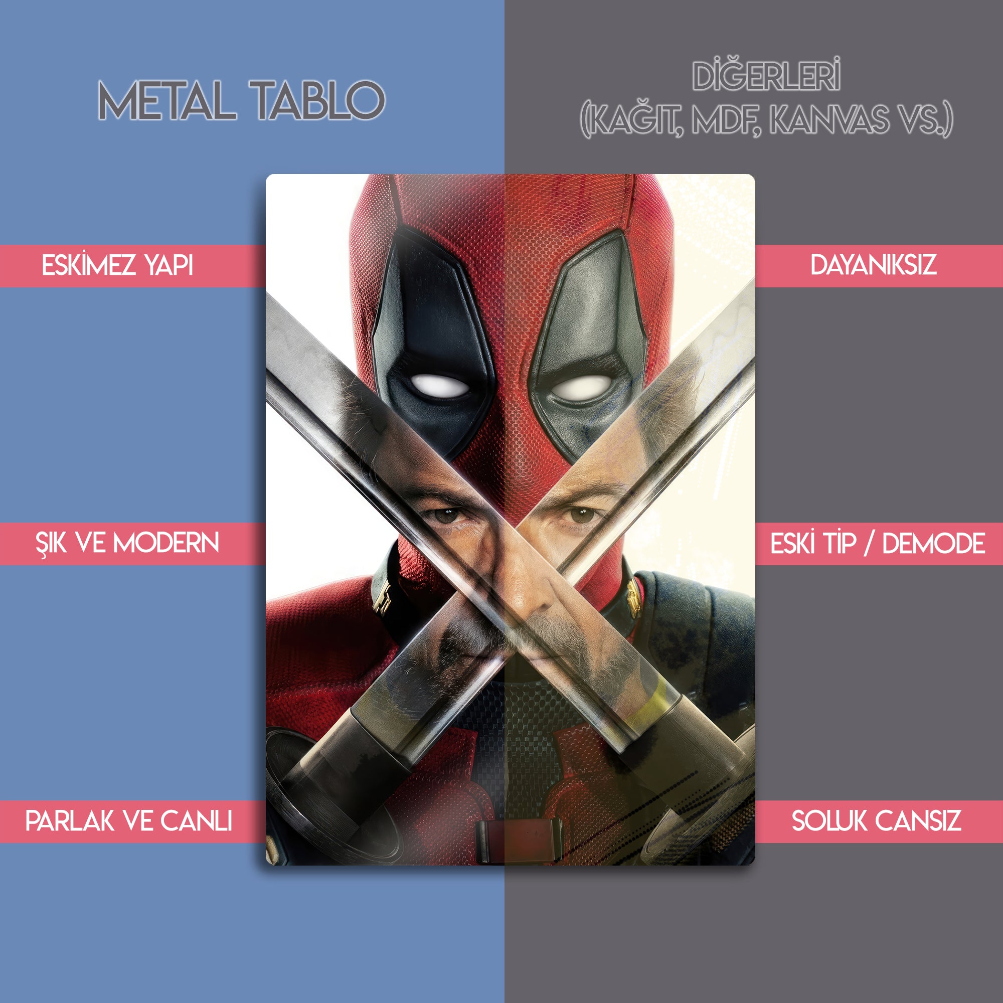 Deadpool X Wolverine tablosu şimdi sizlerle. Marvel evreninin eğlenceli ve asi anti-kahramanı Deadpool, bu özel tasarımlı çift kılıçlı metal tablo ile duvarlarınıza enerjik bir hava katıyor. Detaylı baskı kalitesi ve dayanıklı metal yüzeyi sayesinde uzun yıllar ilk günkü gibi canlı kalır. Çizgi roman ve Marvel hayranları için mükemmel bir koleksiyon parçası olan bu tablo, aynı zamanda genç odası, ofis ve salon dekorasyonu için de eşsiz bir seçimdir. Modern tasarımıyla hediye olarak da öne çıkar.