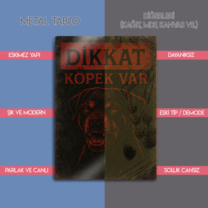 Sadece bir uyarı değil, aynı zamanda bir stil beyanı! Bu eşsiz metal tablo, klasik "Dikkat Köpek Var" uyarısını, güçlü ve karizmatik bir Rottweiler illüstrasyonu ile birleştirerek sıradan bir levhanın çok ötesine taşıyor. Eskitme (distressed) ve paslı metal efekti, tasarıma otantik ve cesur bir karakter katıyor.