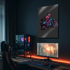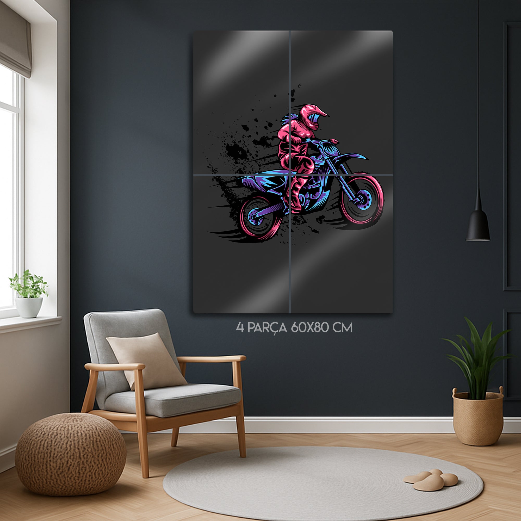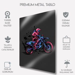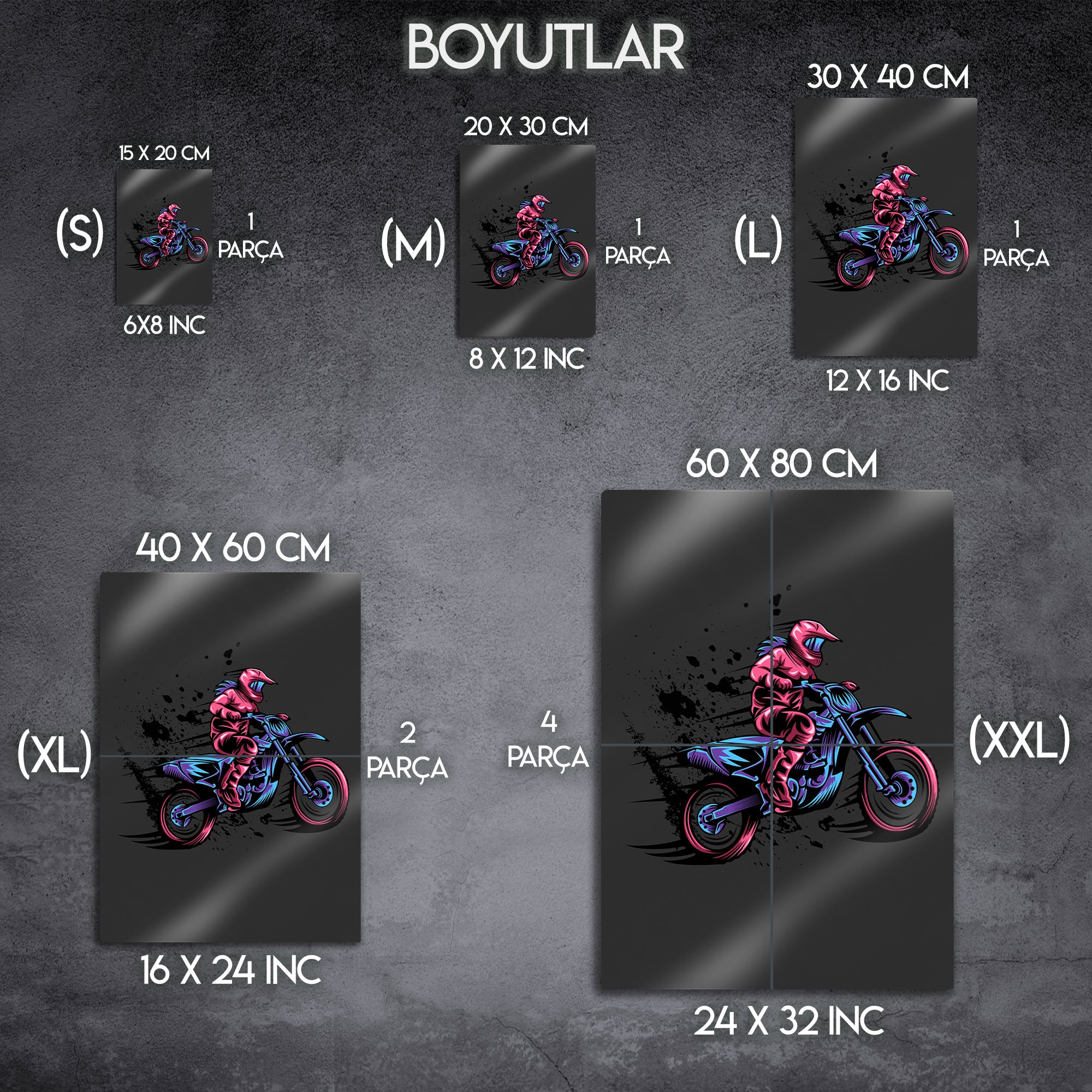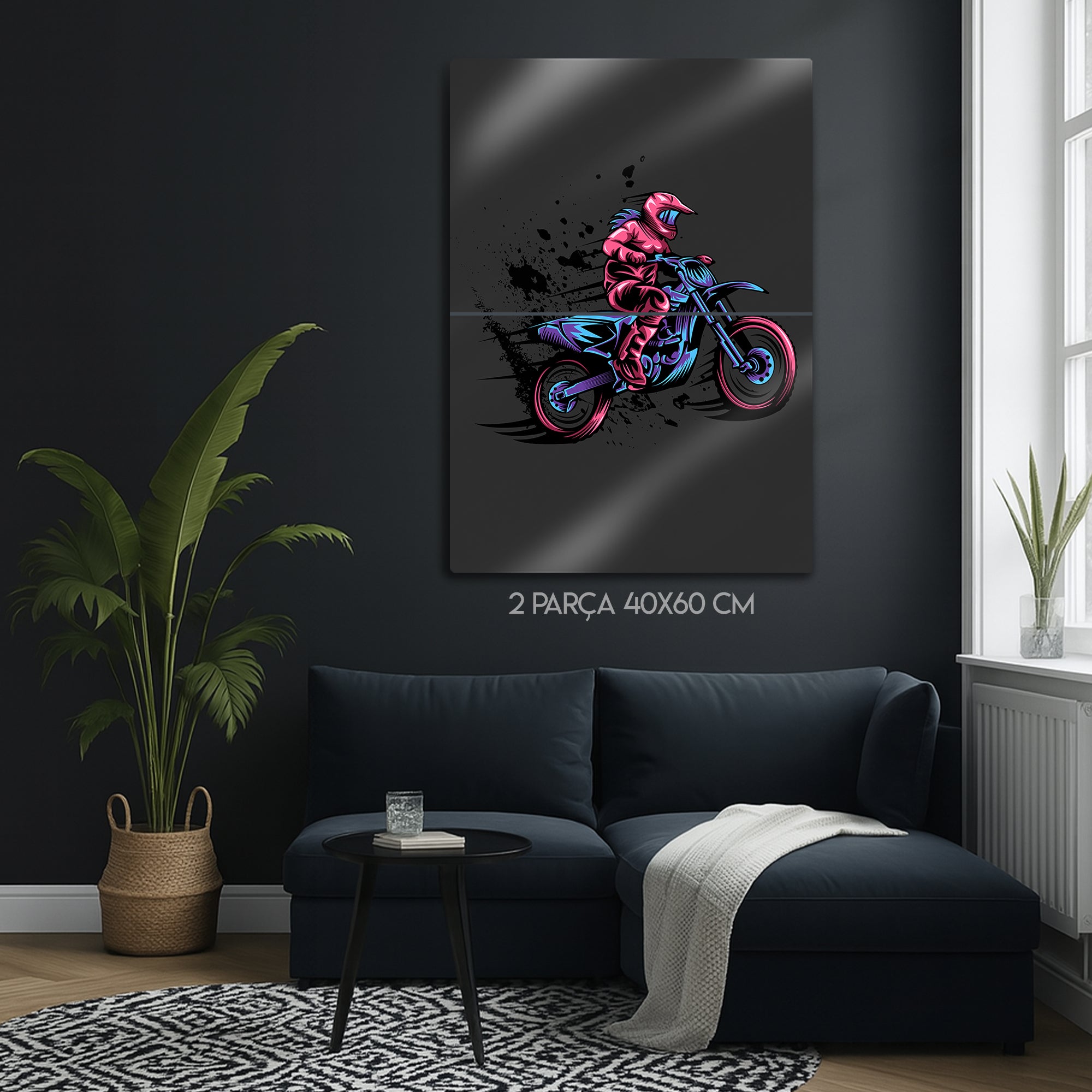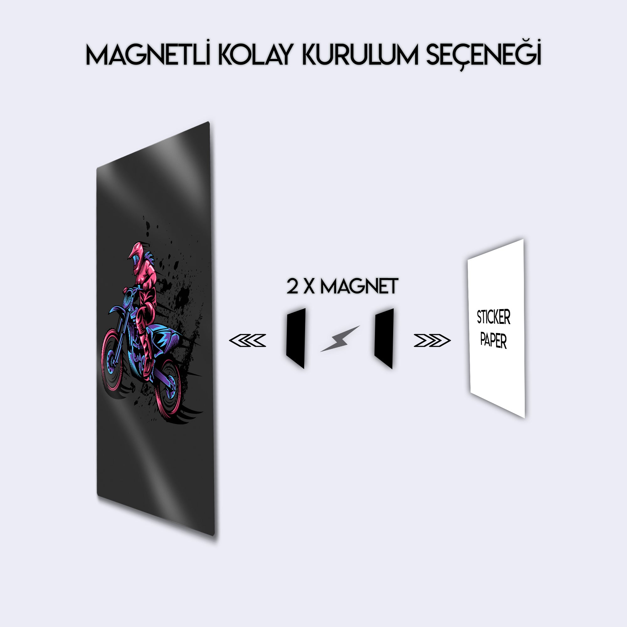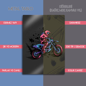 Adrenalini ve özgürlüğü temsil eden bu motokros tasarım metal tablo, motor sporlarına tutkulu olanlar için özel olarak hazırlandı. Canlı neon renklerin öne çıktığı modern çizim, siyah arka planla birleşerek güçlü bir kontrast sunuyor. Dayanıklı metal yüzeyi sayesinde uzun yıllar solmadan kullanılabilir. Motor tutkunu gençler, spor severler ve koleksiyoncular için mükemmel bir dekoratif parçadır. Oyun odaları, genç odaları, garaj dekorasyonu ve spor konseptli mekânlar için ideal bir seçimdir.
