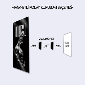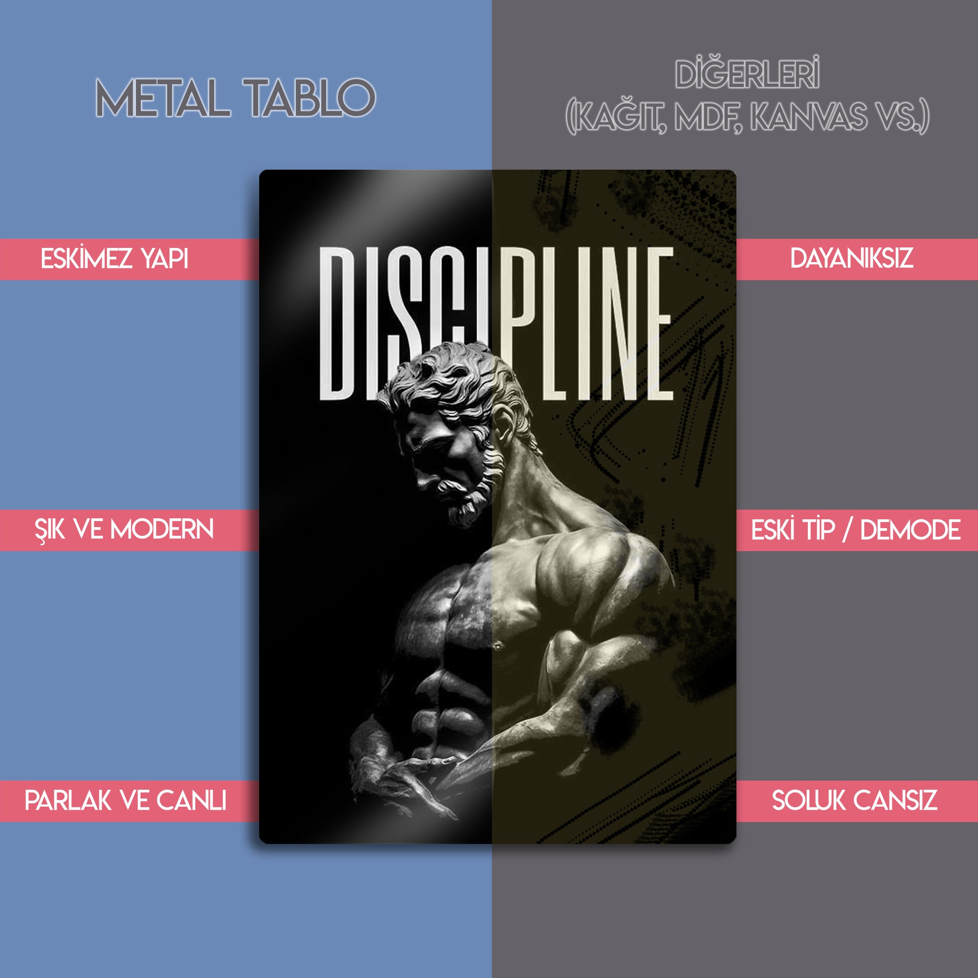 Gücü, iradeyi ve kararlılığı simgeleyen bu Discipline temalı metal tablo, minimalist siyah-beyaz tasarımıyla modern dekorasyonlara güçlü bir hava katıyor. Kaslı heykel figürü ve “Discipline” yazısı, sporcular, sanat severler ve motivasyon odaklı kişiler için ilham verici bir görsel sunuyor. Dayanıklı metal baskısı sayesinde uzun yıllar parlaklığını korur. Spor salonları, ofisler, çalışma odaları ve modern yaşam alanları için mükemmel bir seçimdir. Güçlü bir motivasyon kaynağı arayanlara ideal dekoratif parça.