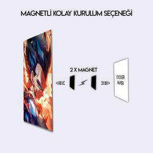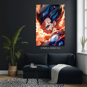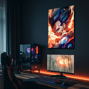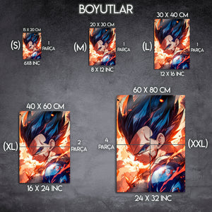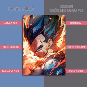 ''Ben bir savaşçıyım, palyaço değil!'' Saiyanların gururlu prensi, evrenin en kararlı ve en sarsılmaz savaşçısı Vegeta'nın o bitmek bilmeyen hırsını ve gücünü duvarlarınıza taşıyın! Bu olağanüstü metal tablo, Vegeta'nın zorlu bir savaştan çıkmış, yaralı ama asla pes etmemiş o ikonik anını, dinamik ve sanatsal bir yorumla ölümsüzleştiriyor.