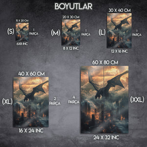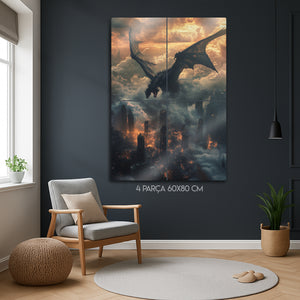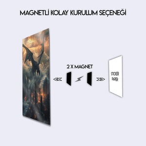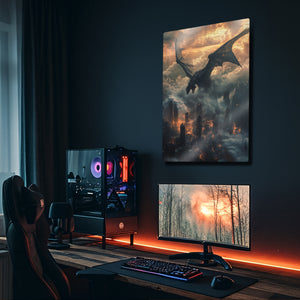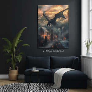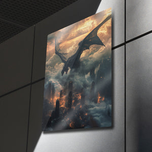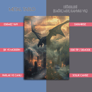 Güç, kaos ve fanteziyi bir araya getiren bu metal tablo, gökyüzünden şehre ateş saçan dev bir ejderhayı büyüleyici bir şekilde tasvir ediyor. Bulutlar ve alevler içindeki dramatik atmosfer, tabloya epik bir fantezi havası katıyor. Fantastik evrenleri sevenler, oyun tutkunları ve güçlü dekor isteyenler için harika bir seçimdir. Yüksek kaliteli metal baskısı sayesinde detaylı renkleri uzun yıllar ilk günkü gibi canlı kalır.