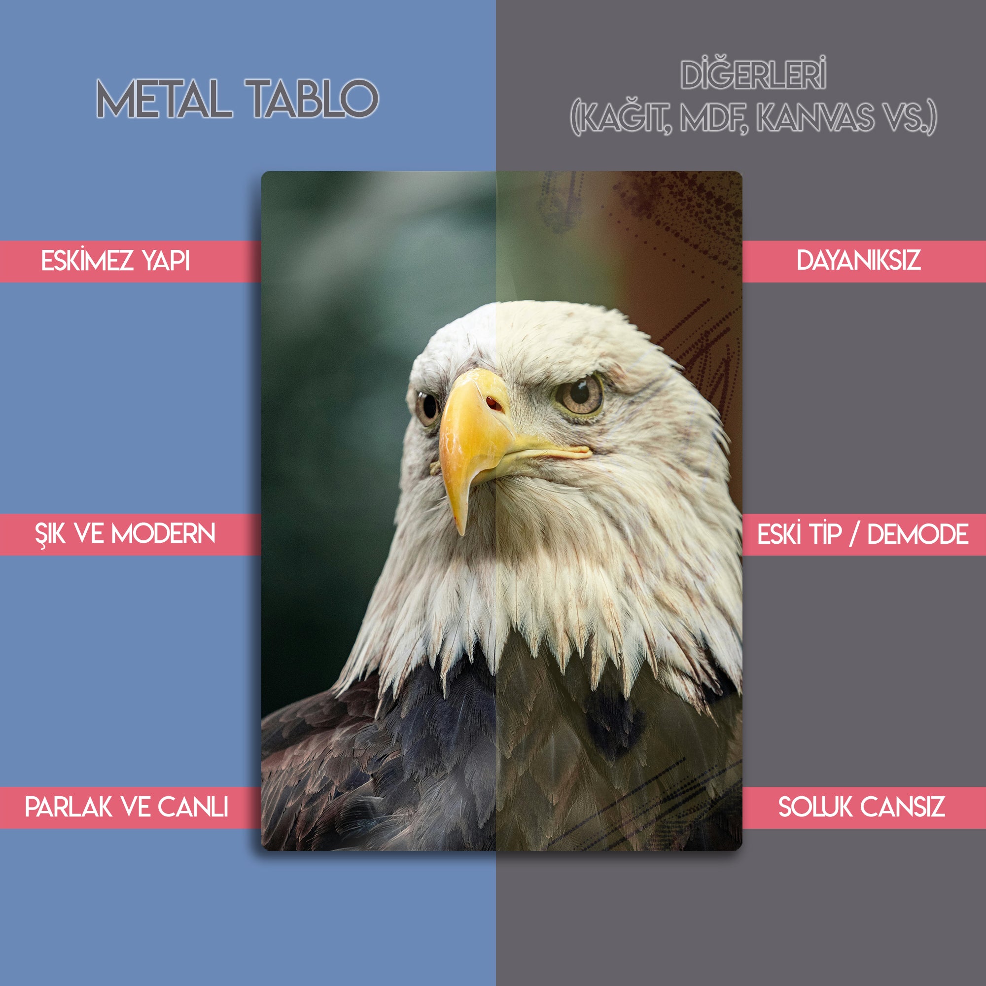 Güç, özgürlük ve asaletin simgesi olan kartalı detaylı bir şekilde yansıtan bu metal tablo, evinizin ya da ofisinizin atmosferine güçlü bir karakter katar. Dayanıklı metal yüzeyi ve yüksek kaliteli baskısıyla uzun ömürlü kullanım sunar. Doğa, vahşi yaşam ve hayvan figürlerinden hoşlananlar için ideal bir dekoratif parça ve aynı zamanda anlamlı bir hediye seçeneğidir.
