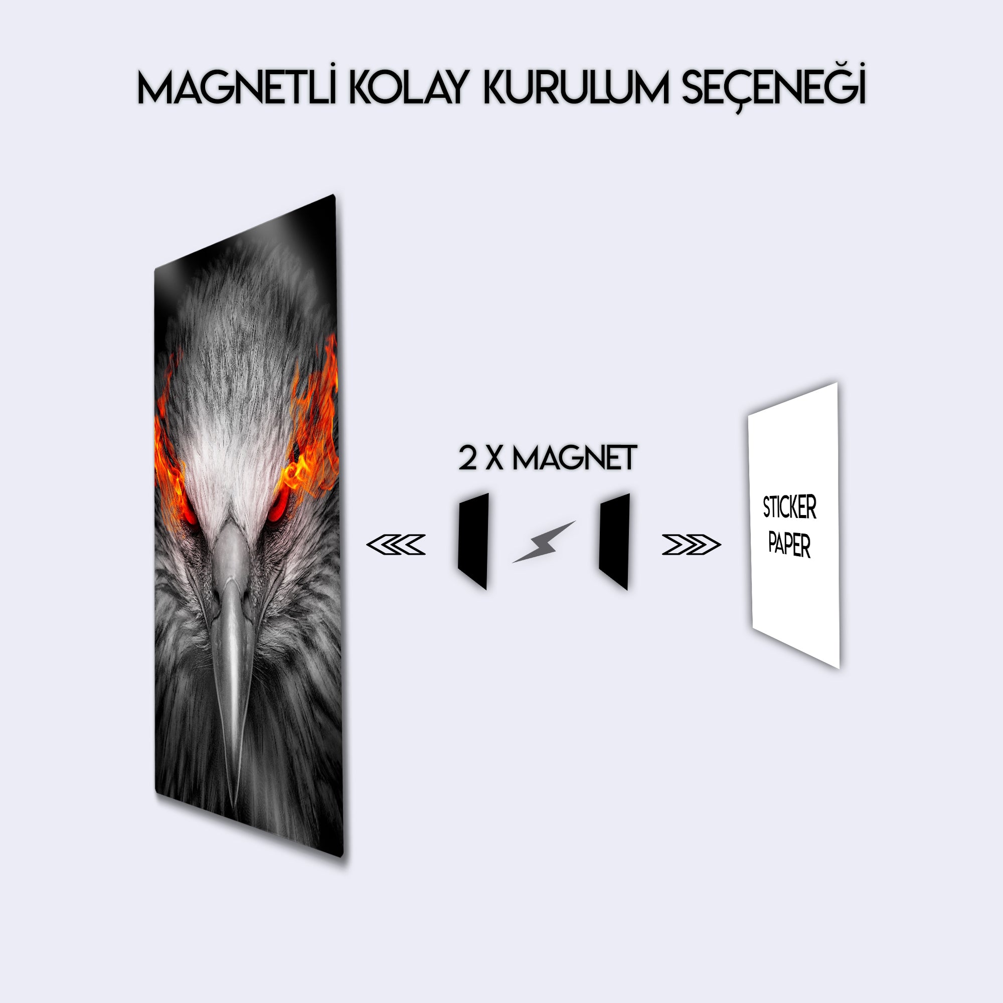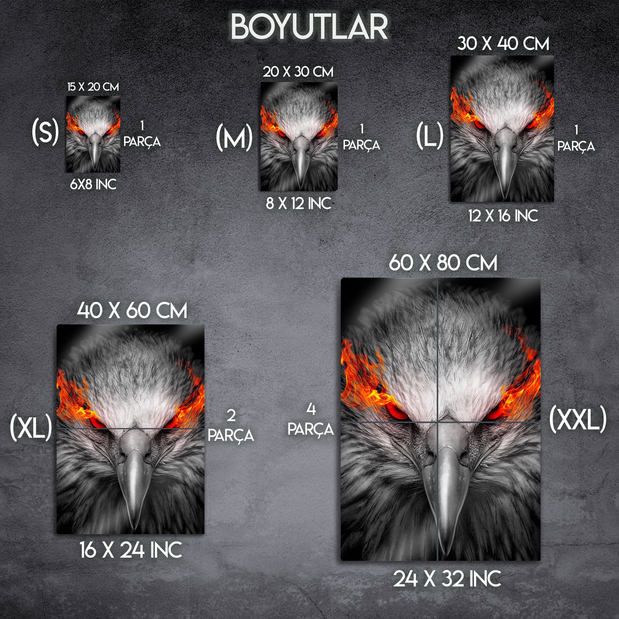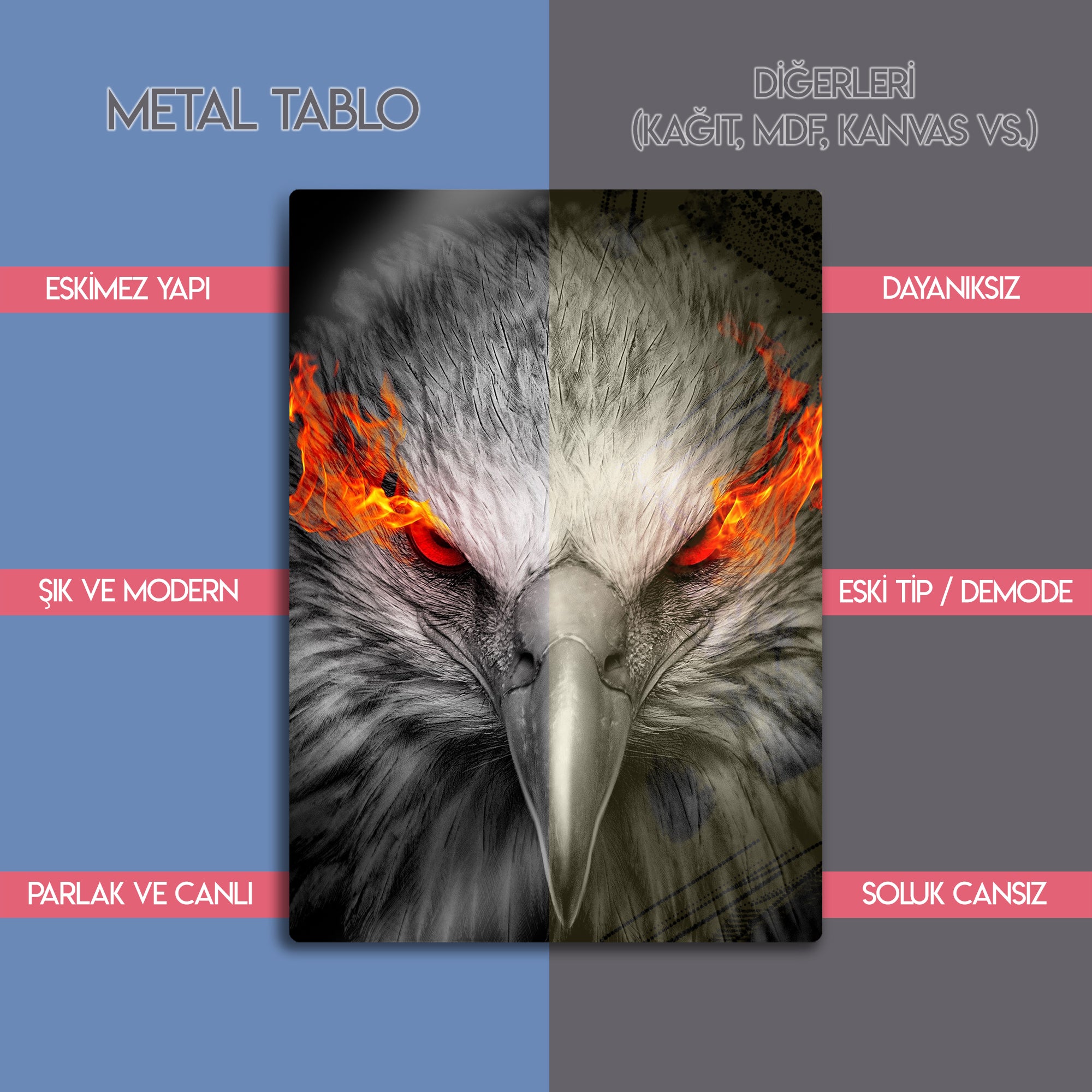 Gözlerinden yükselen alevlerle öne çıkan bu alevli kartal metal tablo, güç, özgürlük ve cesareti simgeleyen eşsiz bir tasarıma sahiptir. Siyah, gri ve kırmızı tonların kontrastıyla modern dekorasyona cesur bir dokunuş katarken, yüksek kaliteli metal yüzeyi sayesinde uzun ömürlü kullanım sunar. Evinizde ya da ofisinizde dikkat çekici bir atmosfer yaratmak isteyenler için ideal dekoratif parçadır.