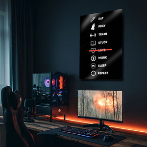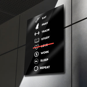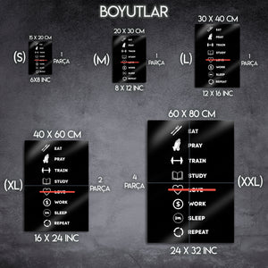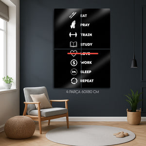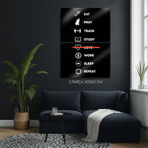 Başarıya giden yol disiplinden geçer. Bu minimalist ve güçlü metal tablo, modern dünyanın başarıya odaklı günlük rutinini ikonik bir tasarımla duvarlarınıza taşıyor: Ye, Dua Et, Antrenman Yap, Çalış, Uyu, Tekrarla. "Aşk" kelimesinin üzerindeki çarpı ise, hedeflere ulaşma yolunda yapılan fedakarlıklara ve odaklanmanın önemine dair cesur ve ironik bir vurgu yapıyor.