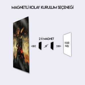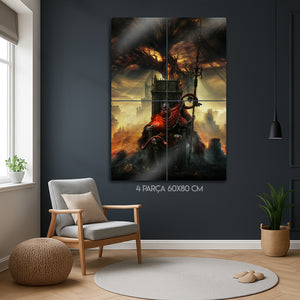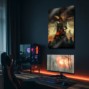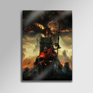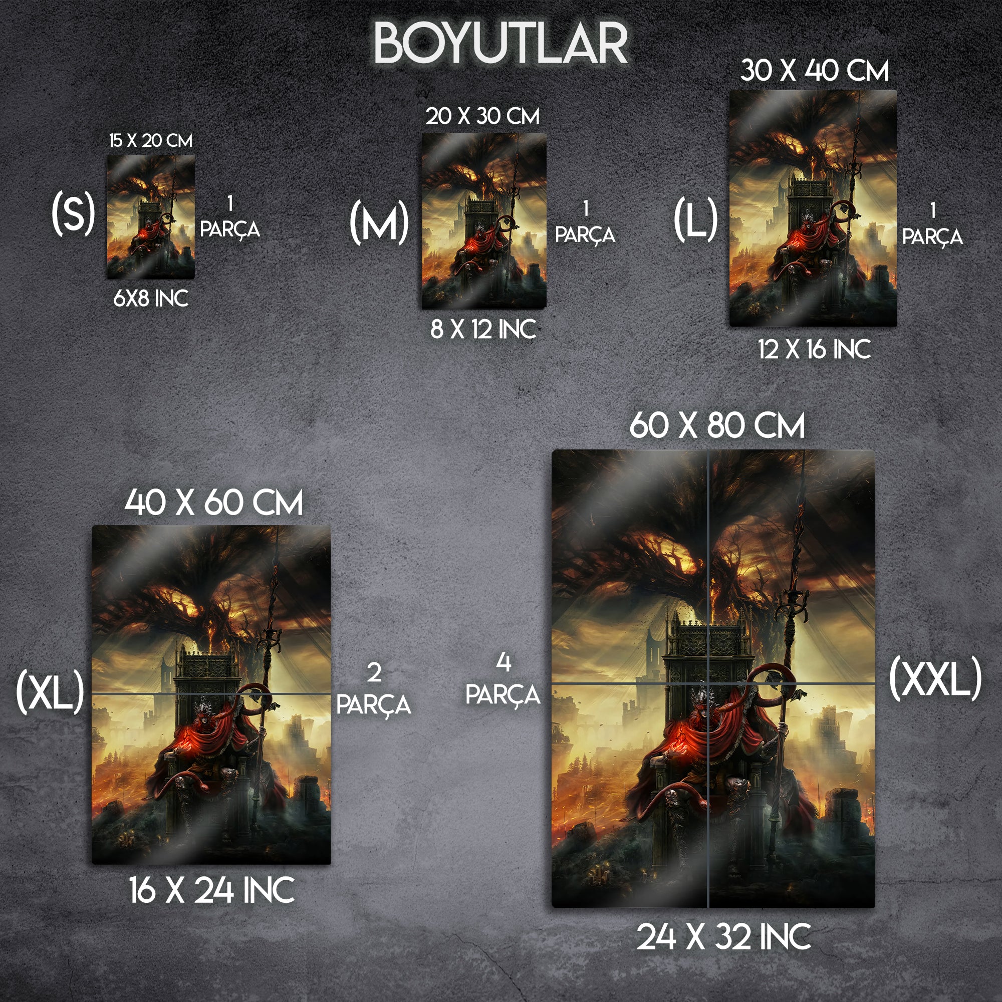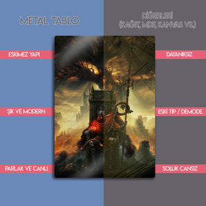 Elden Ring’in karanlık dünyasını evinize taşıyın! Bu özel metal tablo, oyunun ikonik atmosferini yansıtarak sizi Lands Between’in büyüleyici hikâyesine davet ediyor. Tahtta oturan görkemli figür, tıpkı oyunda karşılaştığımız Godfrey, Malenia, General Radahn, Ranni the Witch ve Melina gibi unutulmaz karakterlerin gücünü ve gizemini hatırlatıyor.