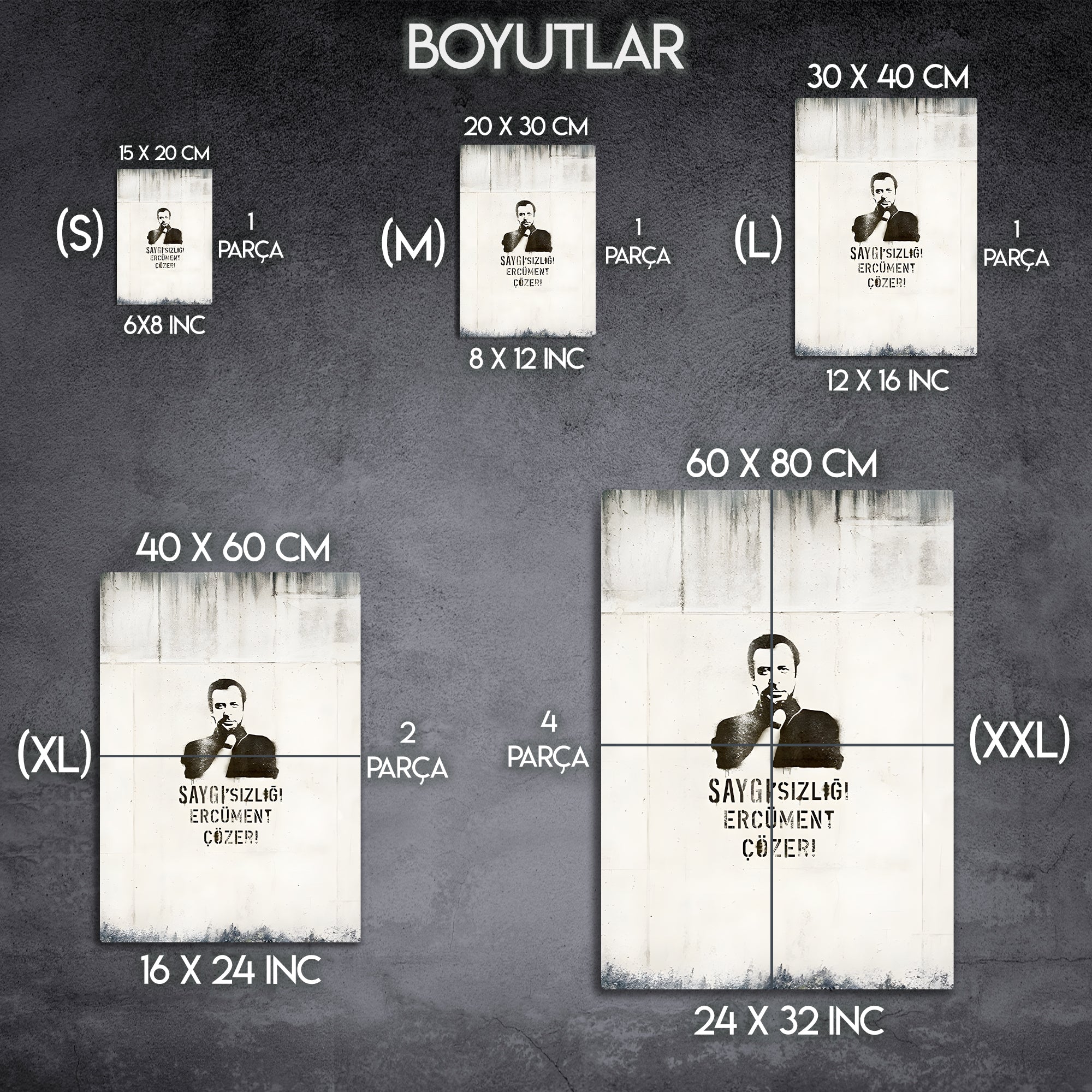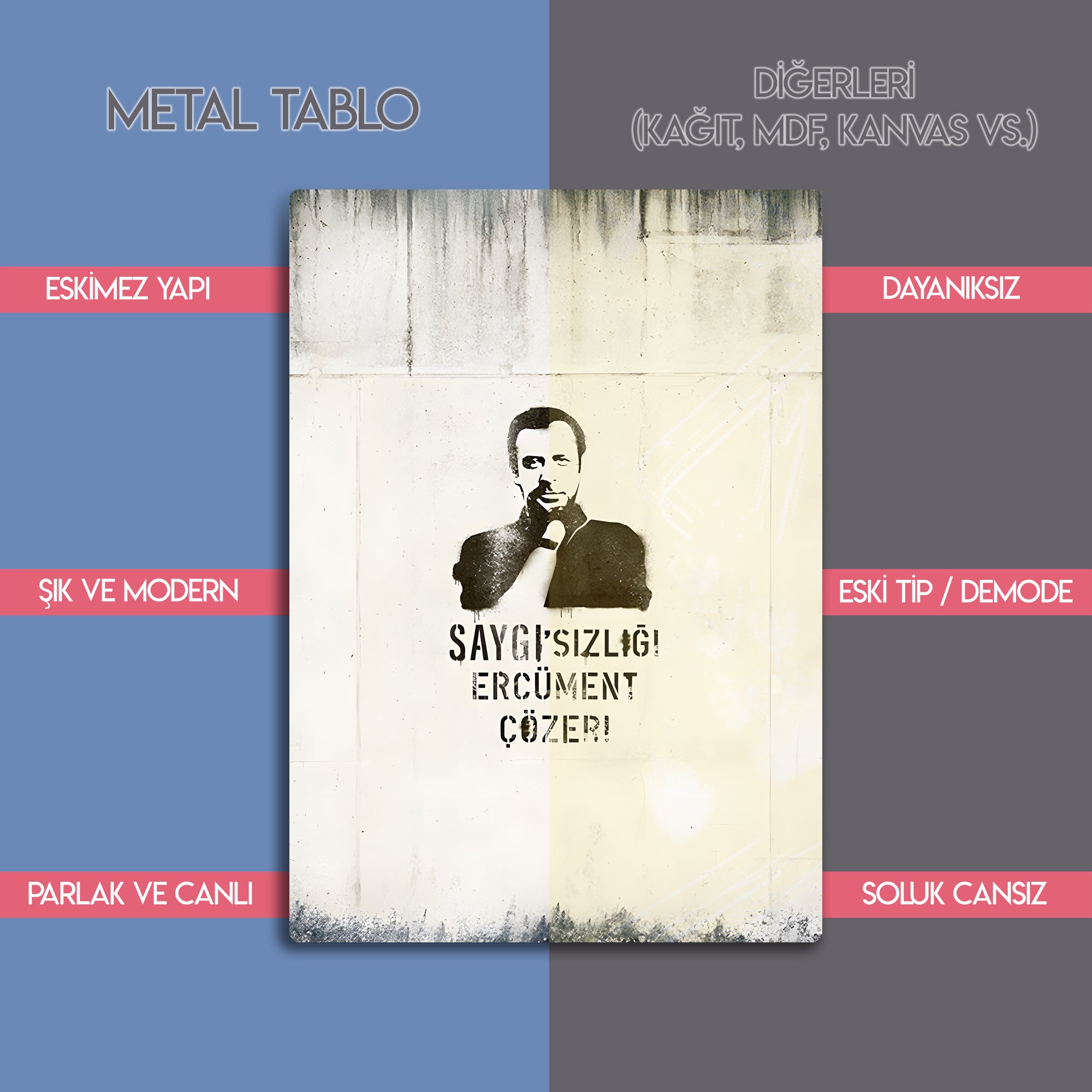 Popüler kültürün unutulmaz karakterlerinden Ercüment Çözer’in ikonik sözü “Saygısızlığı Ercüment Çözer” ile hazırlanan bu özel metal tablo, duvarlarınıza sıra dışı bir hava katıyor. Minimalist tasarımı ve güçlü mesajıyla hem mizahi hem de stil sahibi bir dekoratif obje arayanlar için ideal bir seçimdir. Modern ev dekorasyonu, ofis alanları veya hediye alternatifi olarak öne çıkar.