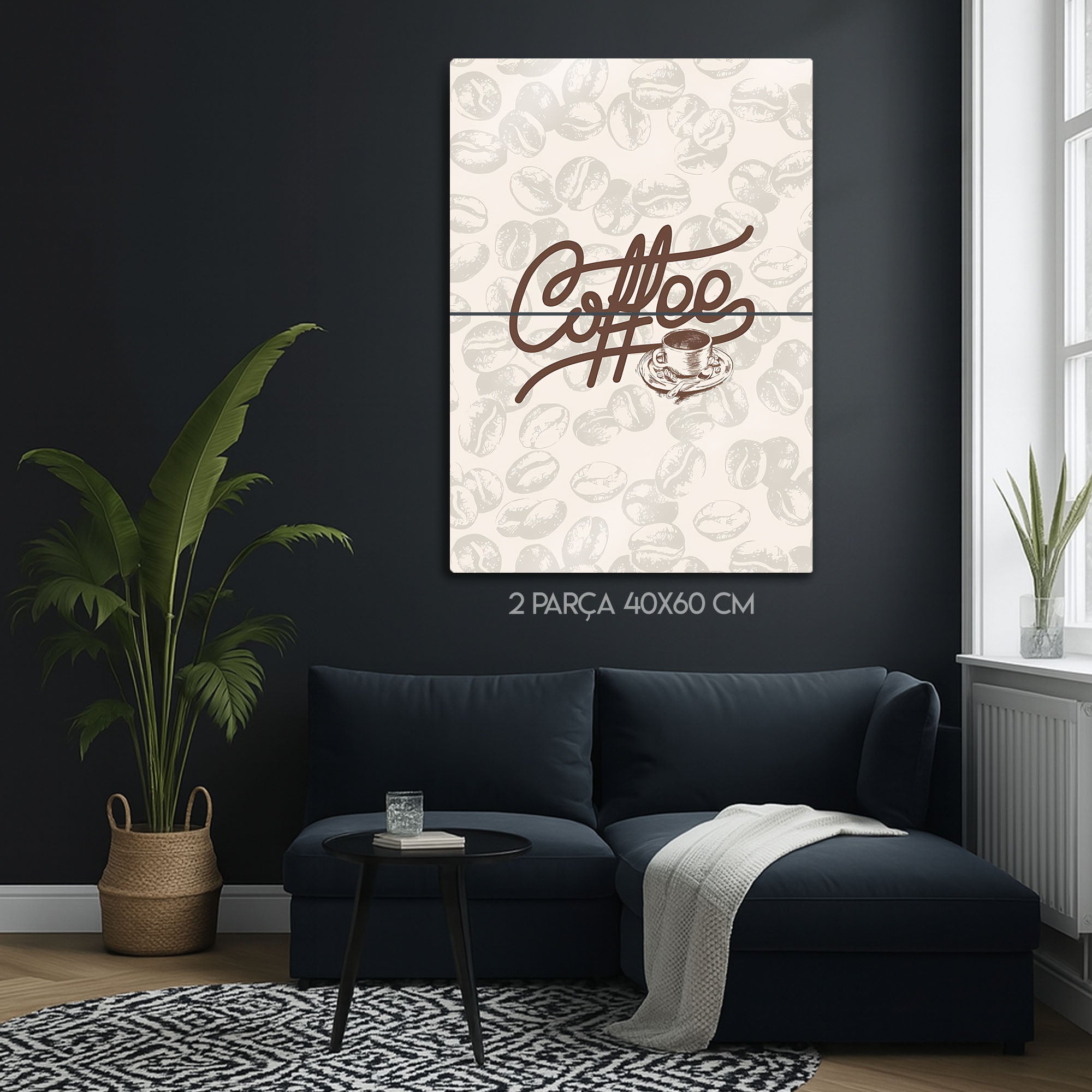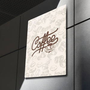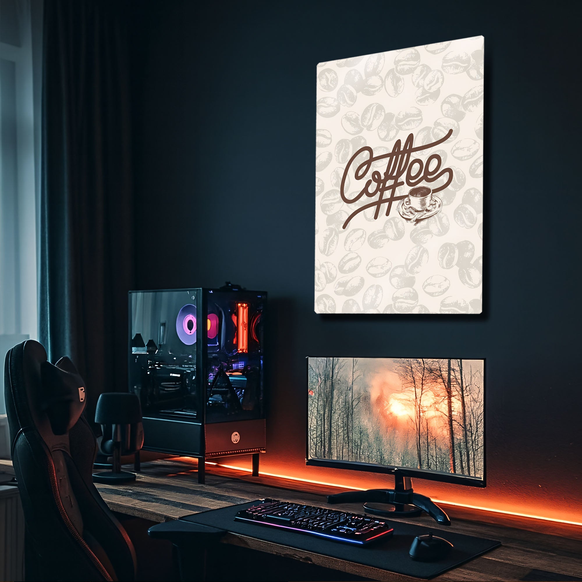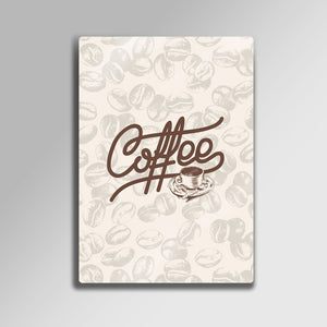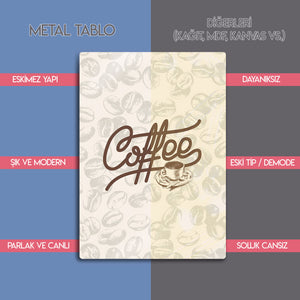 Kahvenin sadeliğini ve sanatın zarafetini duvarlarınızda birleştirin. Bu minimalist metal tablo, şık "Coffee" kaligrafisini, detaylı bir fincan eskizini ve arka planda yer alan soft kahve çekirdeği desenini bir araya getirerek sofistike bir tasarım sunuyor.