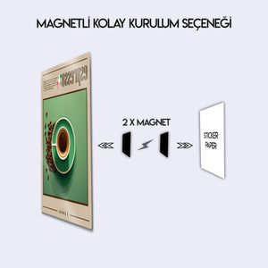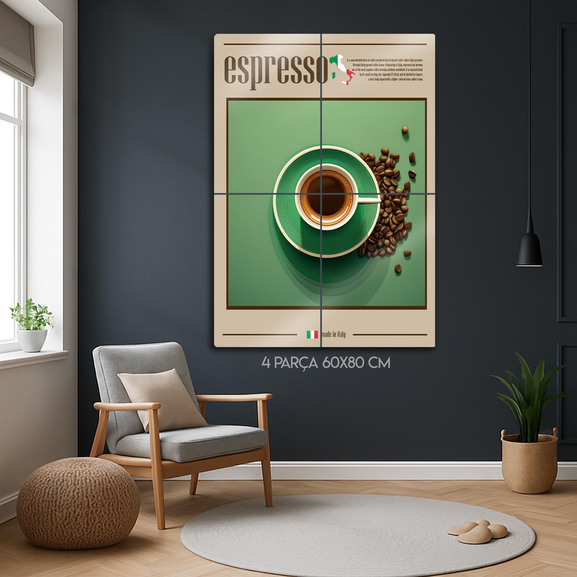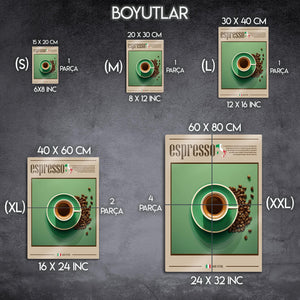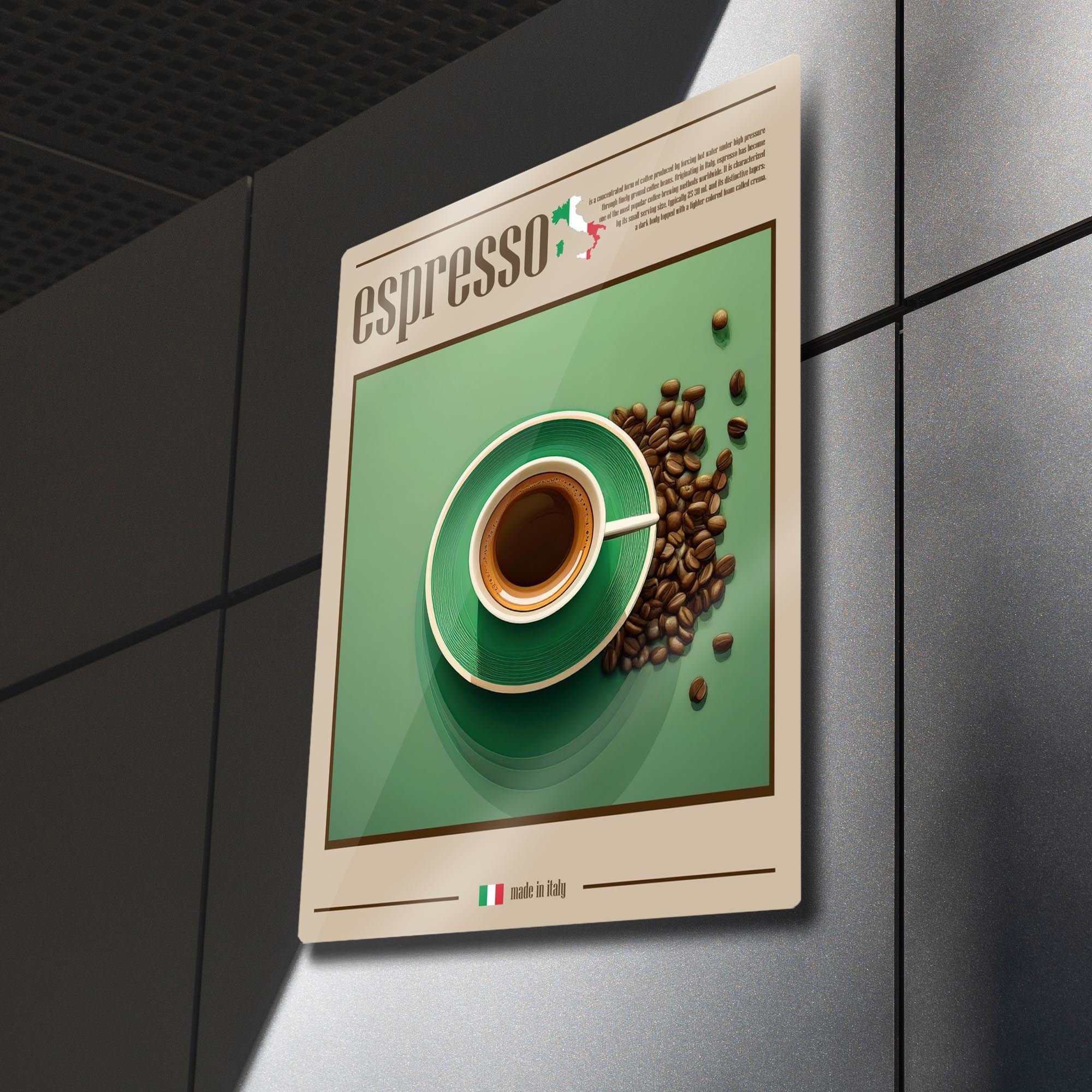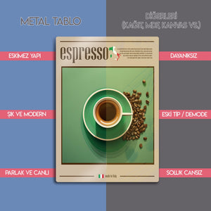 Yeşil fincanın ve taze kahve çekirdeklerinin canlı görüntüsü, bu metal tabloyu mutfağınızın, kahve köşenizin, ofisinizin veya işletmenizin (kafe, restoran) atmosferini zenginleştirmek için mükemmel bir parça haline getiriyor. Hem bilgilendirici hem de son derece dekoratif olan bu tablo, mekanınıza sofistike bir İtalyan dokunuşu katacaktır.