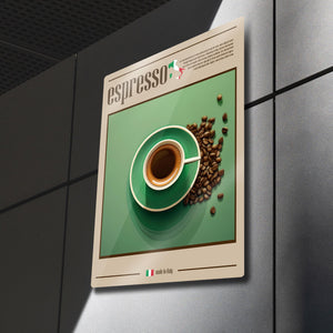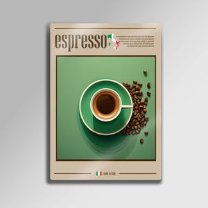 İtalyan kahve sanatının özü Espresso'nun zarafetini ve lezzetini duvarlarınıza taşıyın! Vintage bir poster estetiğiyle tasarlanan bu metal tablo, Espresso'nun kökenini ve özelliklerini anlatan şık bir tasarıma sahiptir. "Made in Italy" vurgusu ve ikonik İtalya haritası detayı ile bu eser, kahveye olan tutkunuzu sanatsal bir şekilde ifade etmenizi sağlar.