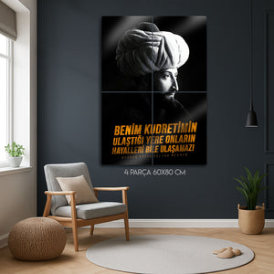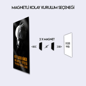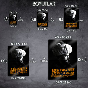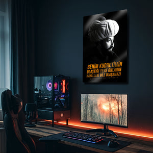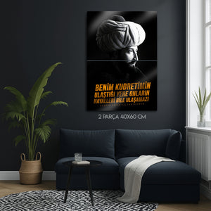 “Benim kudretimin ulaştığı yere onların hayalleri bile ulaşamaz!” sözüyle güç ve kararlılığı yansıtan bu özel Fatih Sultan Mehmet metal tablo, tarihten ilham alan dekoratif bir parçadır. Osmanlı İmparatorluğu’nun büyük lideri Fatih Sultan Mehmet’i ve onun vizyonunu evinize veya ofisinize taşıyarak tarihi bir atmosfer yaratabilirsiniz. Güçlü mesajı ve zarif tasarımıyla bu tablo, hem tarih tutkunları hem de anlamlı dekor arayanlar için ideal bir seçimdir.