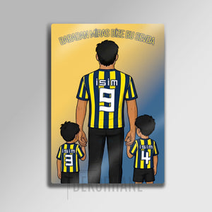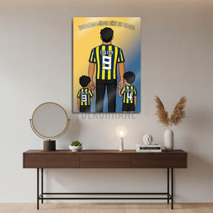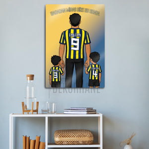 Tablo üzerindeki "isim" alanlarına, hem babanın hem de iki çocuğun formasına dilediğiniz isimleri ve sizin için anlamlı olan numaraları yazdırarak bu tasarımı tamamen kendinize özel hale getirebilirsiniz. Bu kişiselleştirme, tabloyu sadece size ait kılmakla kalmaz, aynı zamanda onu paha biçilmez bir hediye seçeneğine dönüştürür.