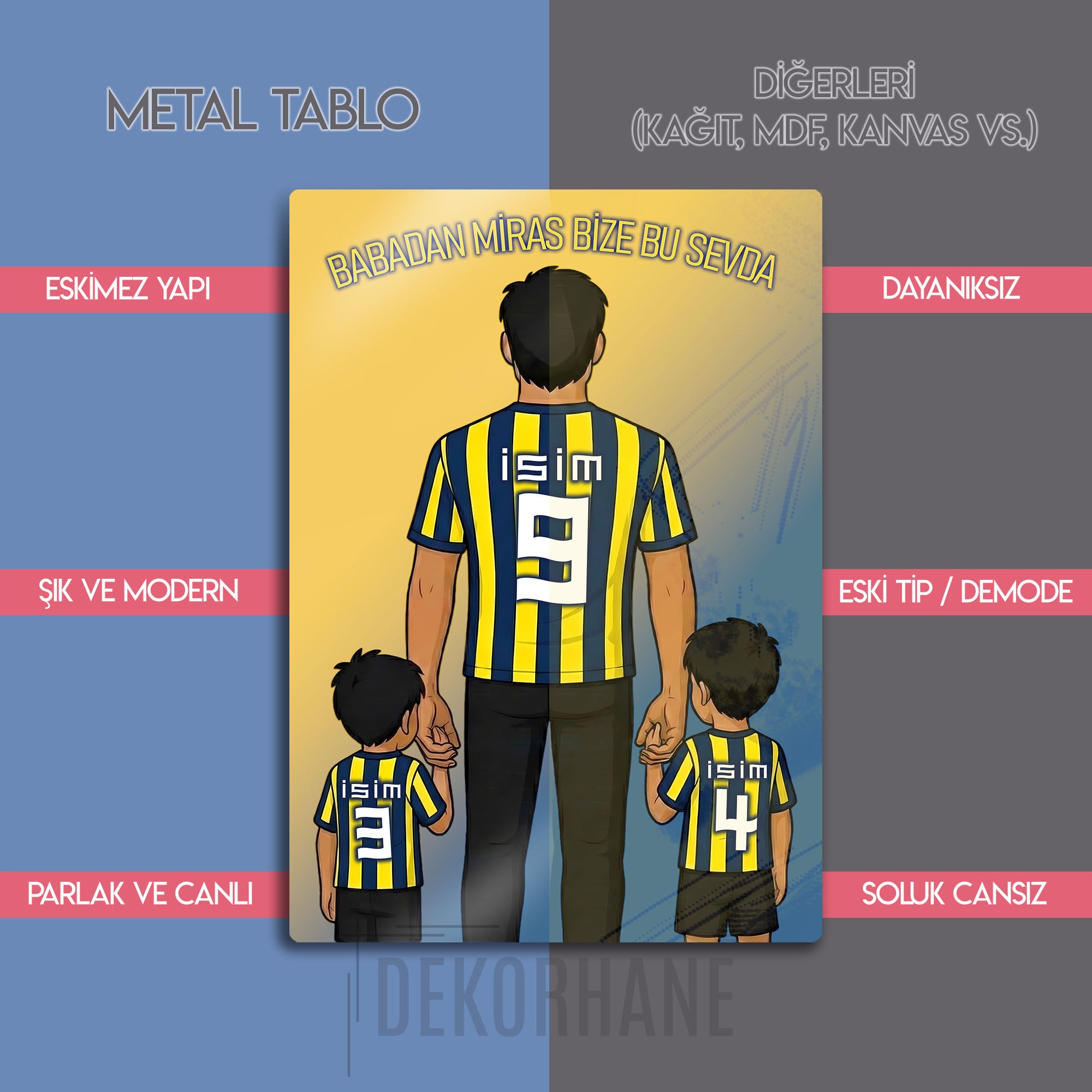Hemen sipariş verin, Sarı-Lacivert renklere olan aşkınızı ve ailenizin o sarsılmaz bağını Dekorhane.com kalitesiyle duvarlarınızda ölümsüzleştirin!