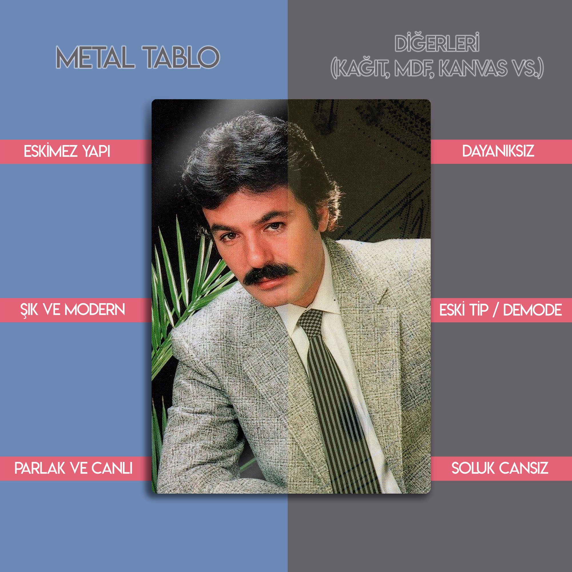 Zamansız bir nostaljiyi yansıtan bu retro portre metal tablo, Türk müzik ve sanat tarihinin en özel dönemlerini hatırlatıyor. 70’ler ve 80’lerin ruhunu evinize taşıyan bu tasarım, sadece bir dekor değil, aynı zamanda kültürel bir hatıradır.