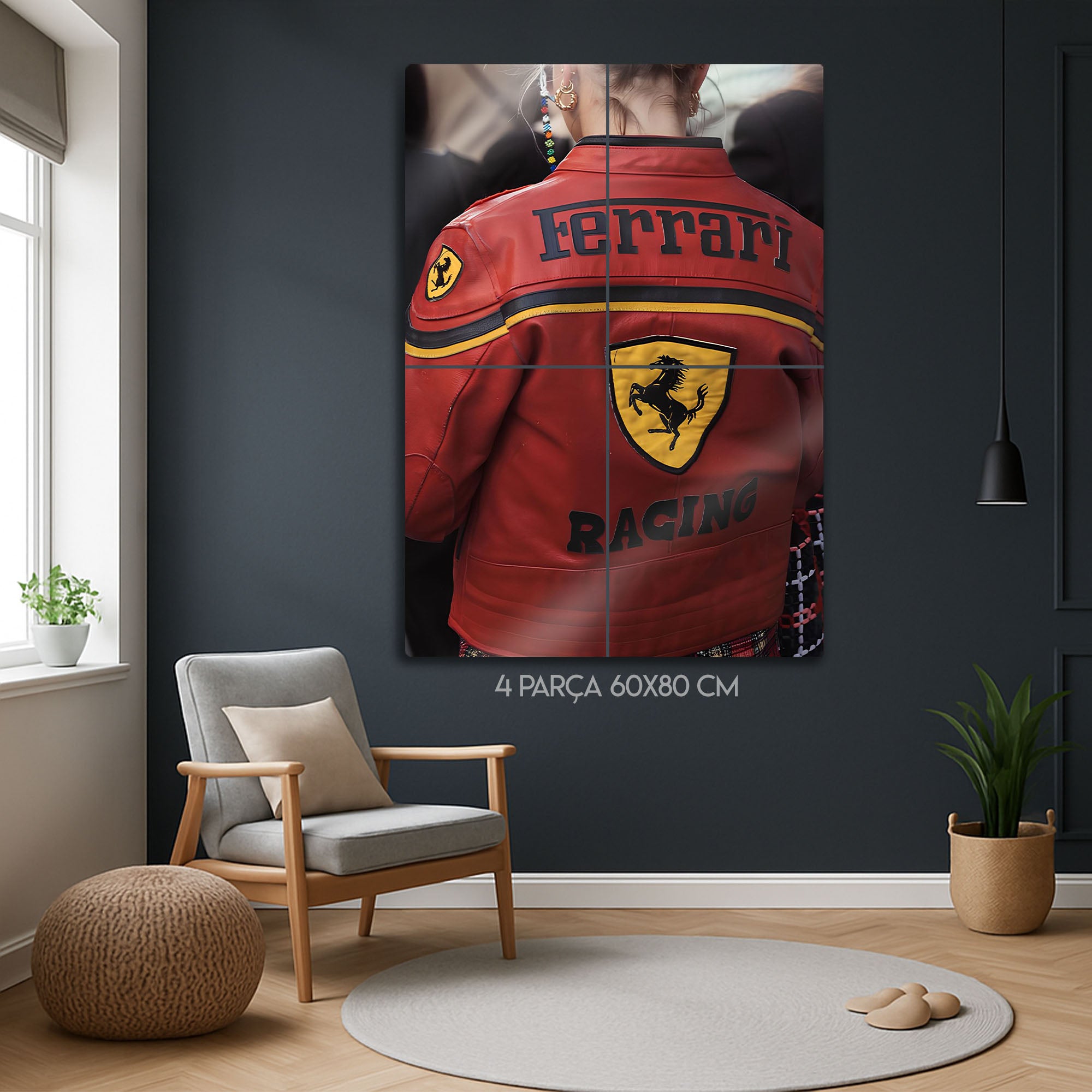 Motor sporları tutkunları için özel olarak tasarlanmış bu Ferrari Racing temalı metal tablo, hız, güç ve tutkunun simgesini duvarlarınıza taşıyor. Kırmızı Ferrari ceketi ve ikonik at logosu ile tasarlanan bu poster, Formula 1 ve yarış otomobili hayranları için mükemmel bir dekoratif parçadır.